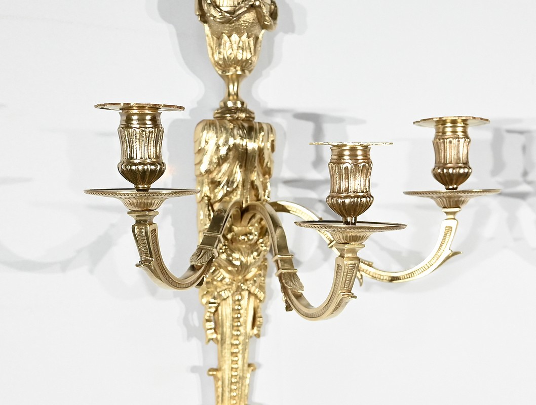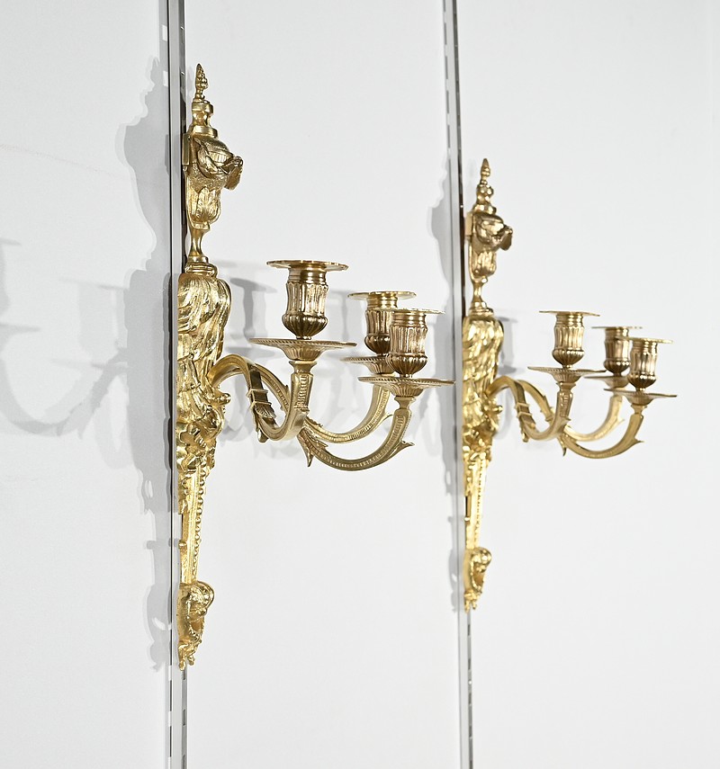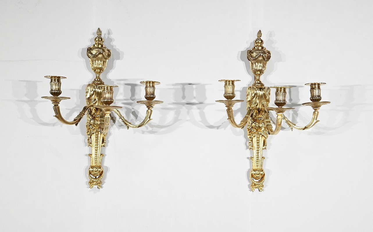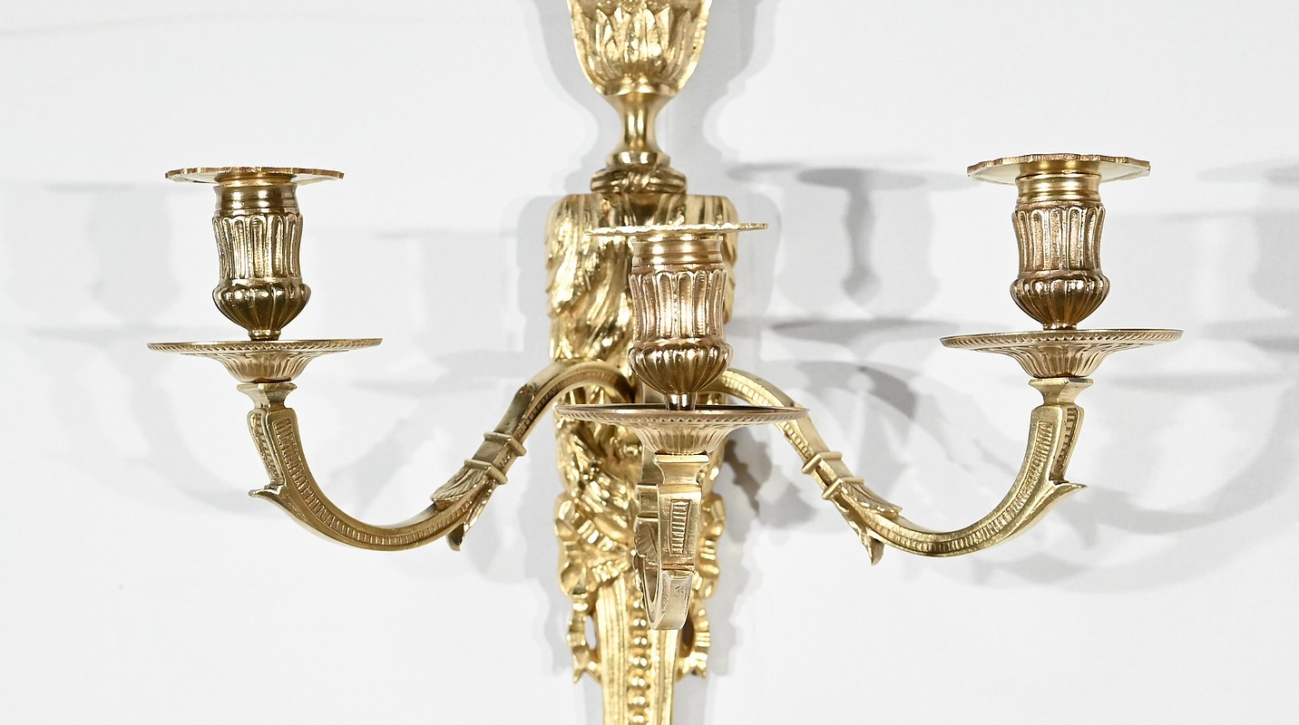 Bel ensemble d’appliques en bronze doré à trois bras de lumières possédant des ornementations de style Louis XVI.