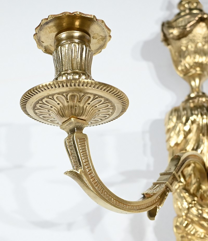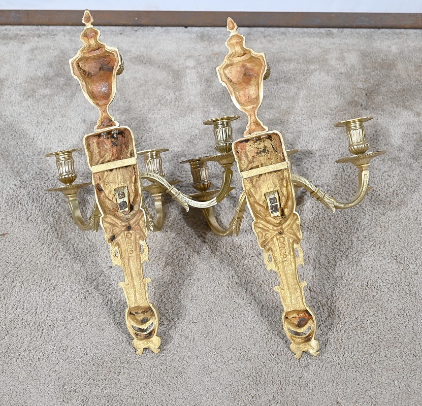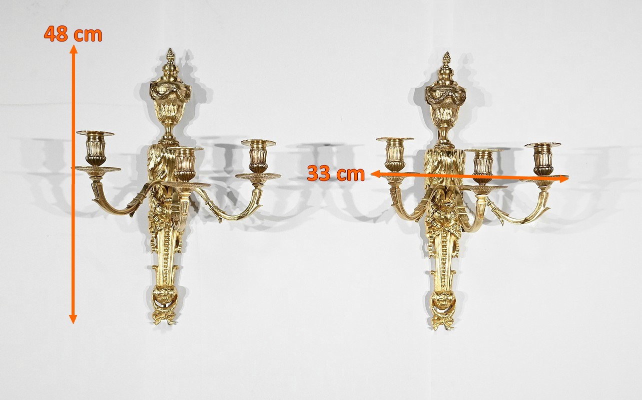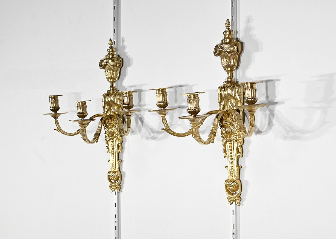 Bel ensemble d’appliques en bronze doré à trois bras de lumières possédant des ornementations de style Louis XVI.