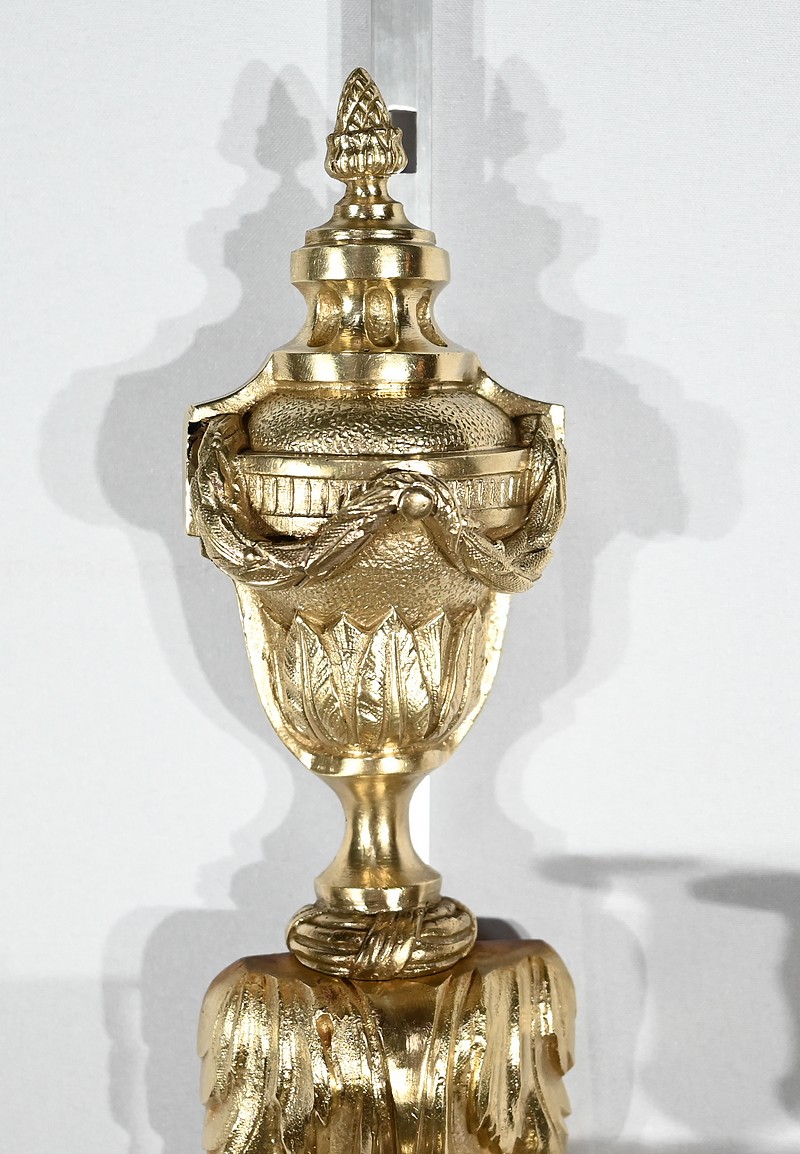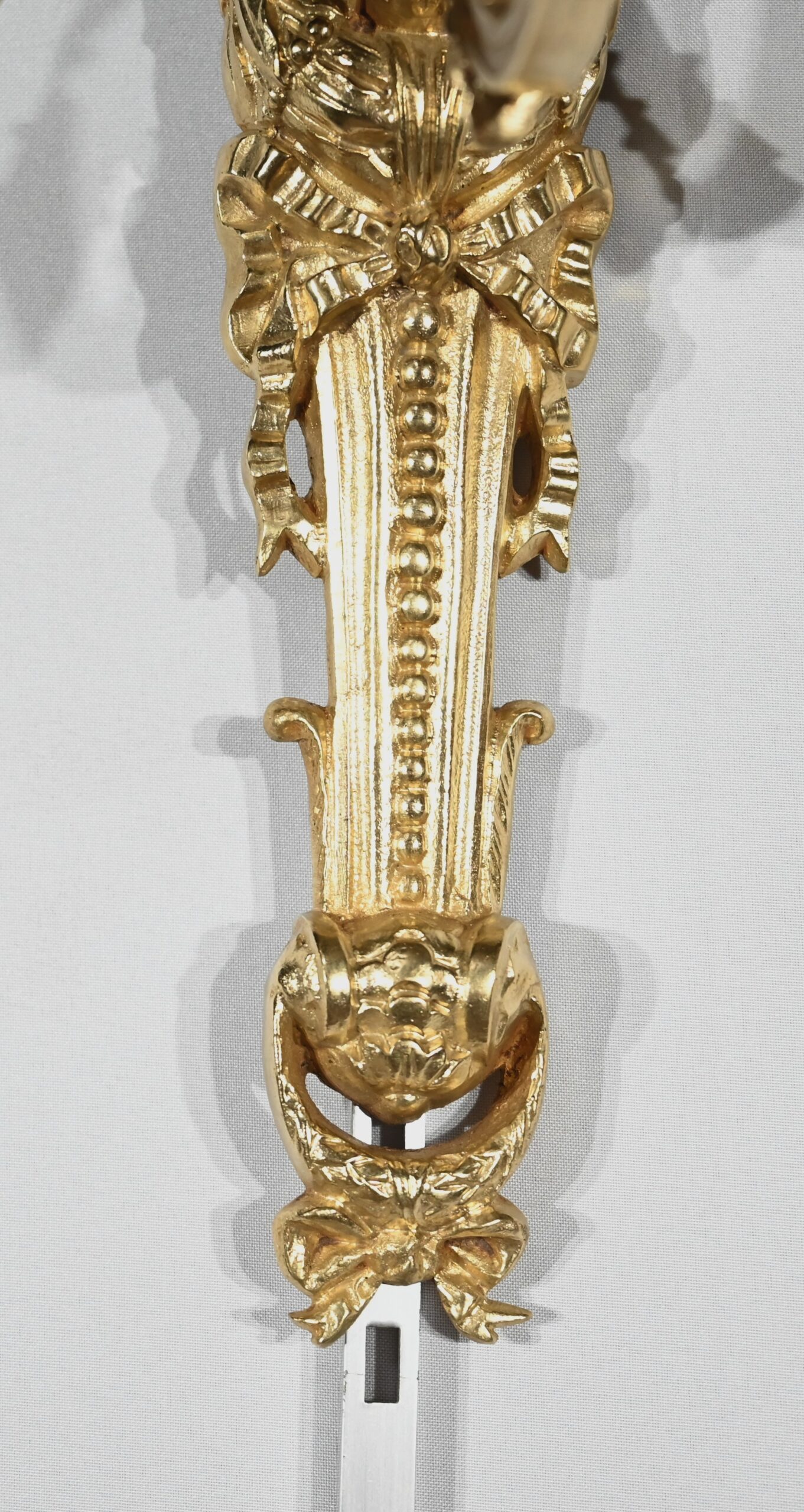 Ces appliques sont munies d’une partie murale dotée en partie haute d’une urne entourée d’une épaisse guirlande de feuillages et surmontée d’une pomme de pin. Cette urne repose sur une superposition de feuilles d’acanthe. Dessous, un nœud de ruban est accompagné d’une guirlande de perle s’enroulant dans une volute en partie basse. Un dernier petit nœud fini d’orner cette applique.