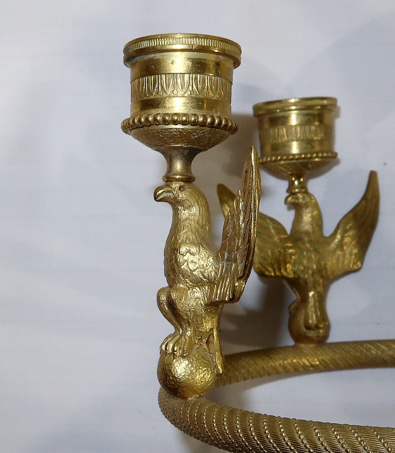 Chaque porte-bougie est constitué d’un aigle impérial se tenant ailes déployées sur un œuf. Les aigles soutiennent les bobèches sur leur tête.