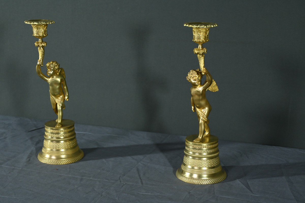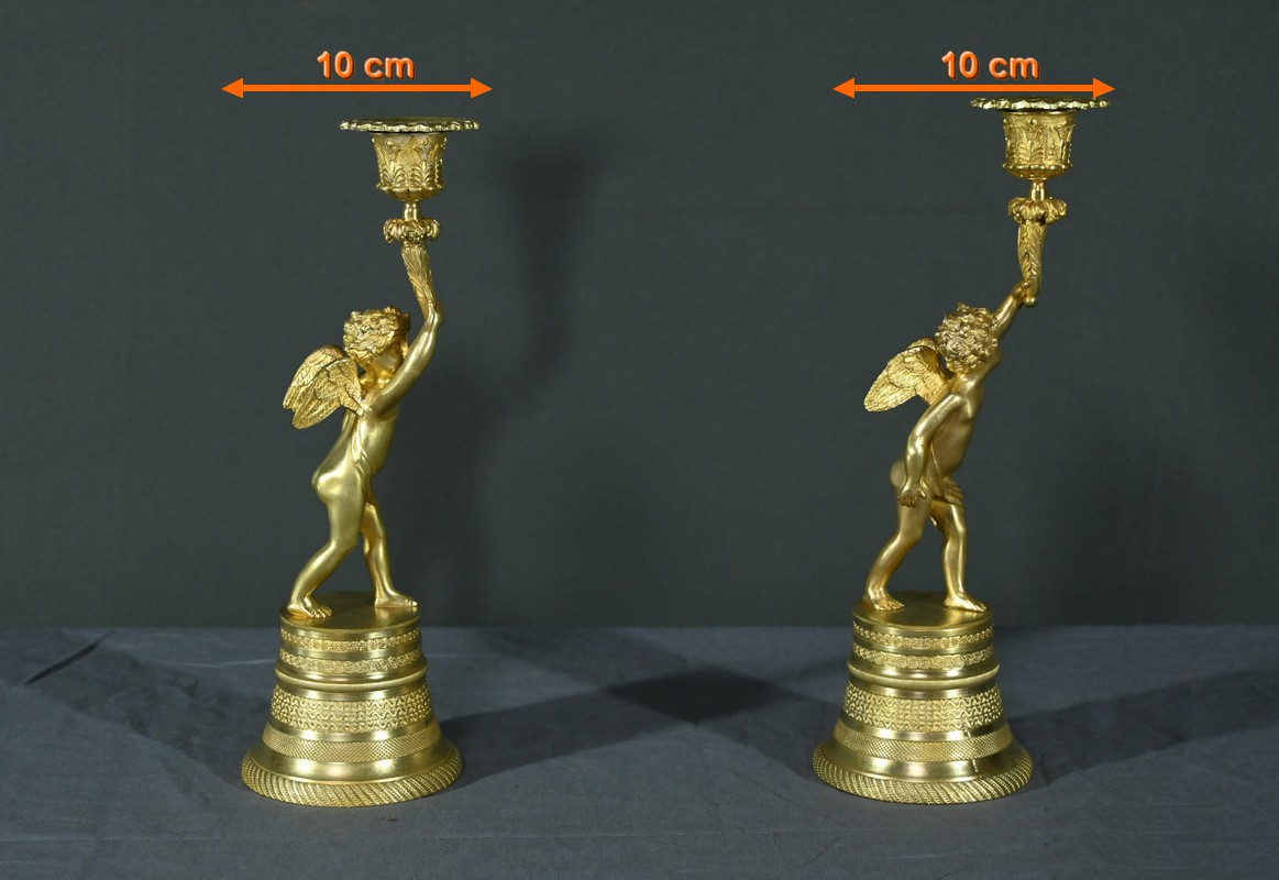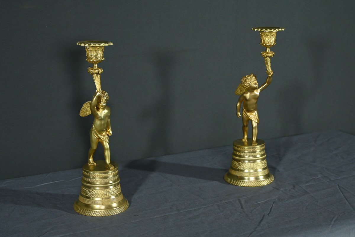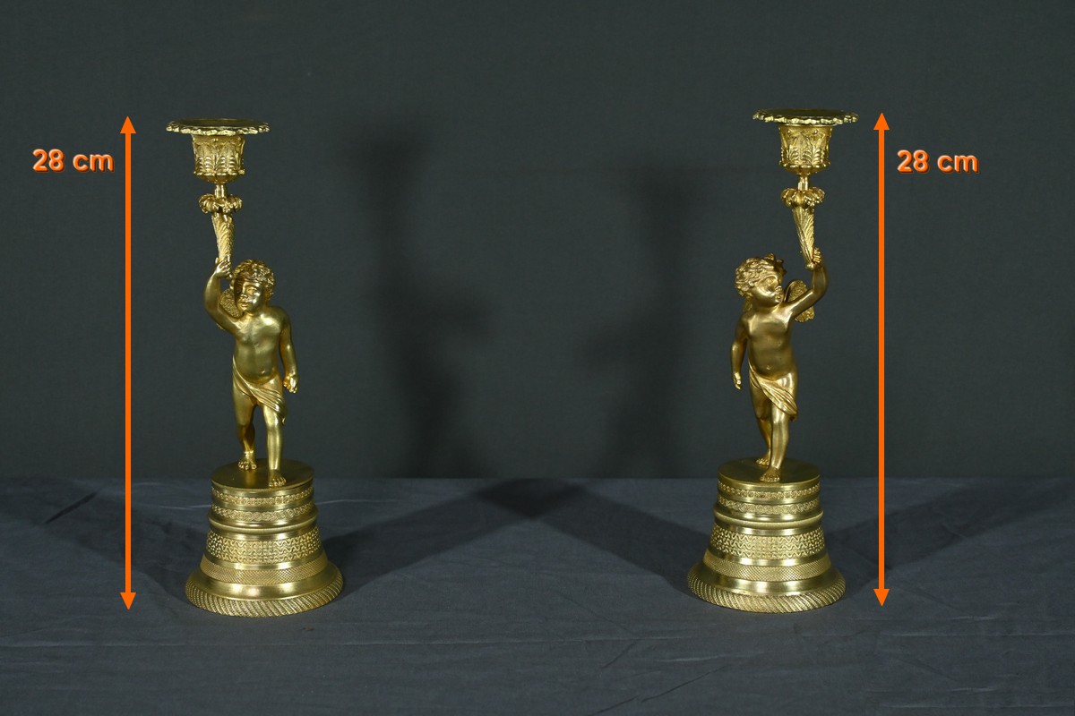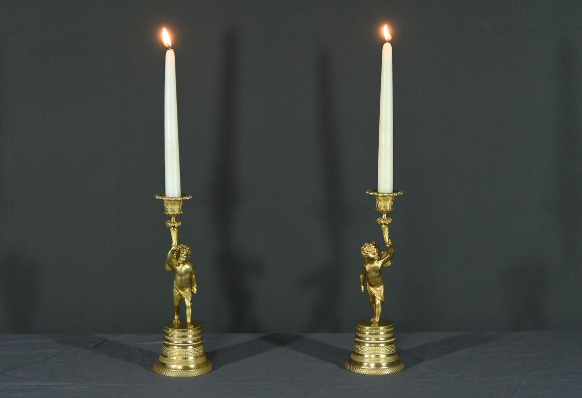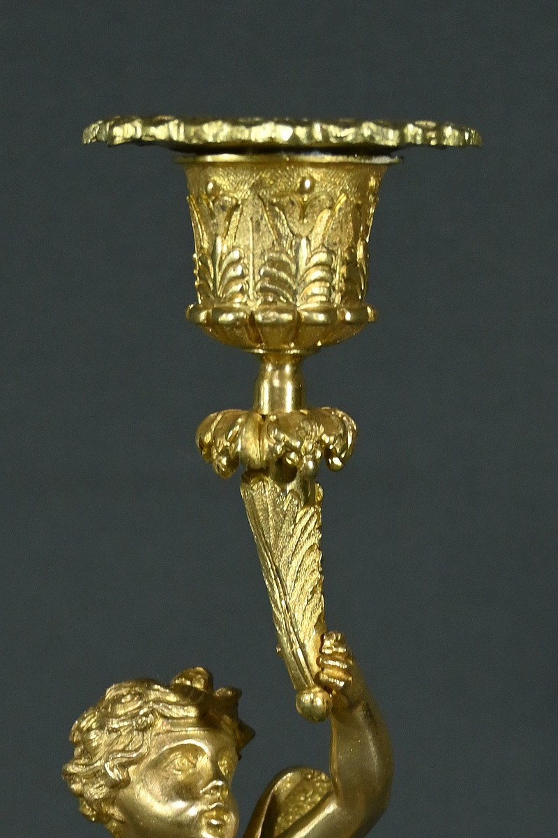 Chaque bougeoir représente un chérubin, l’un tenant au-dessus de sa tête une corne de feuilles d’acanthe de la main droite, et l’autre de la main gauche.