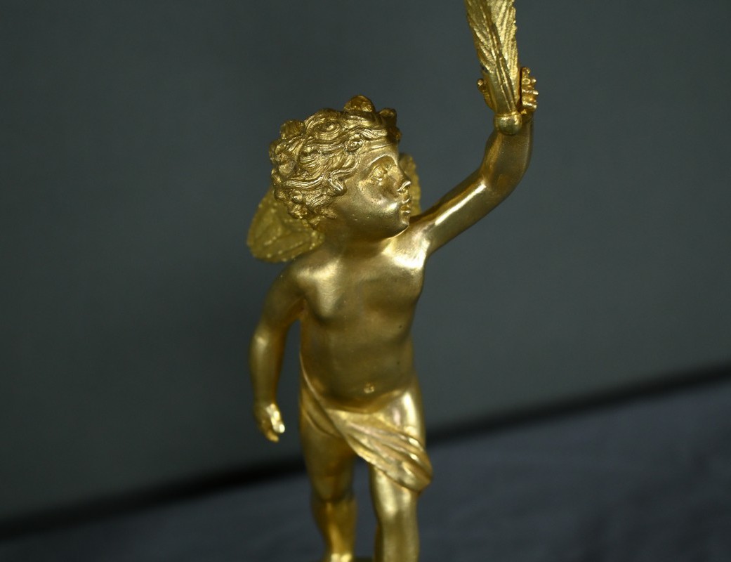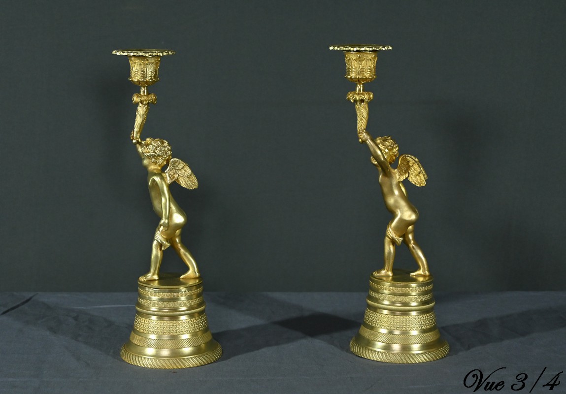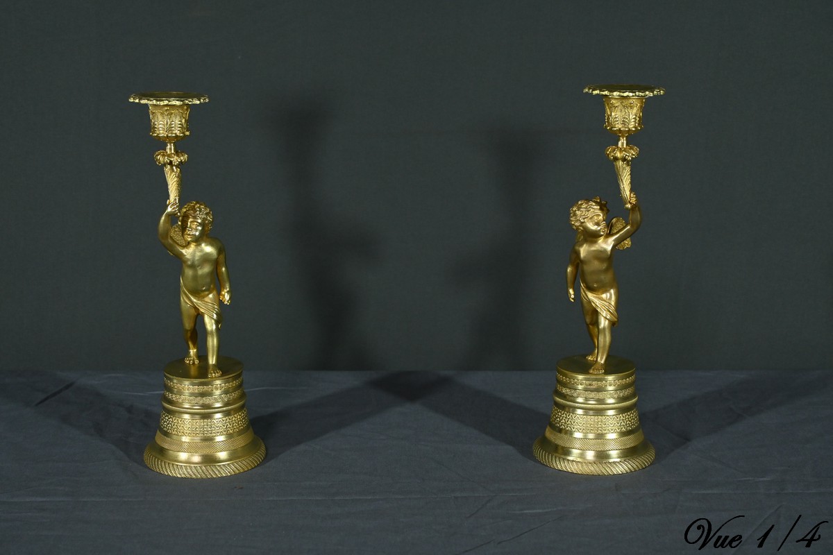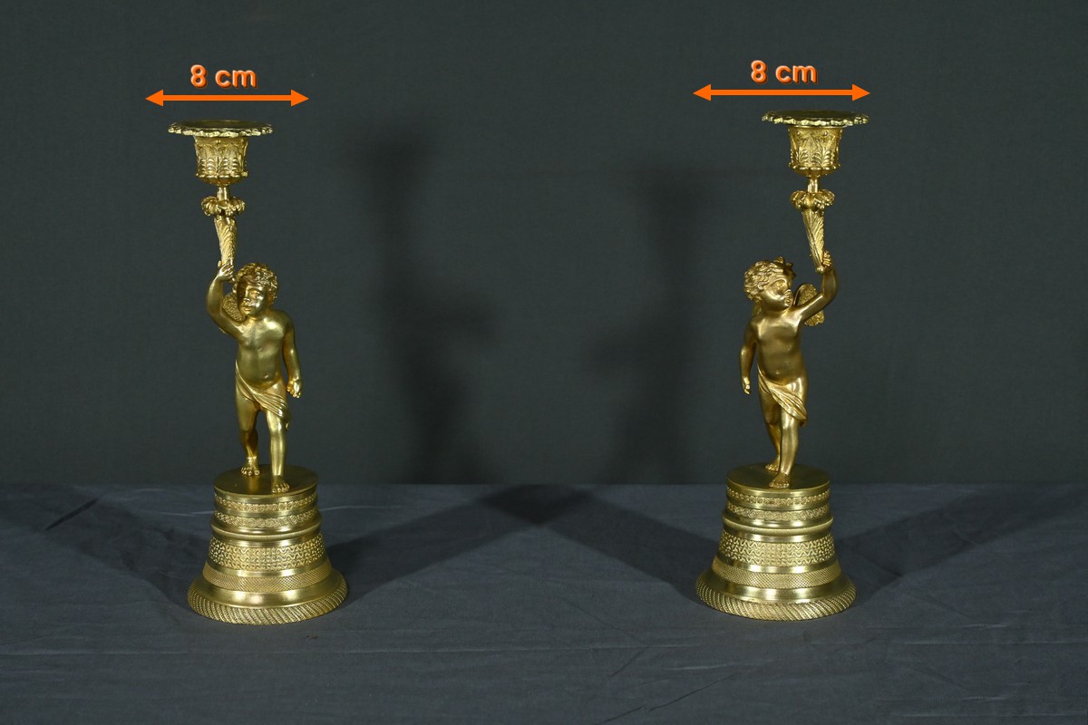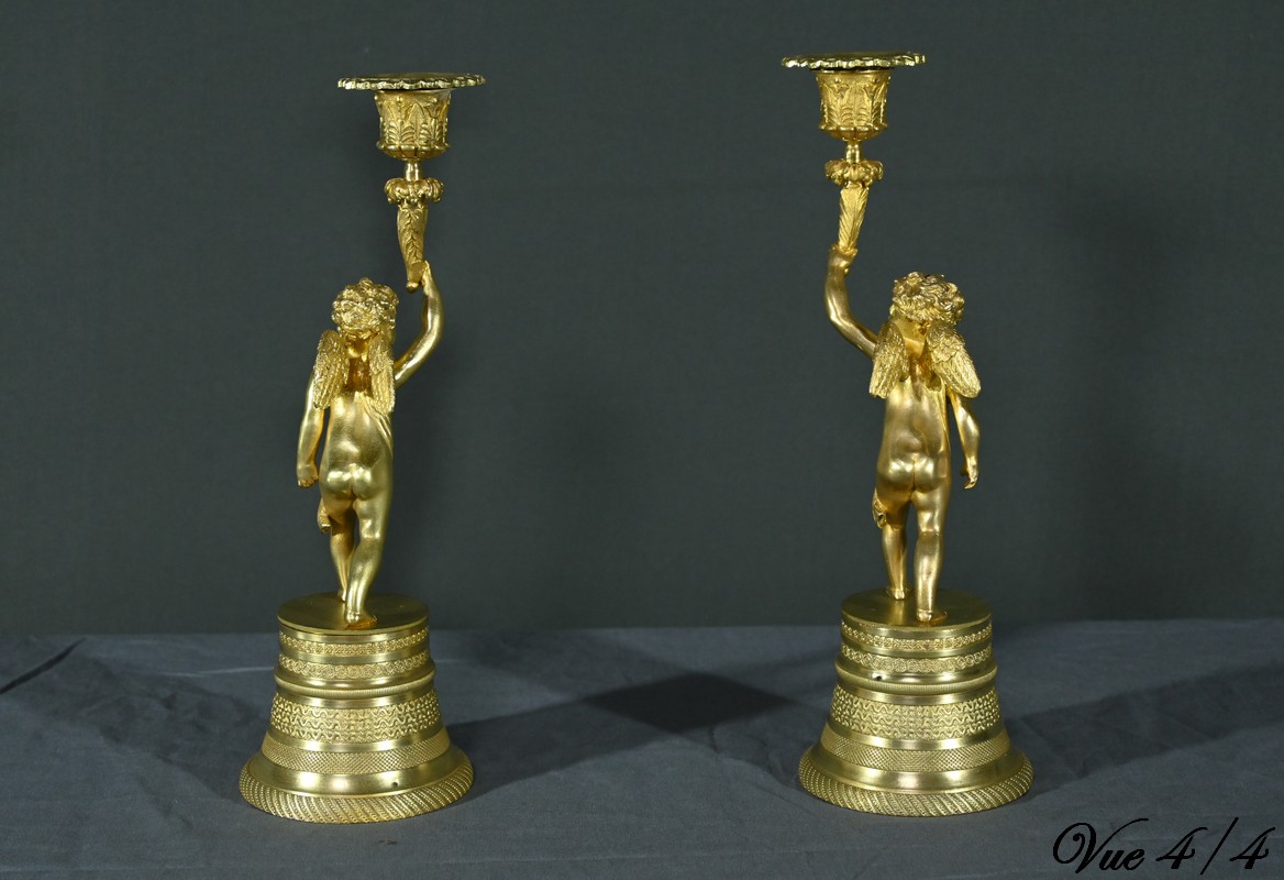 Chaque bougeoir représente un chérubin, l’un tenant au-dessus de sa tête une corne de feuilles d’acanthe de la main droite, et l’autre de la main gauche.