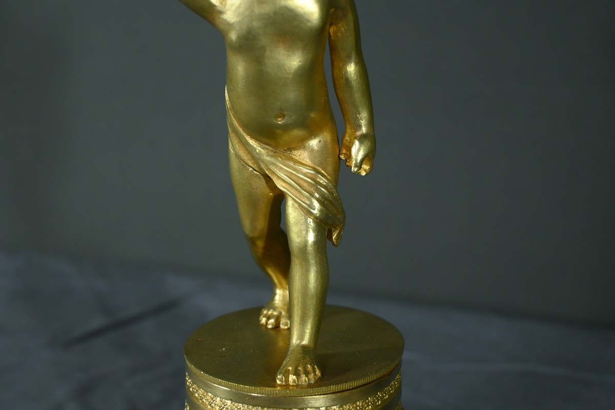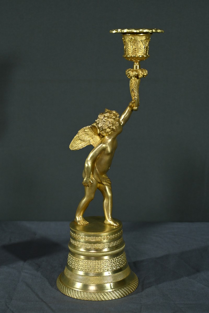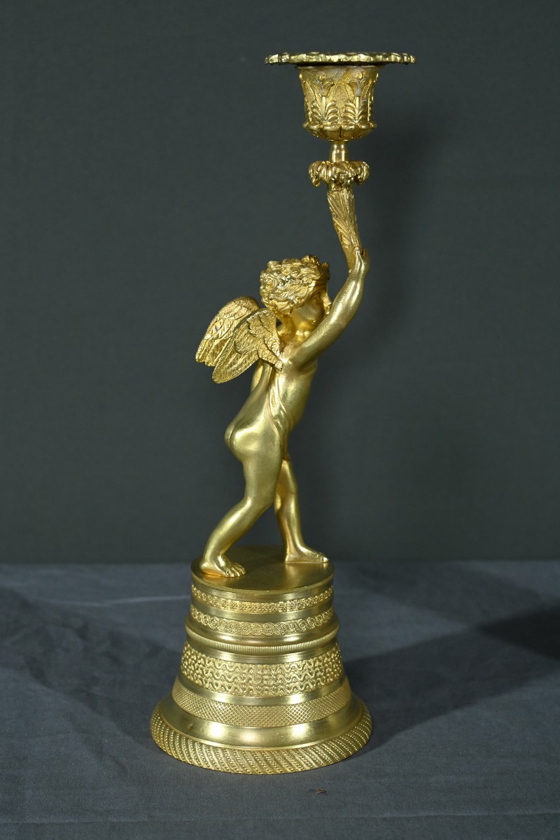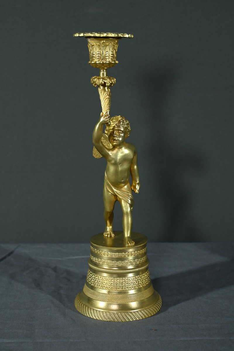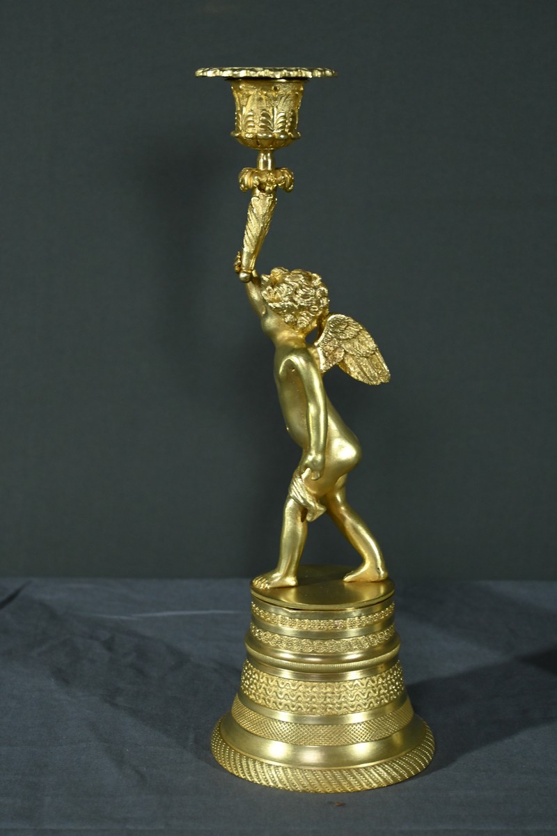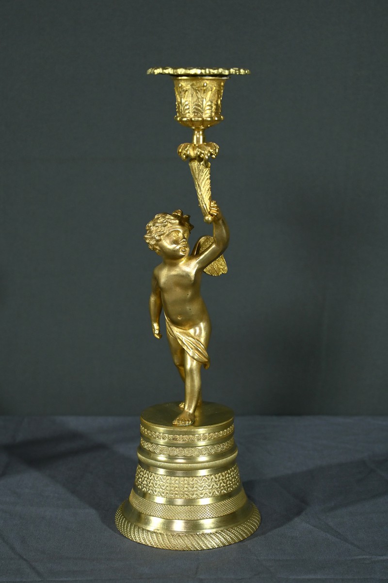 Chaque bougeoir représente un chérubin, l’un tenant au-dessus de sa tête une corne de feuilles d’acanthe de la main droite, et l’autre de la main gauche.