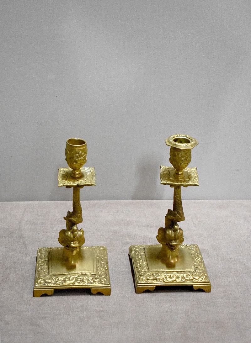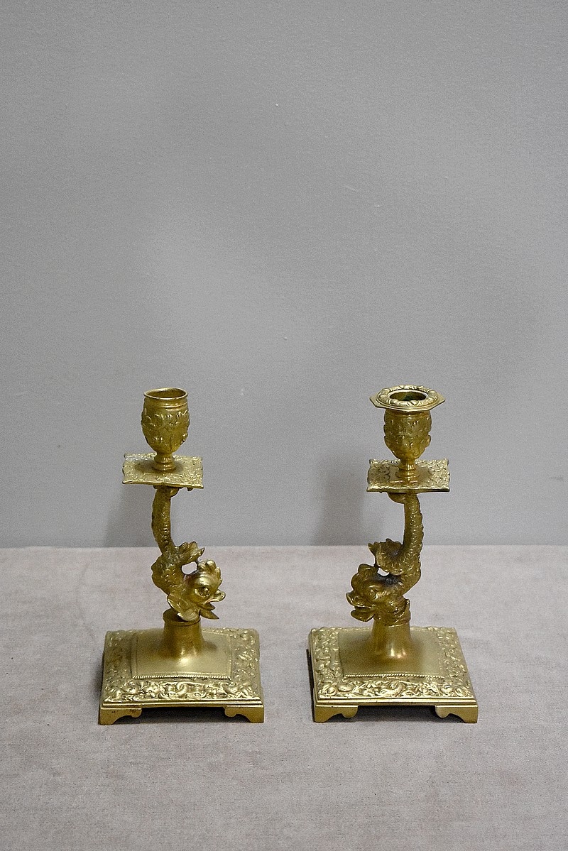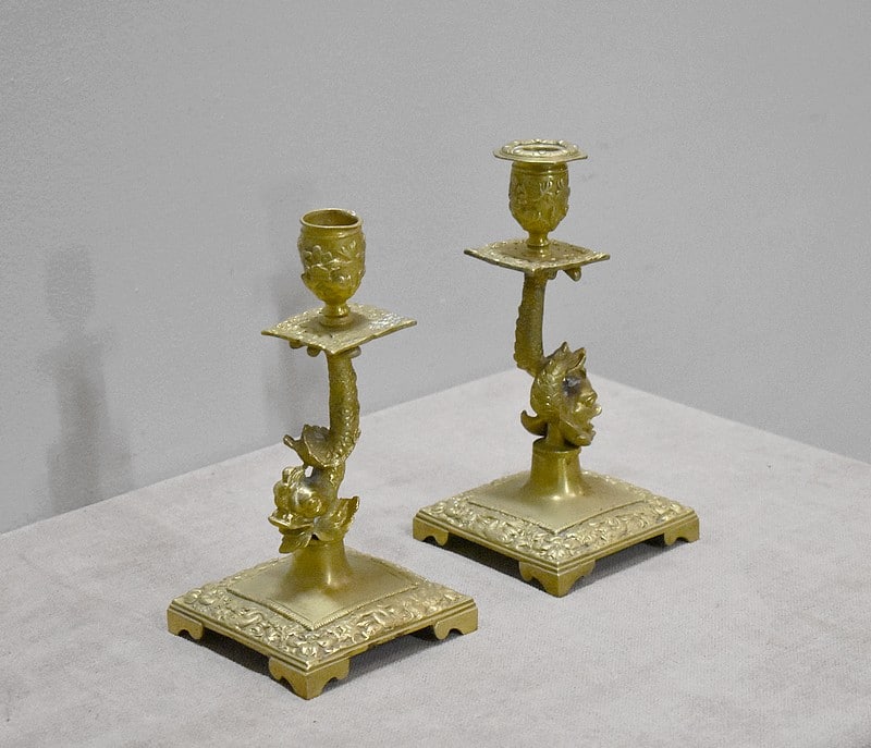 Ils reposent sur un pied à décors de dauphins terminé en socle carré orné de motifs floraux et d’autres dauphins.