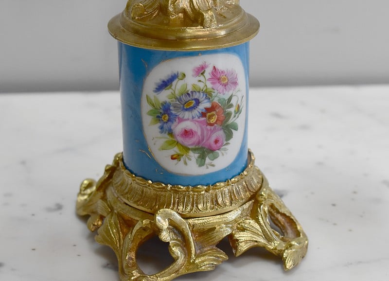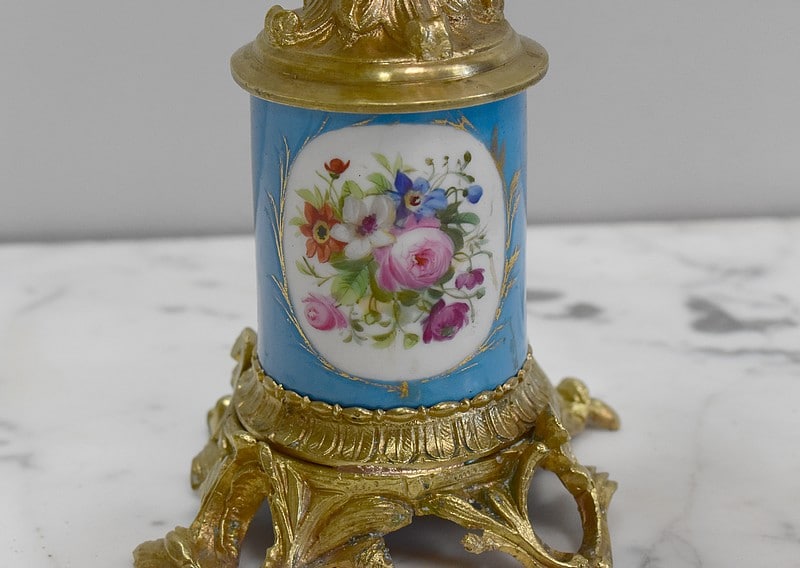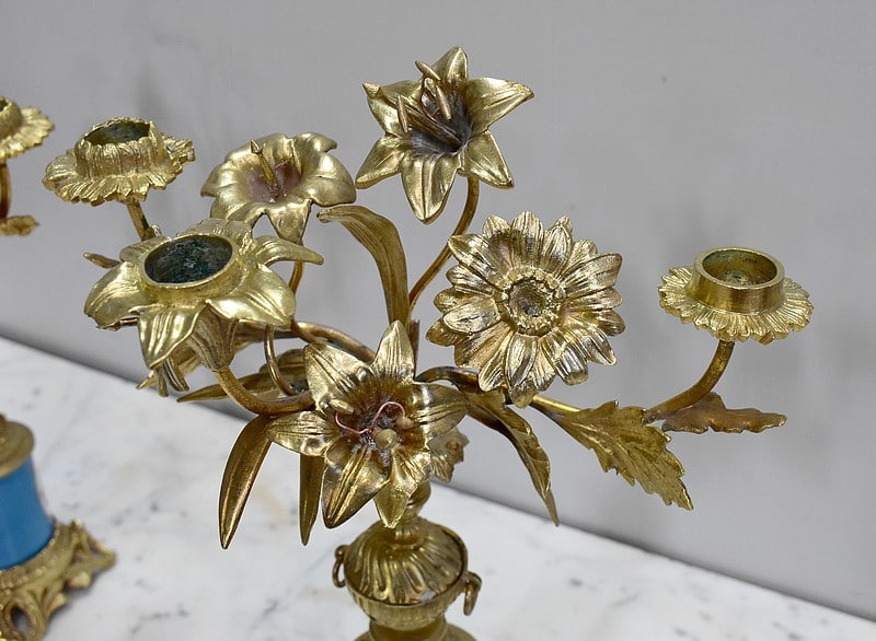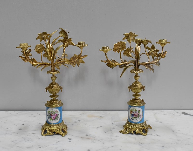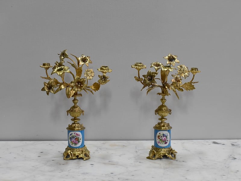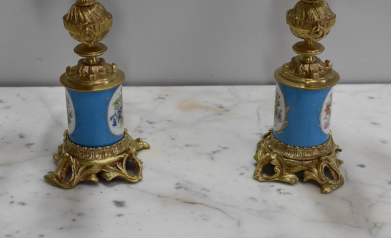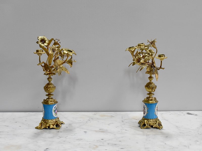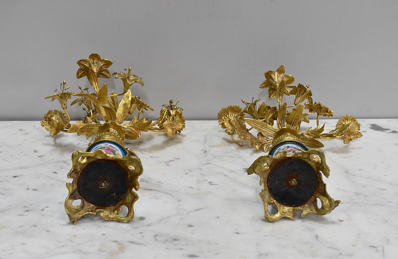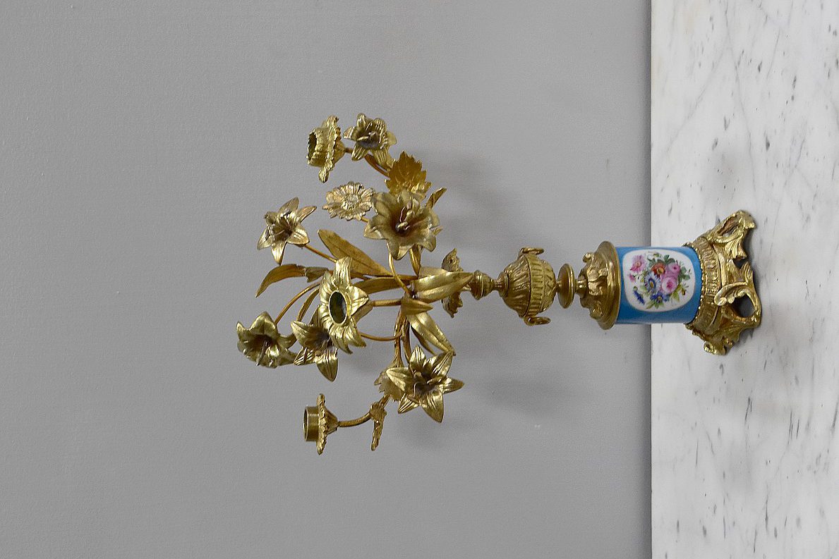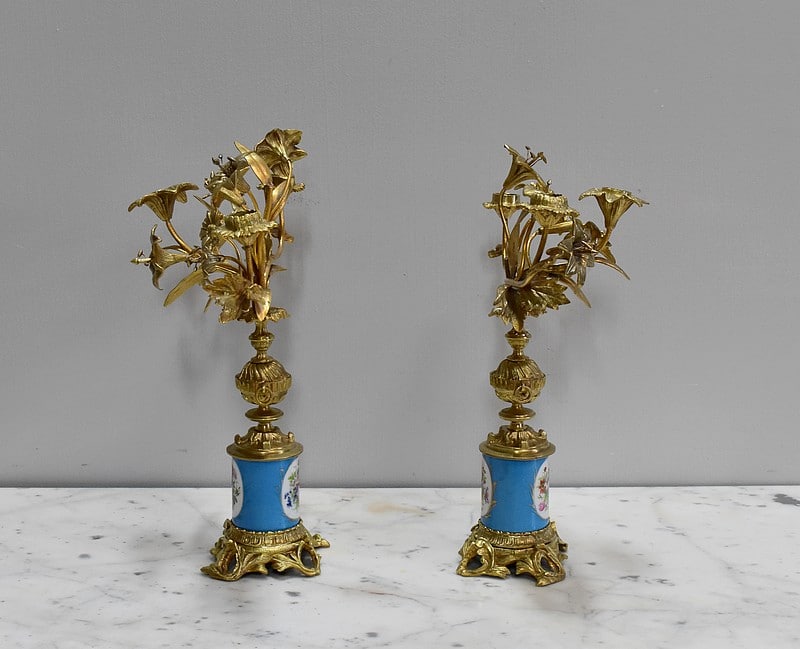 Paire de candélabres représentant des lys jaillissant d’un vase en porcelaine peint de fleurs sur fond blanc, entourées d’un fond bleu de Sèvres.