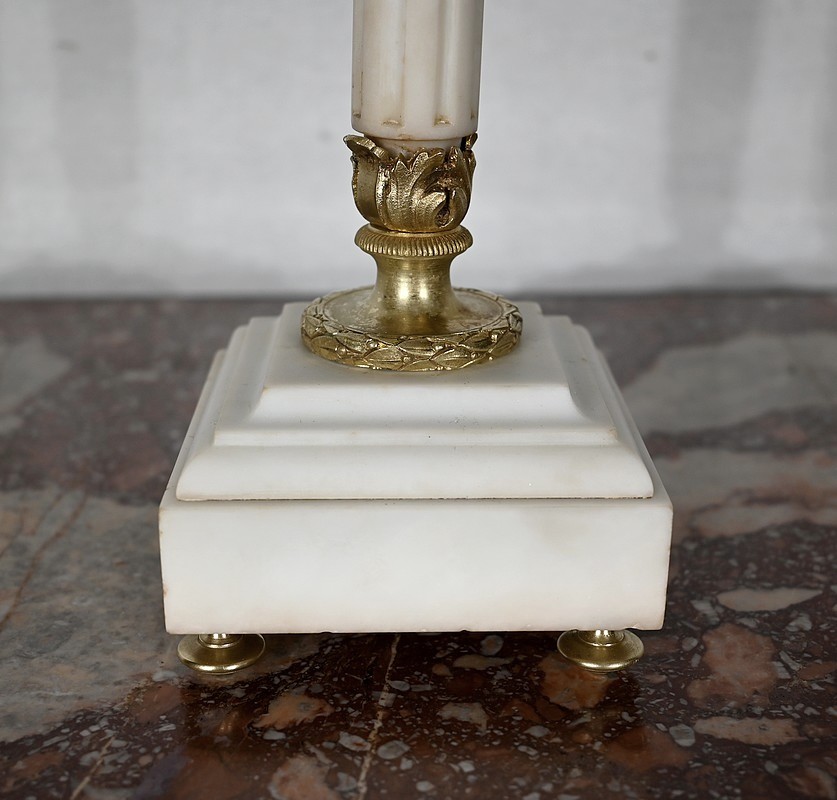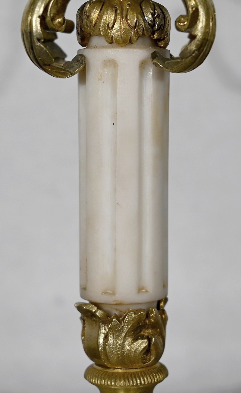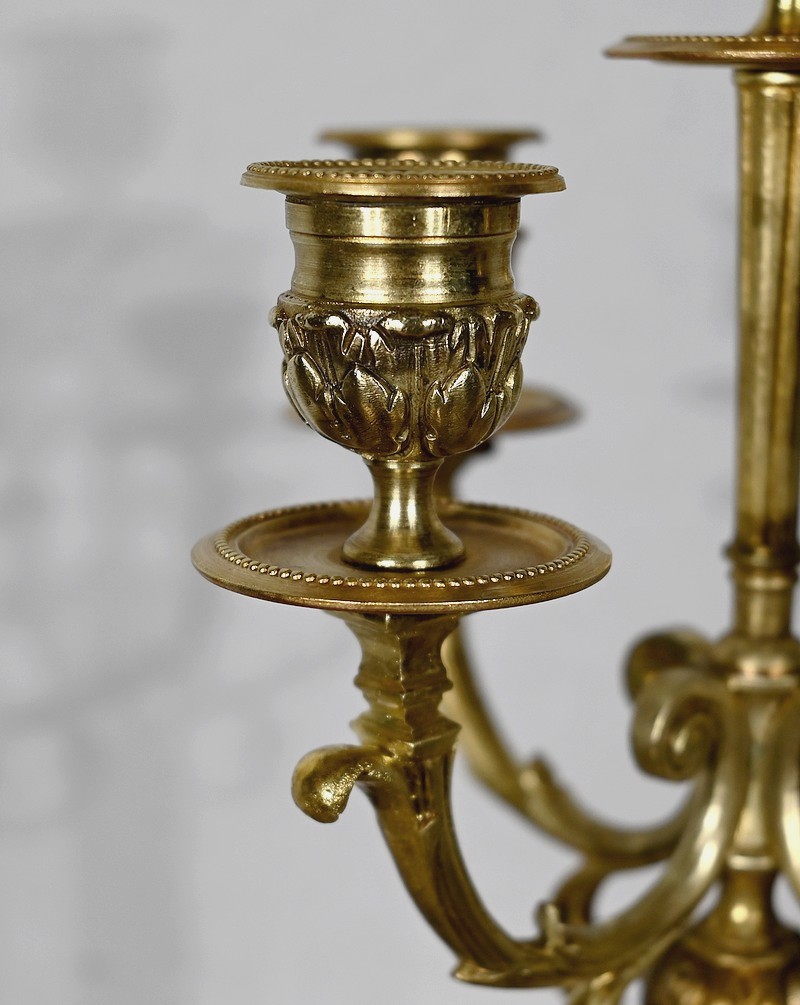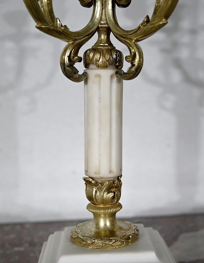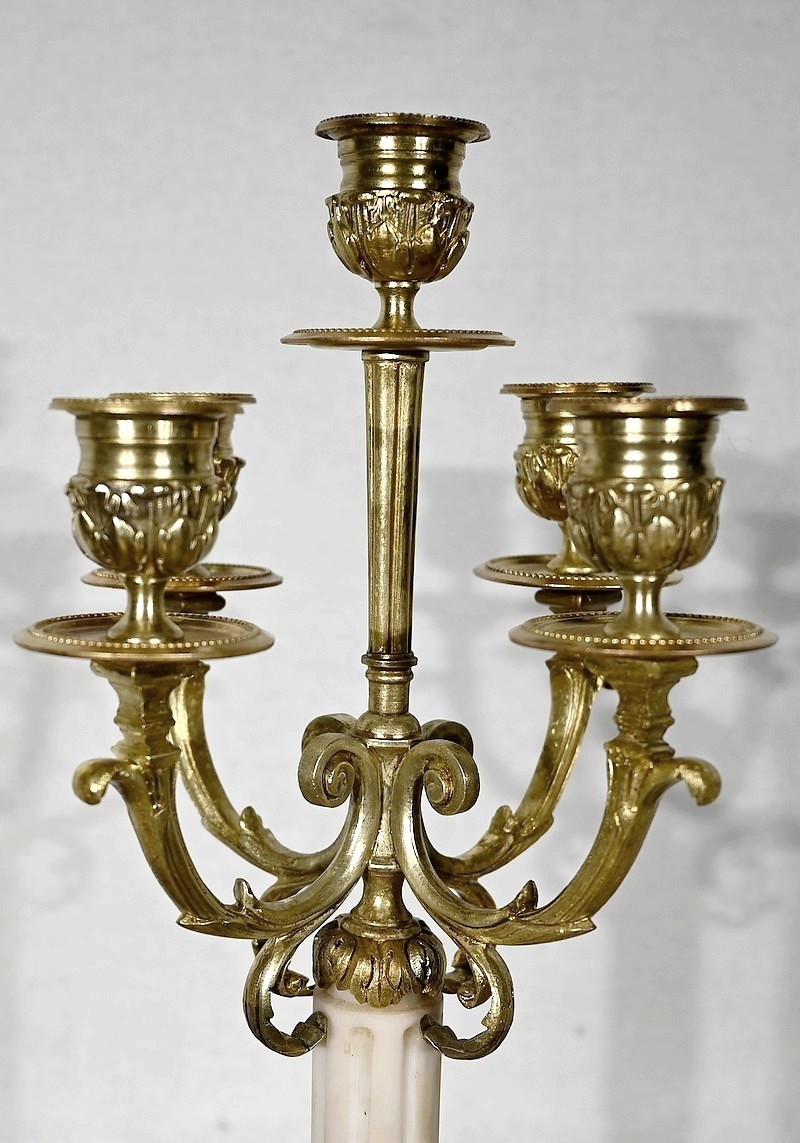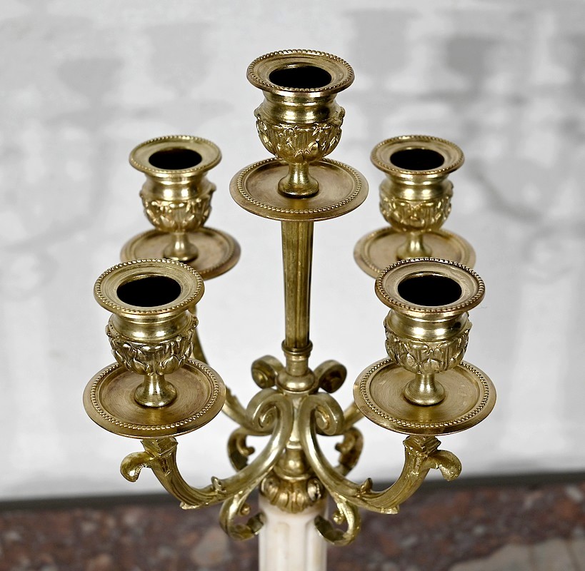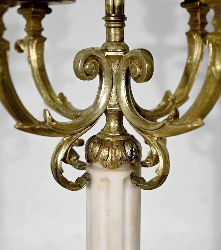 Surplombés par un bougeoir central, quatre bras de lumière agrémentés de rinceaux, viennent soutenir des bougeoirs aux bobèches joliment ouvragées. Le fût en marbre, de forme cylindrique, est muni de cannelures arrêtées et se termine par une collerette en bronze en forme de couronne de lauriers. L’ensemble repose sur un socle en marbre carré mouluré.