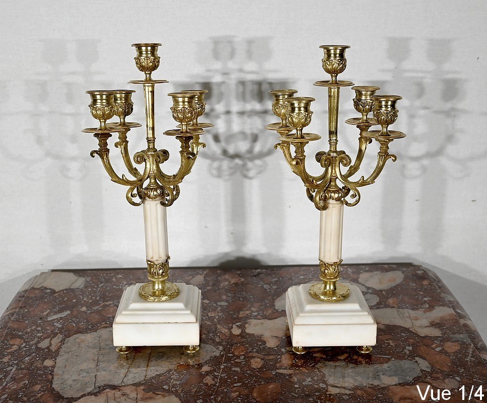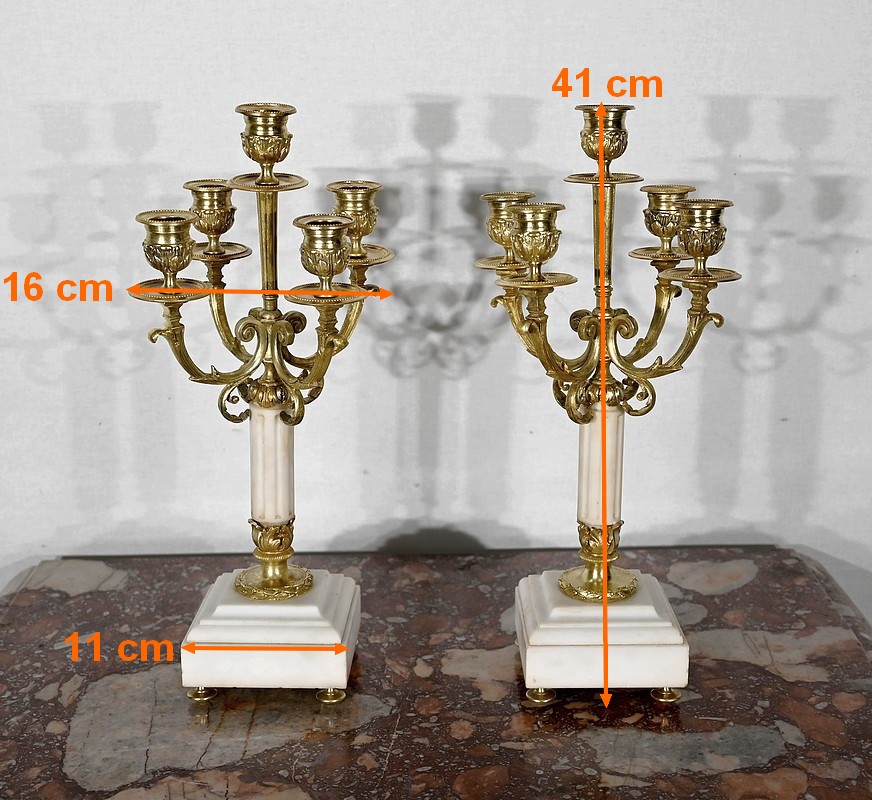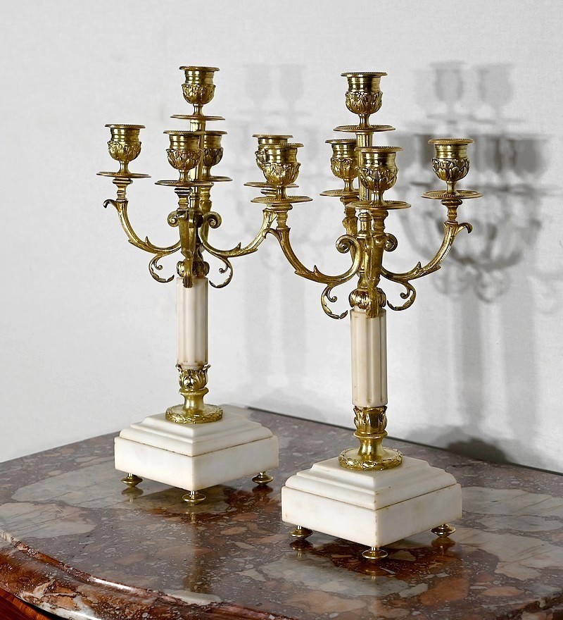Élégante paire de Candélabres en Bronze doré et marbre, dotés de 5 lumières et datant du XIXe siècle.