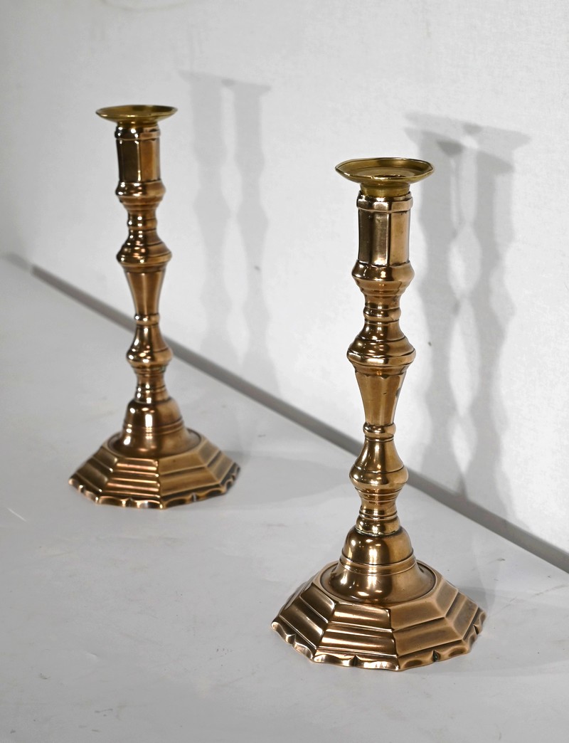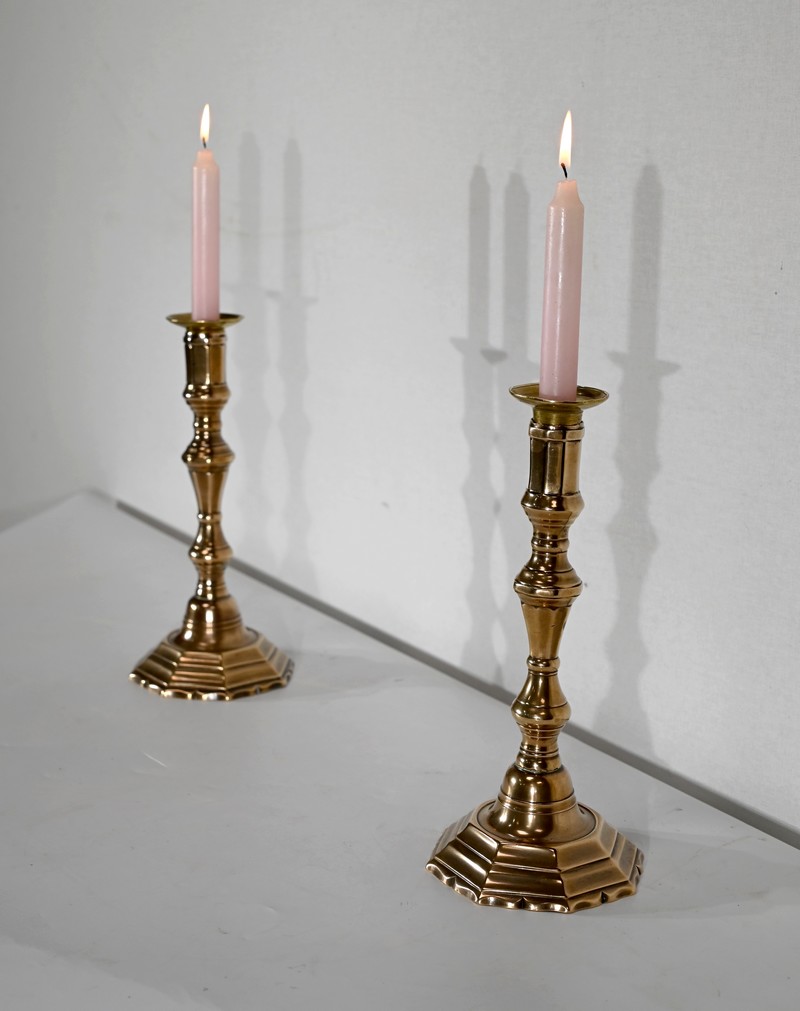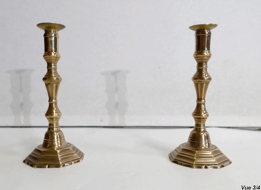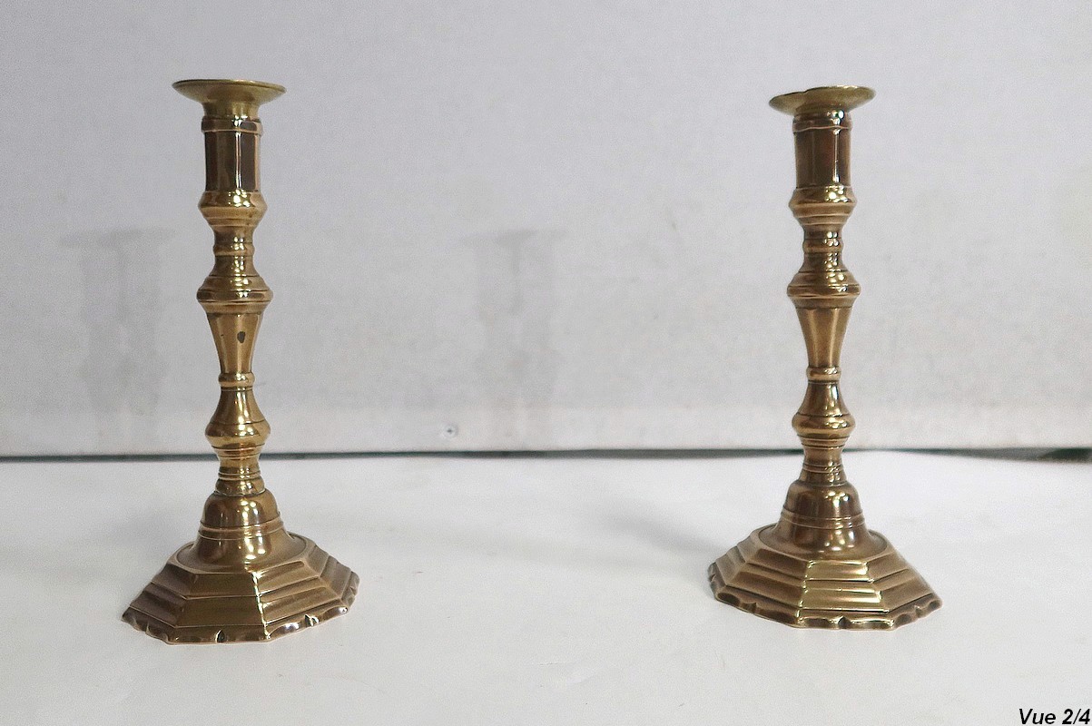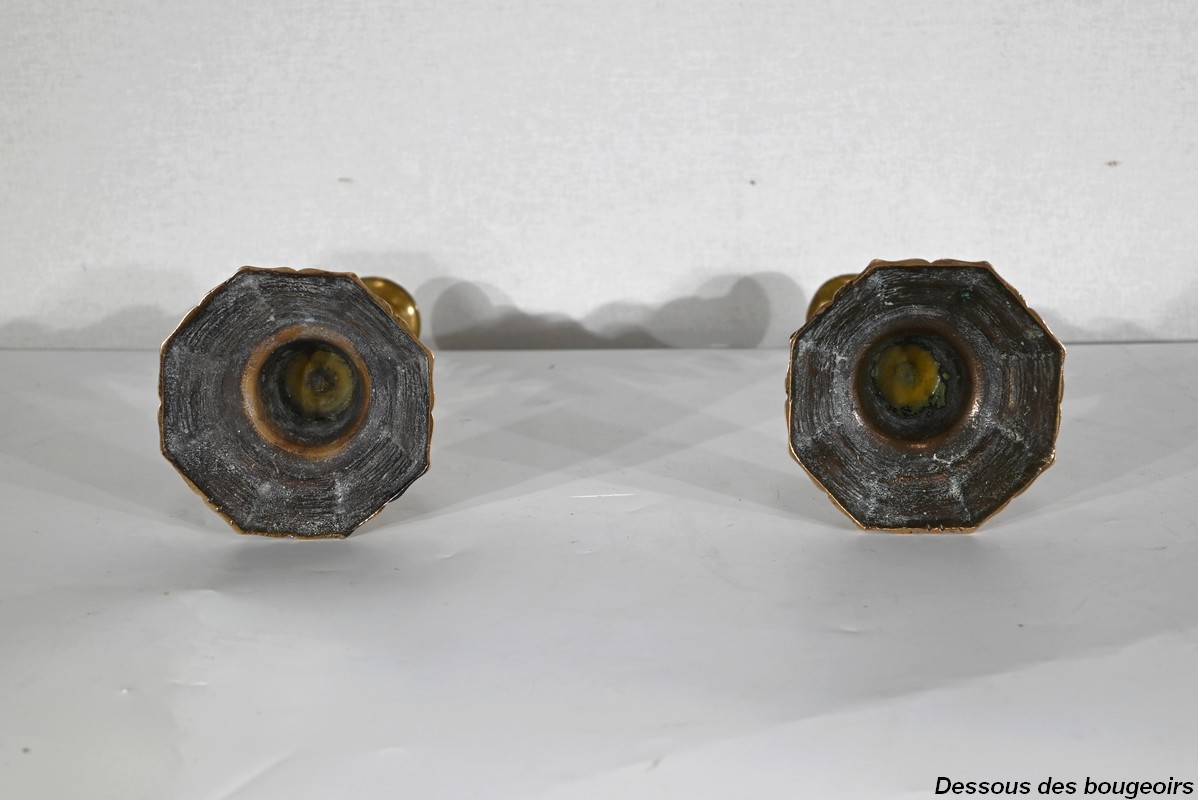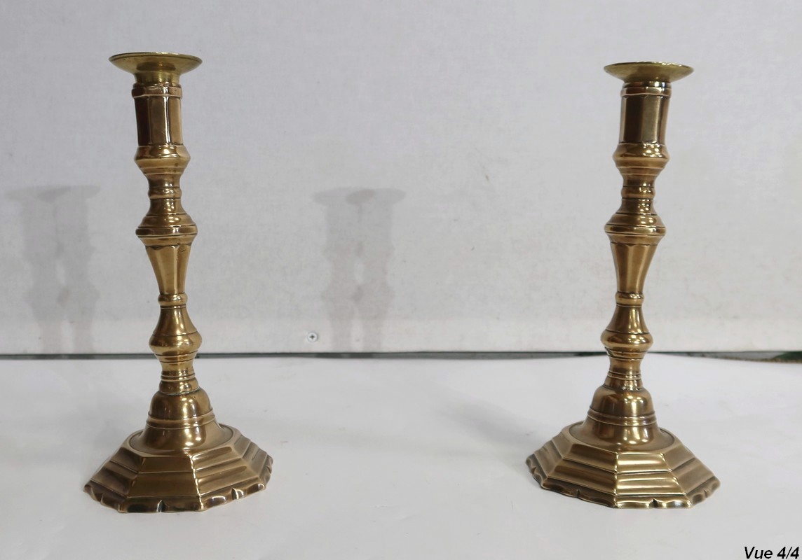 Ensemble de deux chandeliers en bronze sobrement dorés.