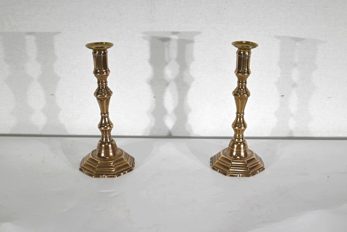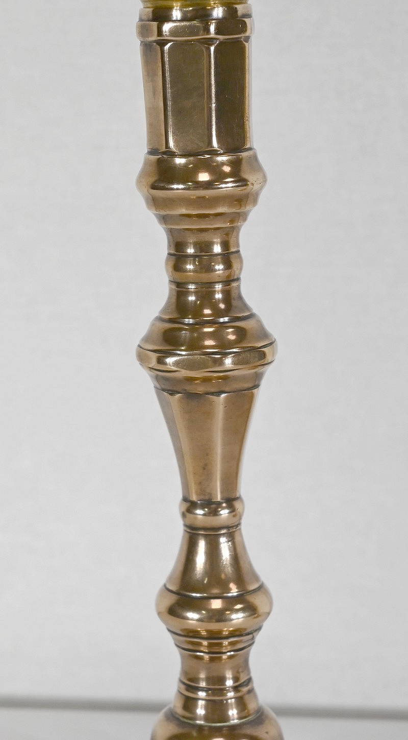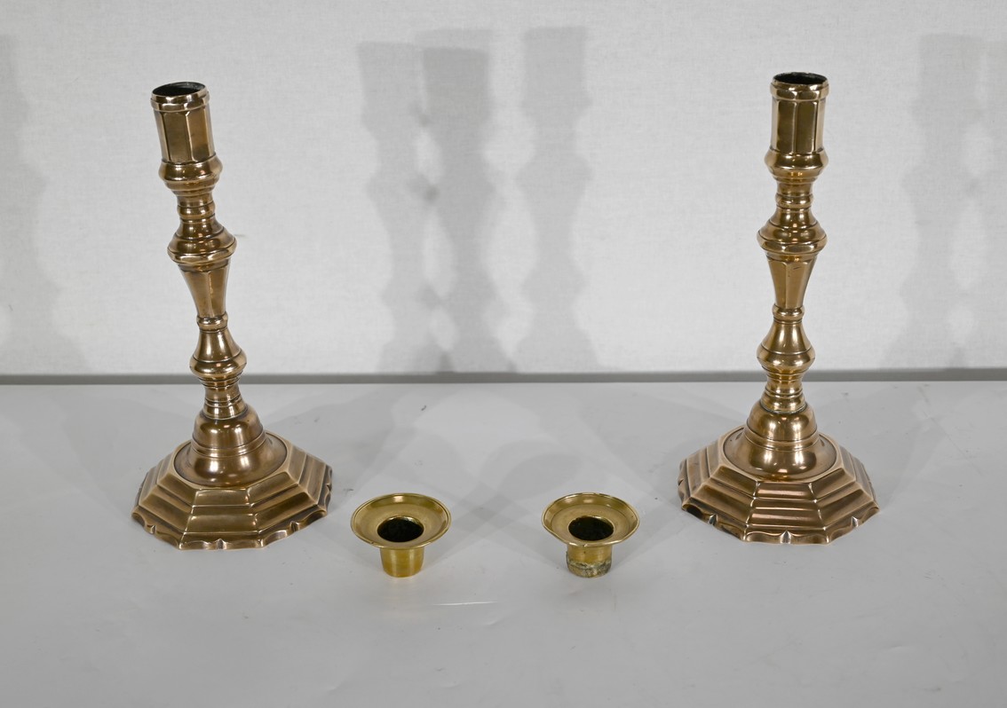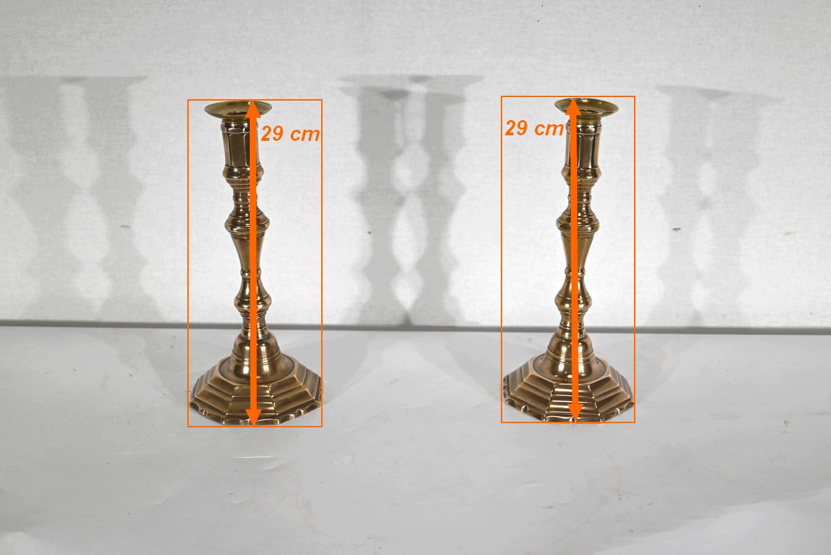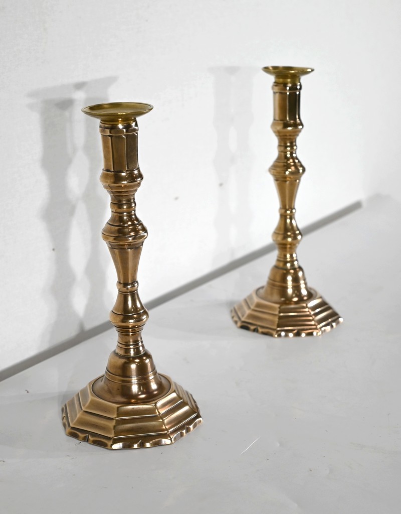 Ensemble de deux chandeliers en bronze sobrement dorés.