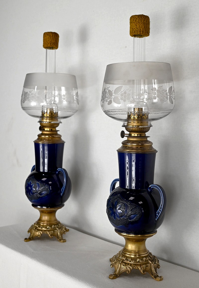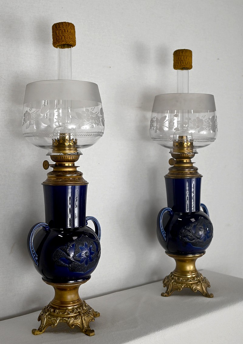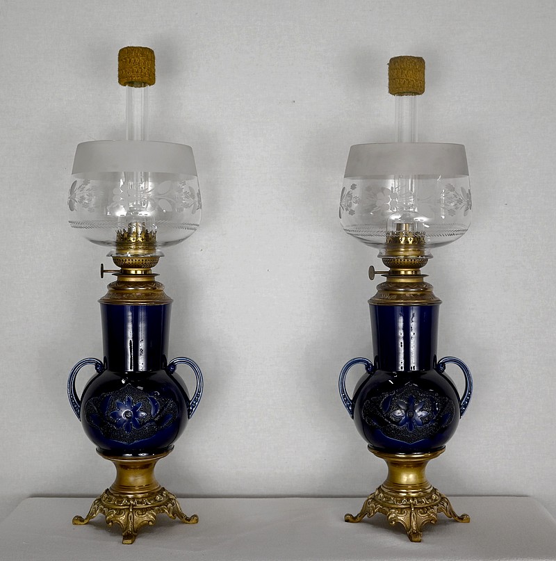 Lampes à pétrole en faïence bleue cobalt, agrémentées de bronze et ornées de globes d’origine à motifs de fleurs et de feuilles.