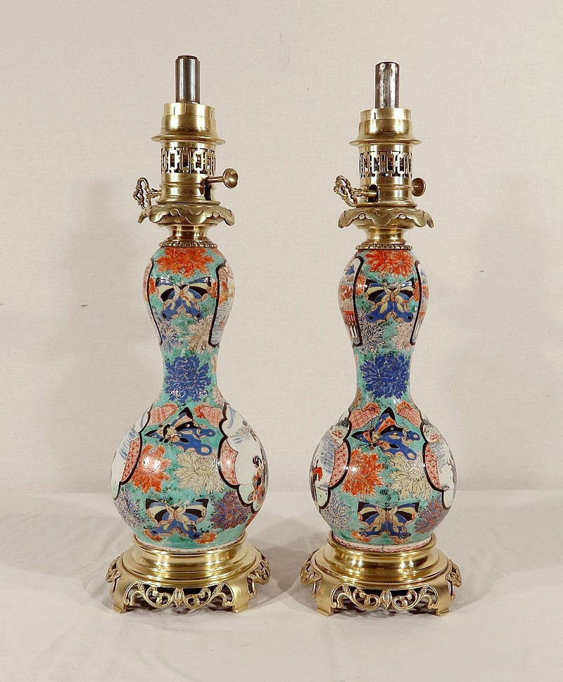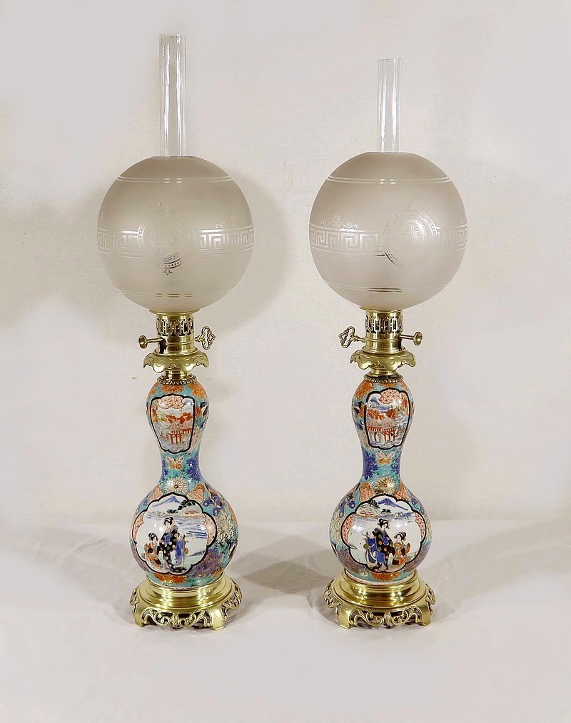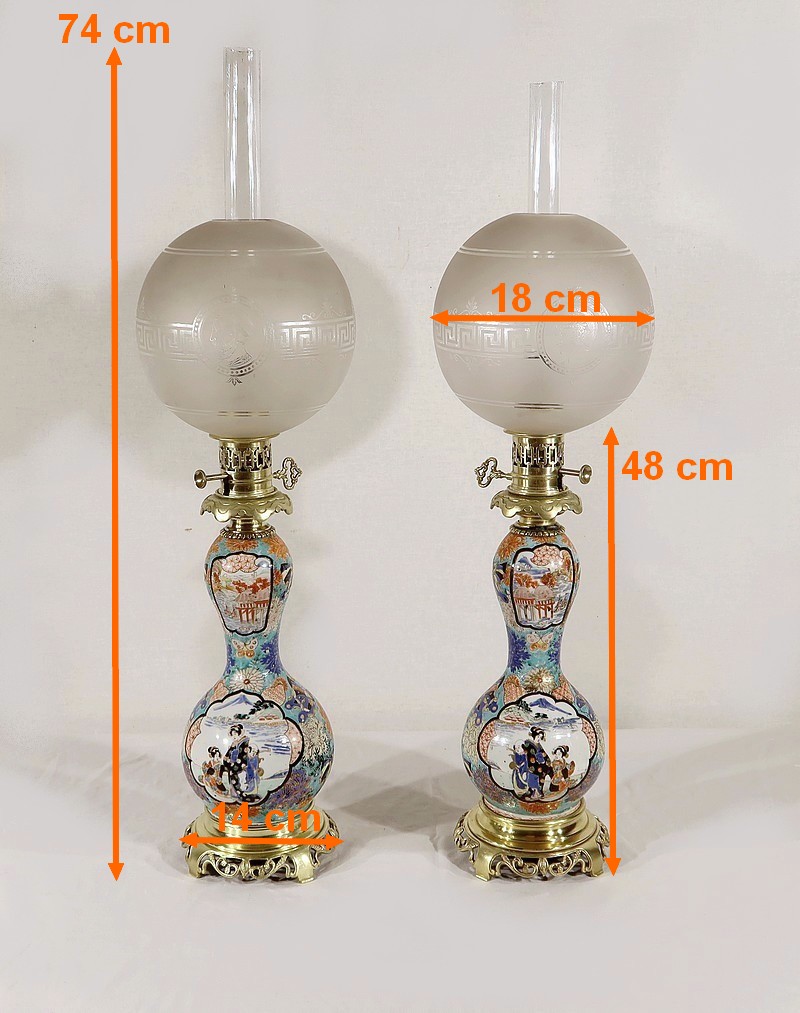 Belles lampes à pétrole datant de l’époque Napoléon III, réalisées en porcelaine japonaise et agrémentées de bronze.