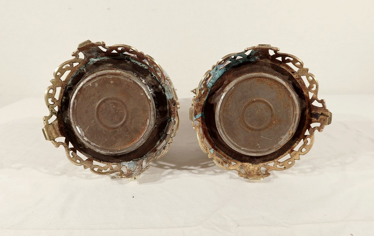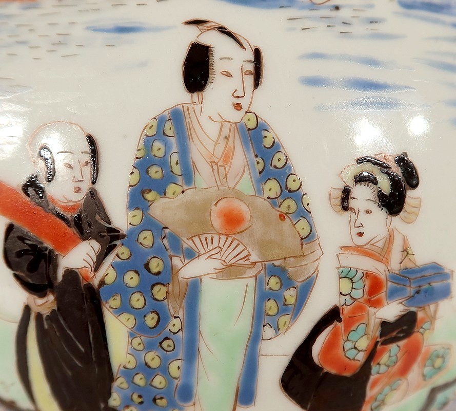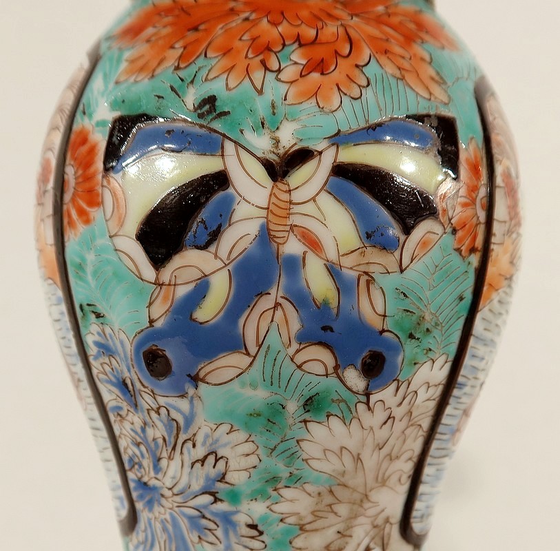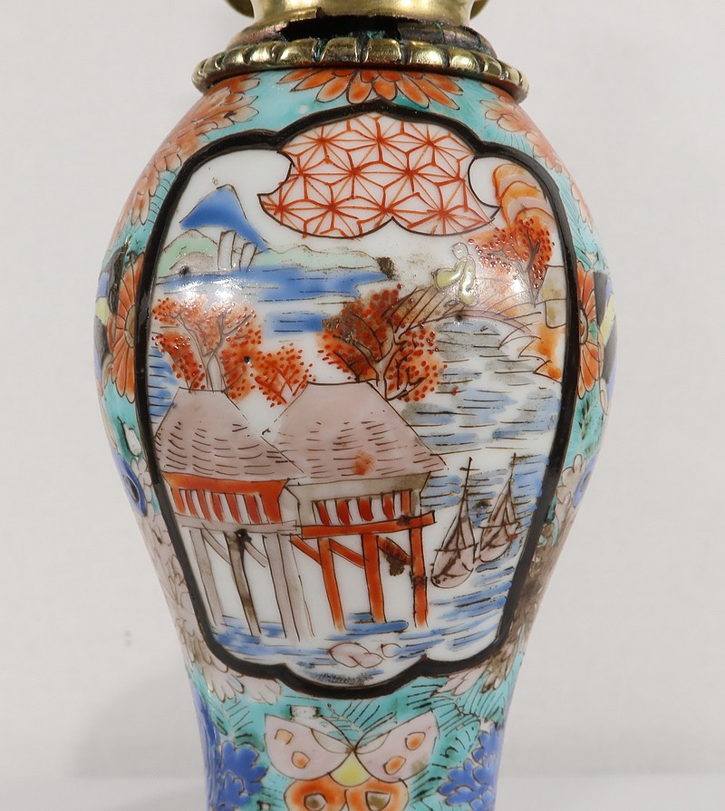 Ces lampes aux décors asiatiques, représentant des scènes de vie à la cour de l’empereur, sont peintes de fleurs et de papillons multicolores. Les tons intenses sont rehaussés pour certains de filets d’or.