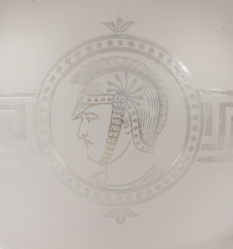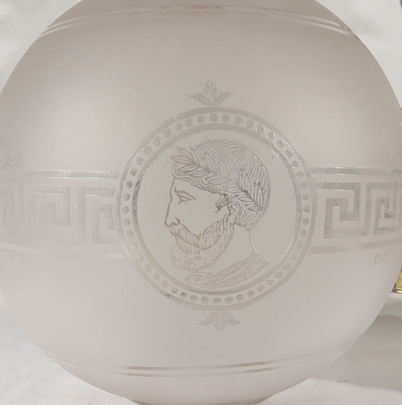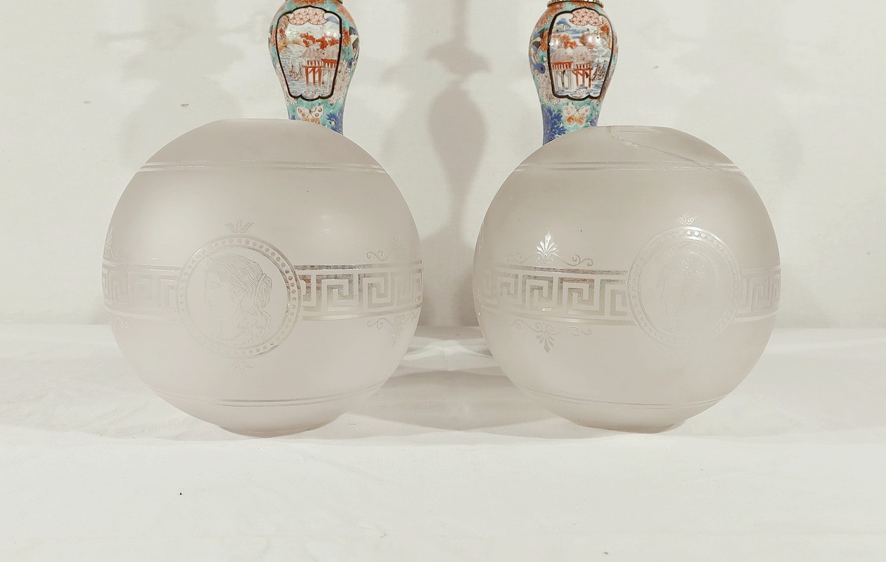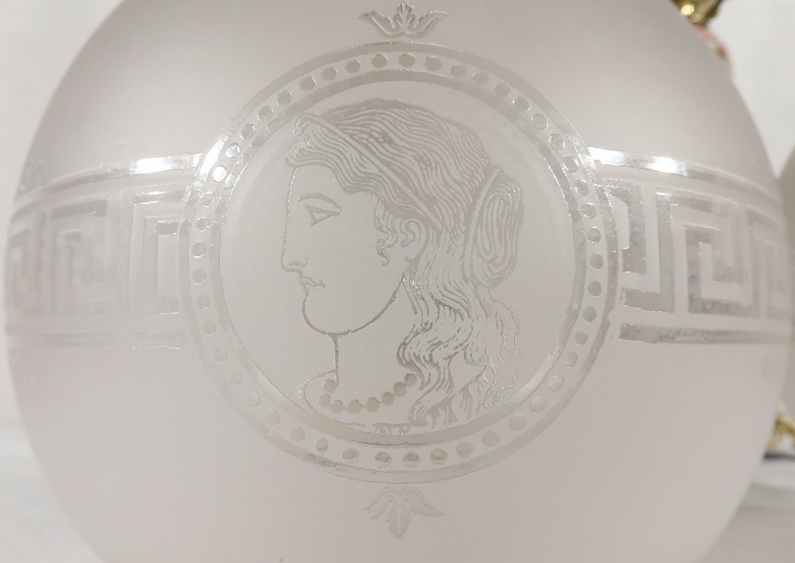 Elles sont sommées d’un globe Napoléon III d’origine en verre blanc mat souligné de gravures dans le style gréco-romain. Une de ces sphères présente des éclats recollés