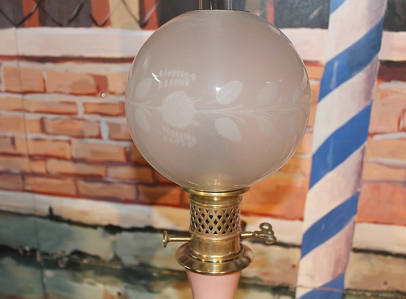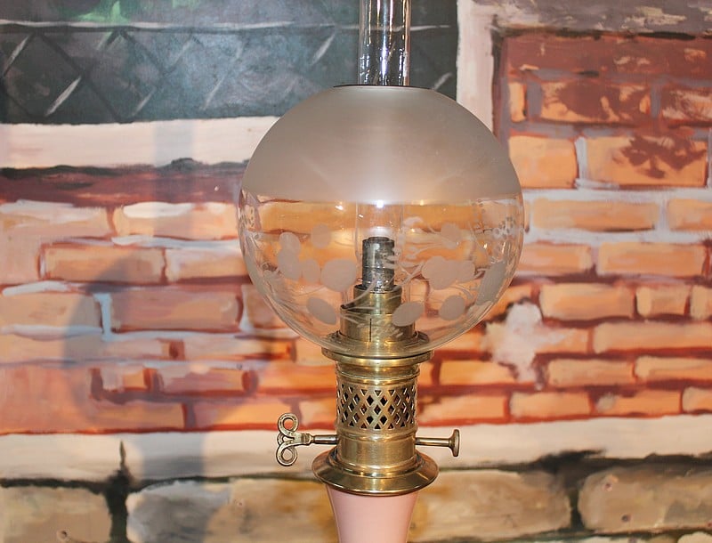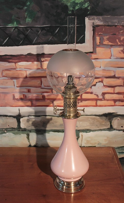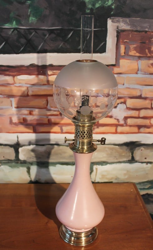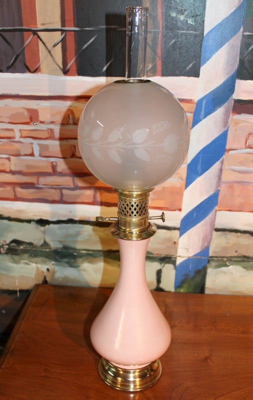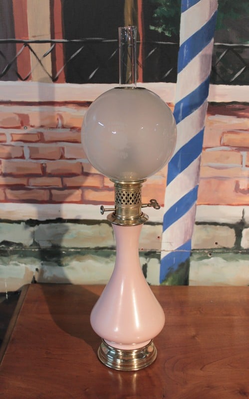 Paire de lampes à pétrole NAPOLÉON III en porcelaine rose sur socle en laiton. Globes anciens. Époque : seconde moitié du XIXe.