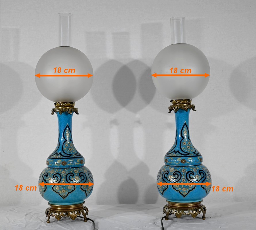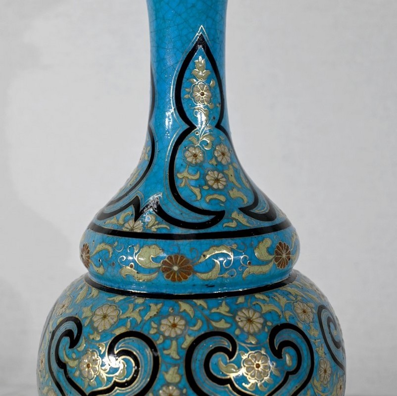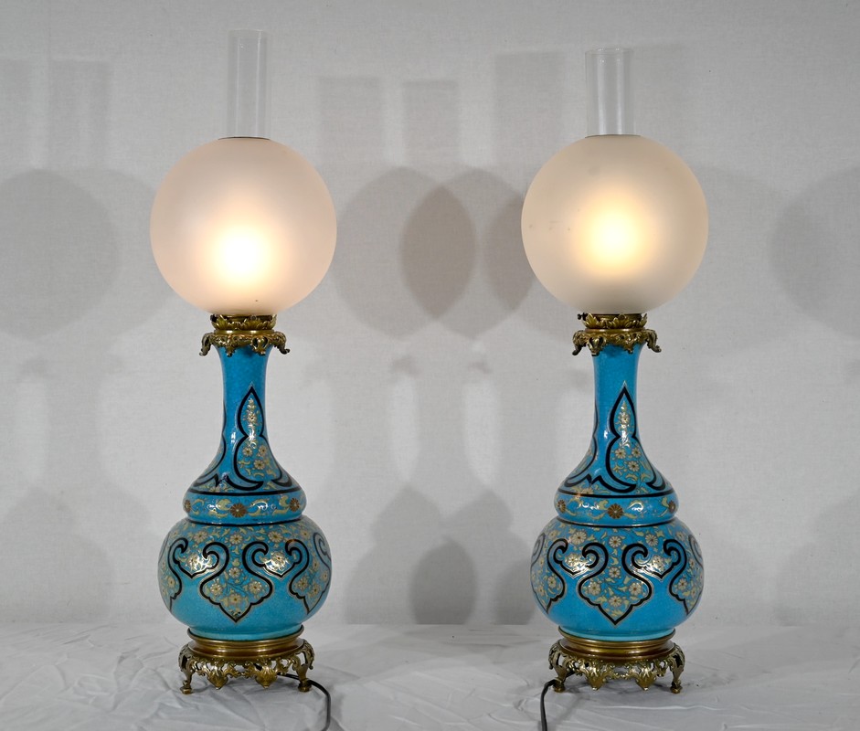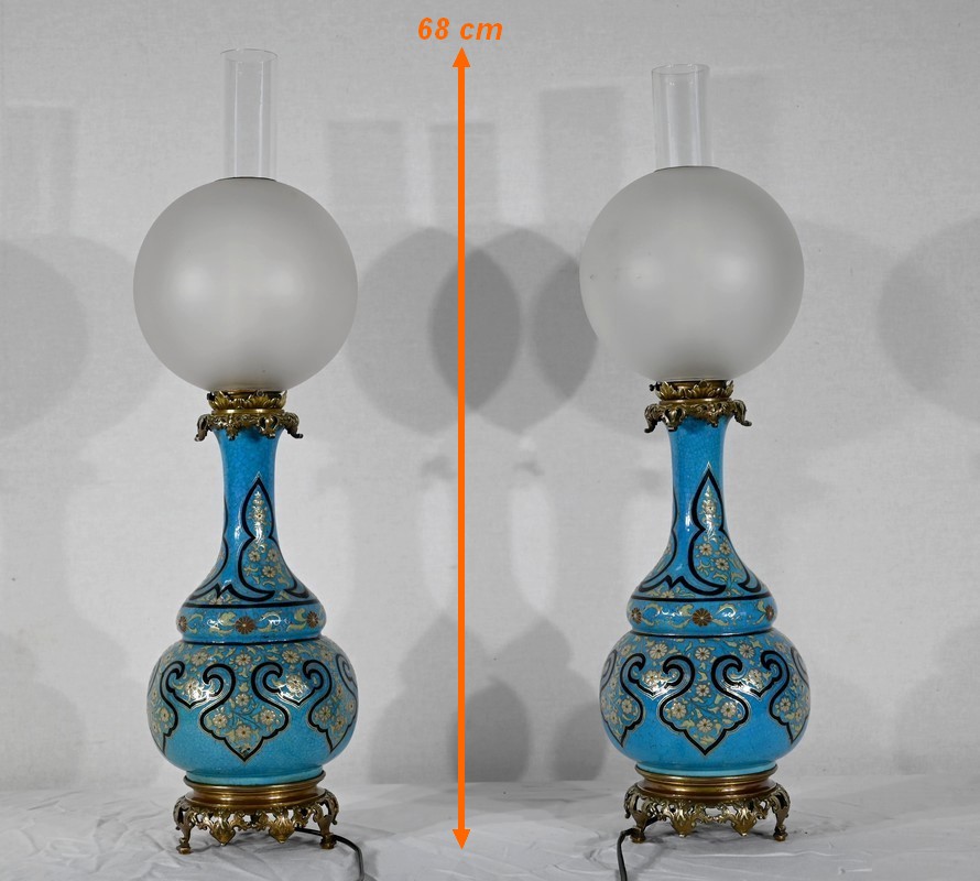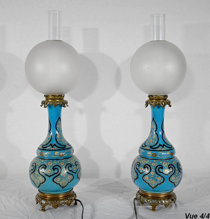 Les panses à double bulbe sont ornées de décors en relief de fleurs et de feuilles en émaux, sur fond couleur bleu céleste, soulignés par des motifs fantaisistes noirs et dorés. Les cols évasés sont sommés de larges collerettes, en bronze, ouvragées de feuilles d’acanthe à enroulement et de rinceaux. Ces luminaires reposent sur des socles tripodes, à gorge, ouvragés de petits bourgeons et d’éléments végétaux.