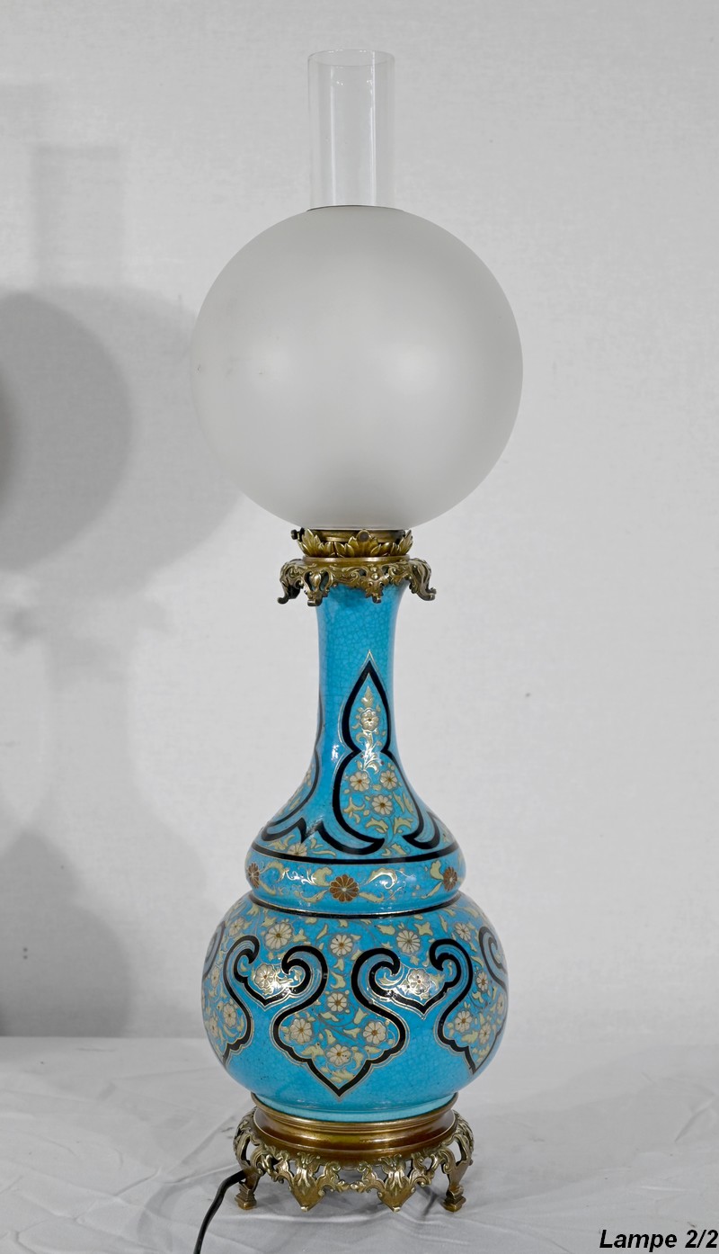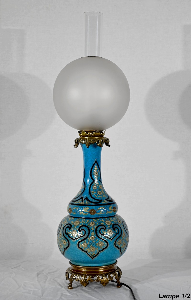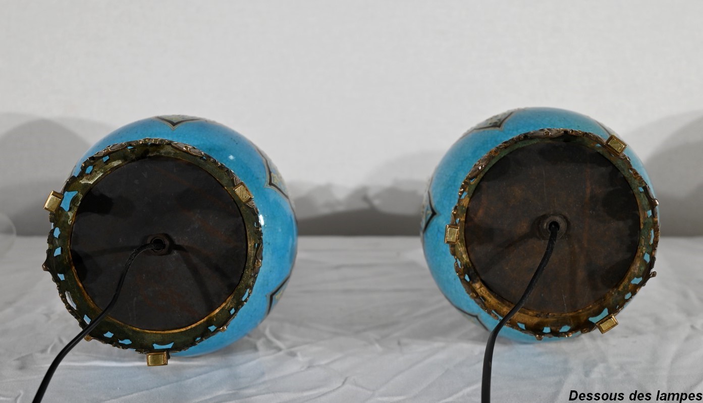 Les panses à double bulbe sont ornées de décors en relief de fleurs et de feuilles en émaux, sur fond couleur bleu céleste, soulignés par des motifs fantaisistes noirs et dorés. Les cols évasés sont sommés de larges collerettes, en bronze, ouvragées de feuilles d’acanthe à enroulement et de rinceaux. Ces luminaires reposent sur des socles tripodes, à gorge, ouvragés de petits bourgeons et d’éléments végétaux.