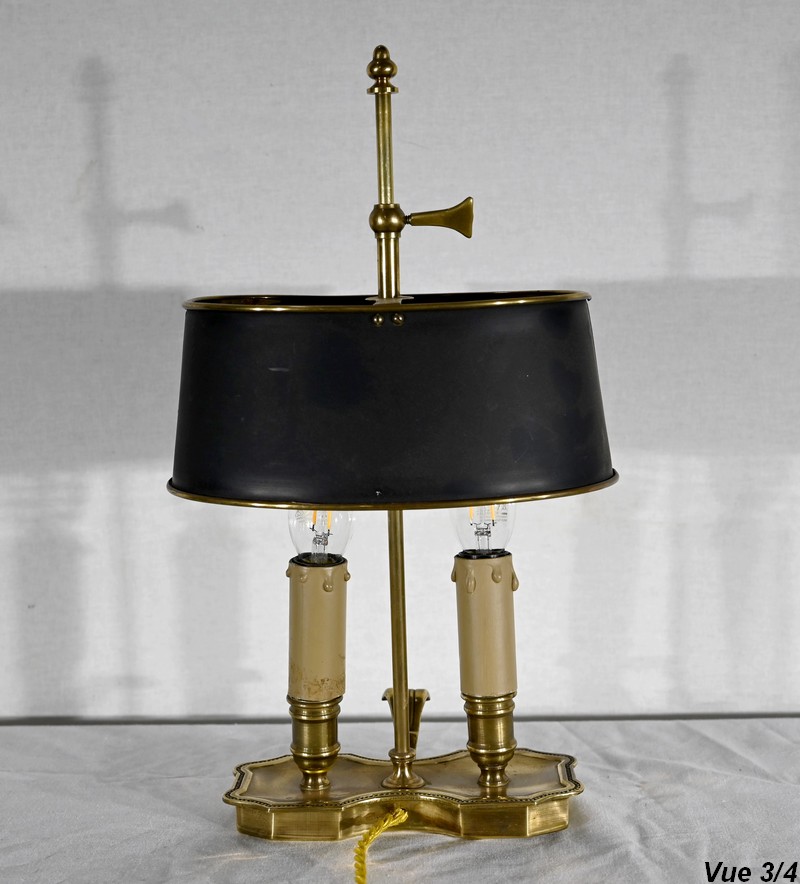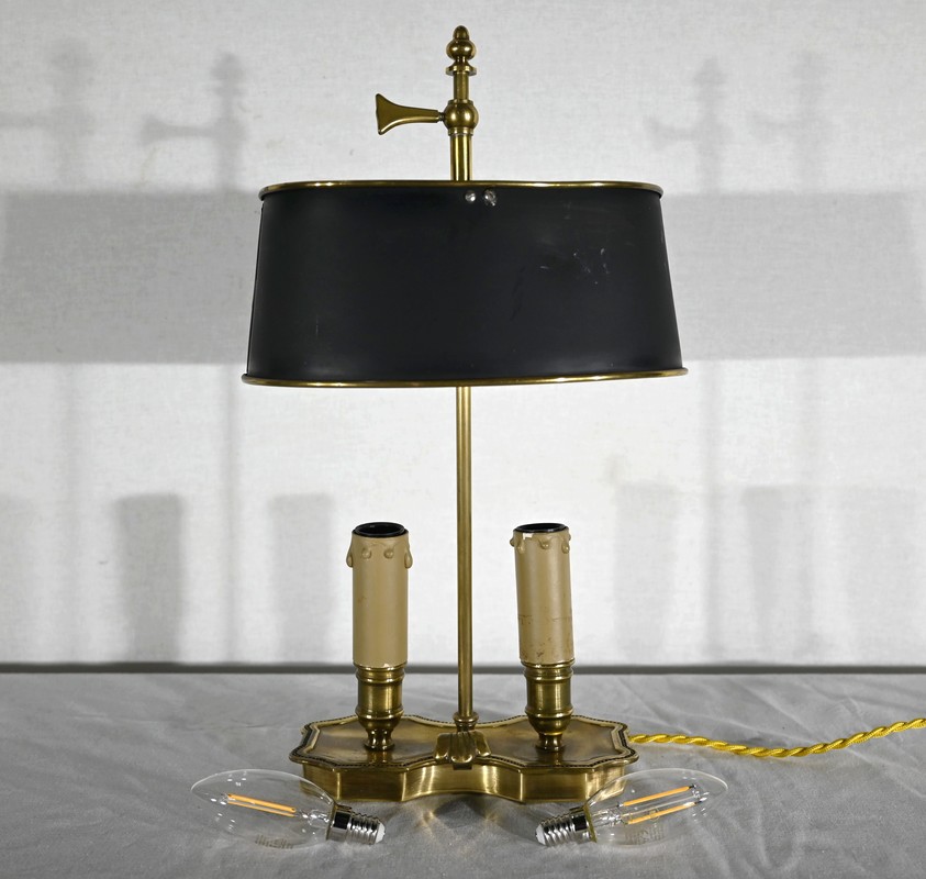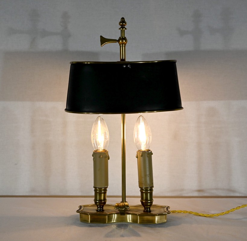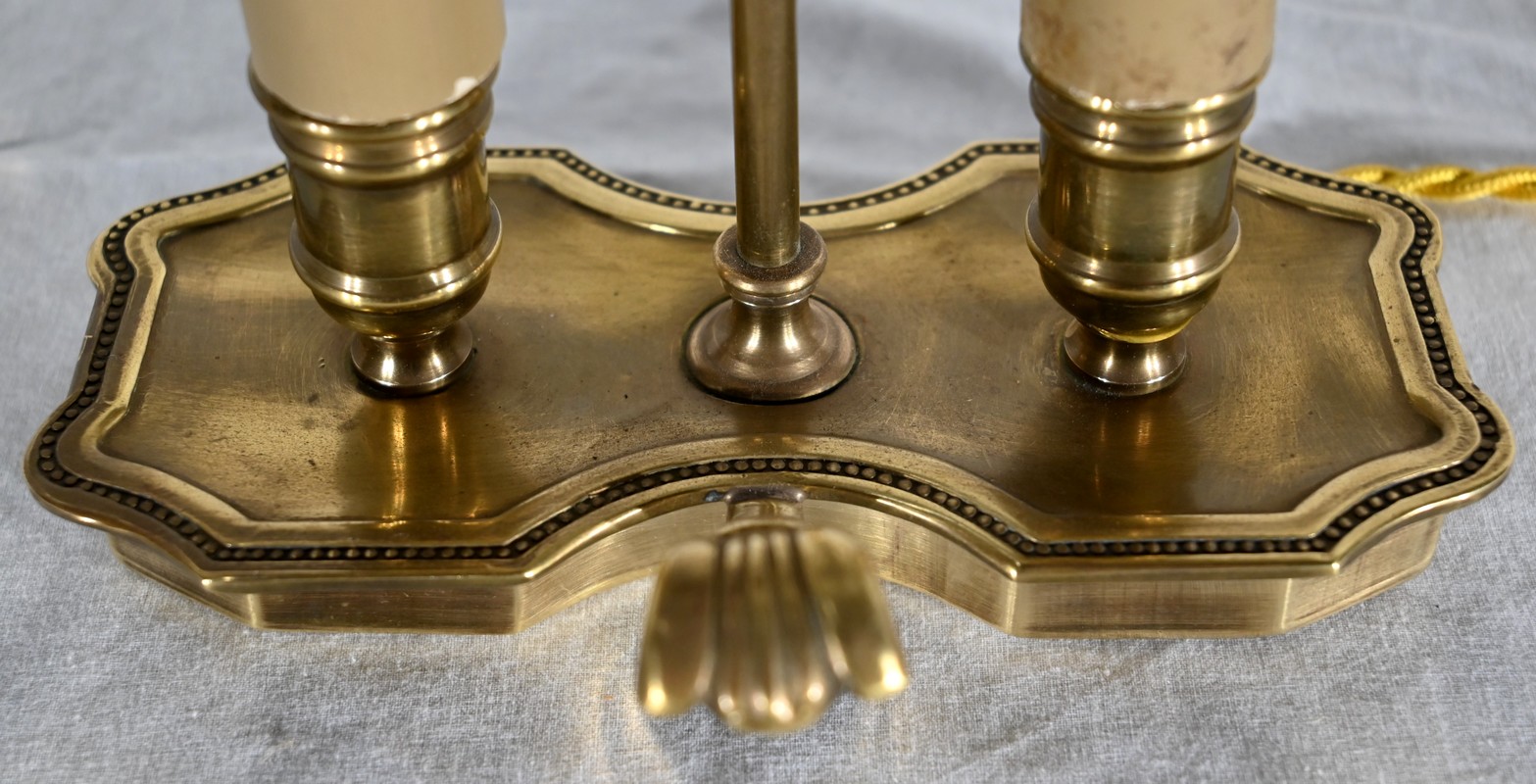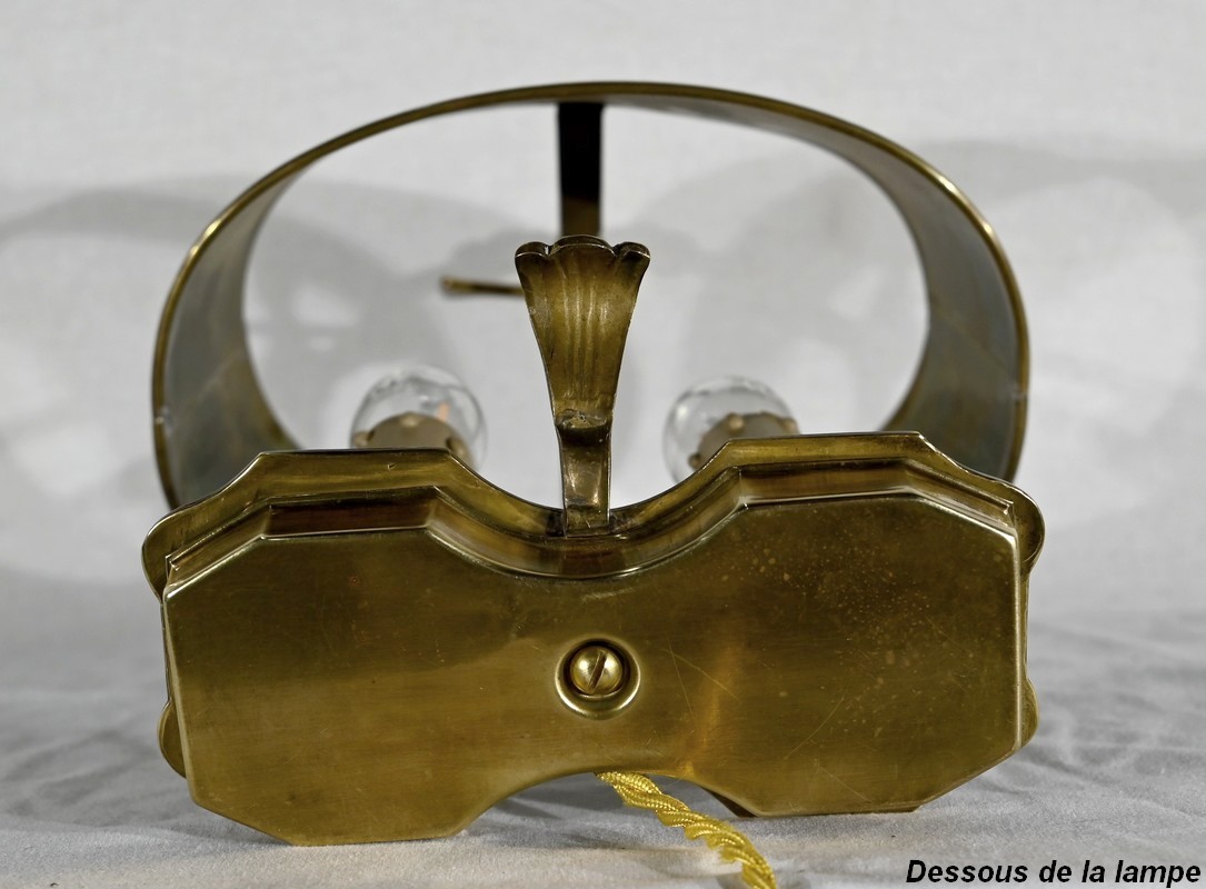 La base en cuvette supporte deux portes bougies cylindriques, et est pourvue d’une poignée de portage en bronze à motif de feuille.