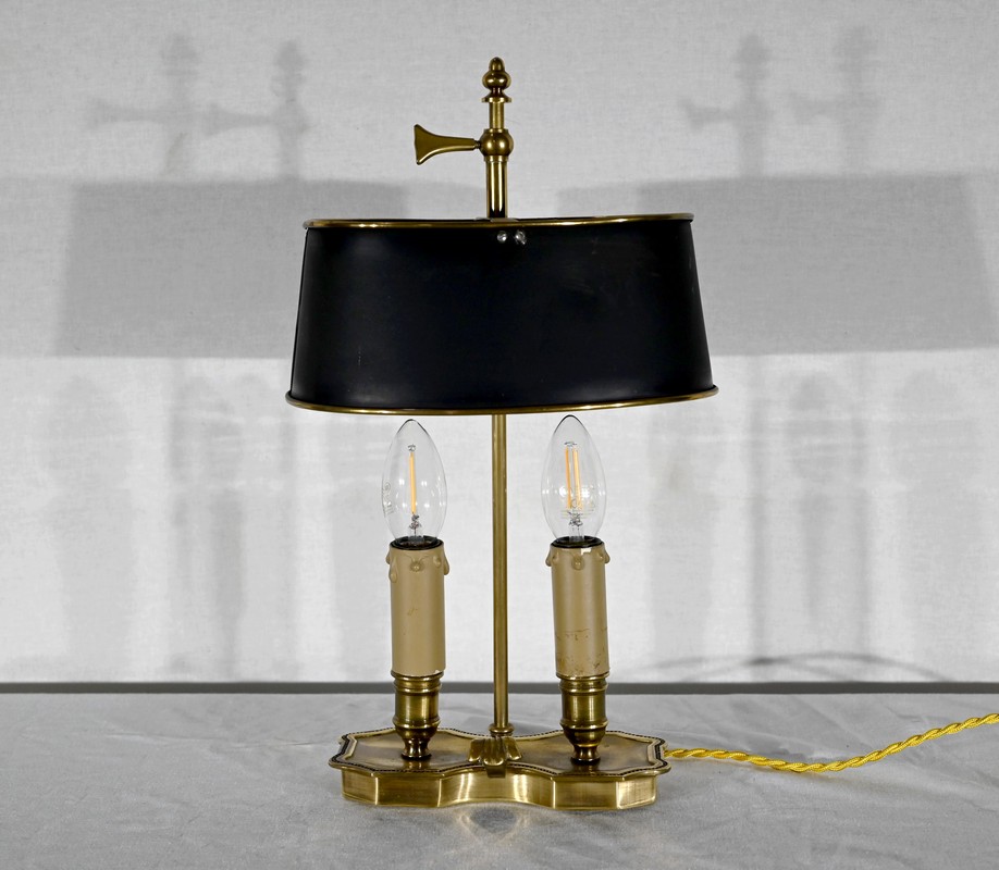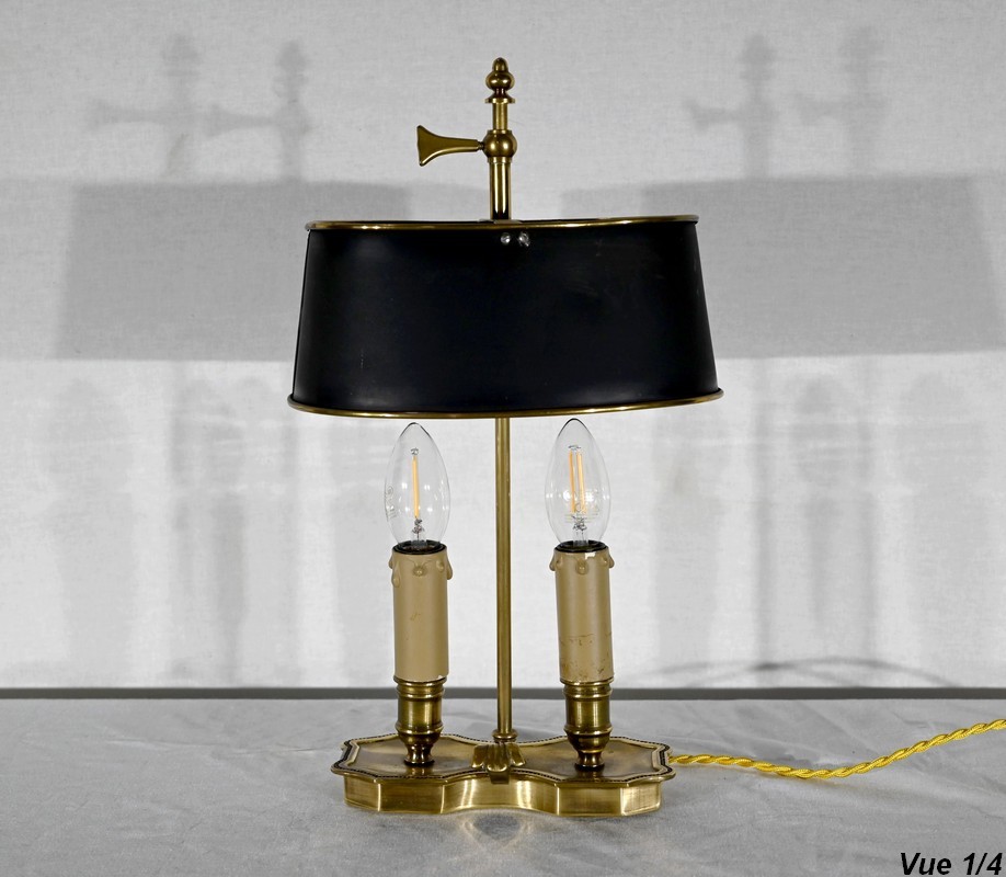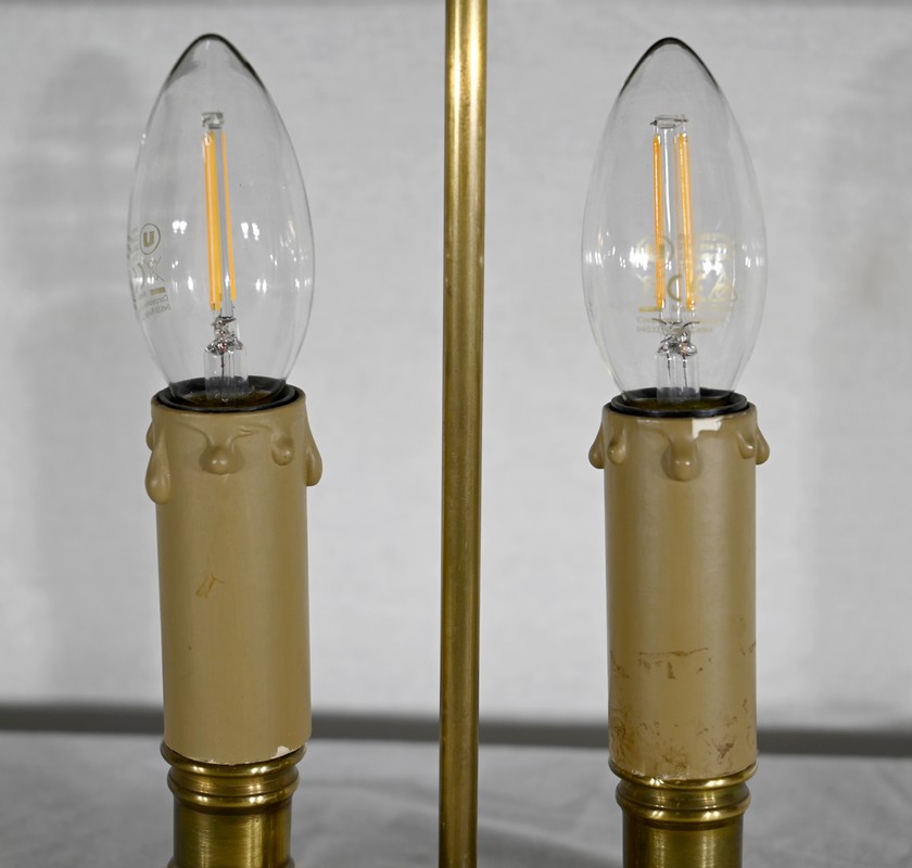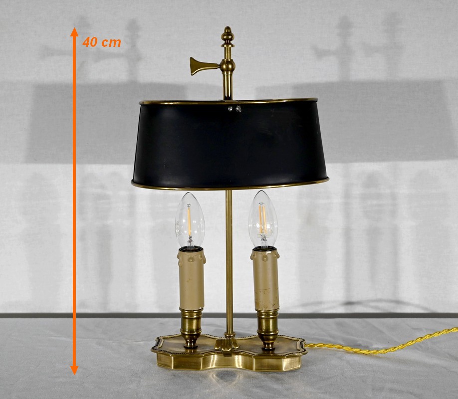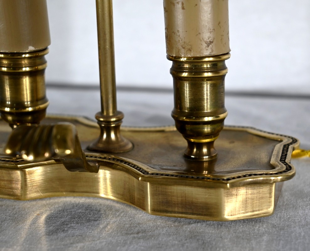 La base en cuvette supporte deux portes bougies cylindriques, et est pourvue d’une poignée de portage en bronze à motif de feuille.