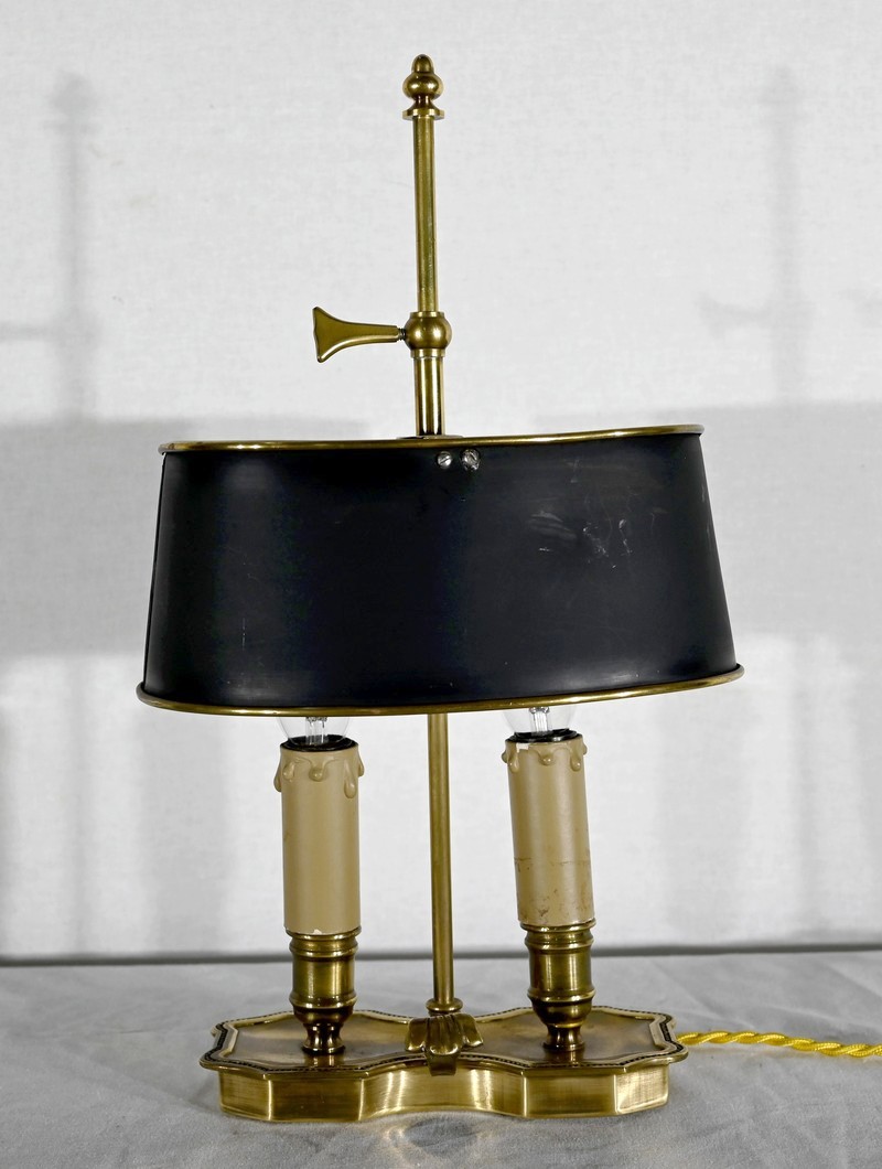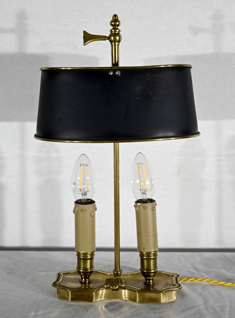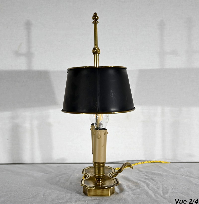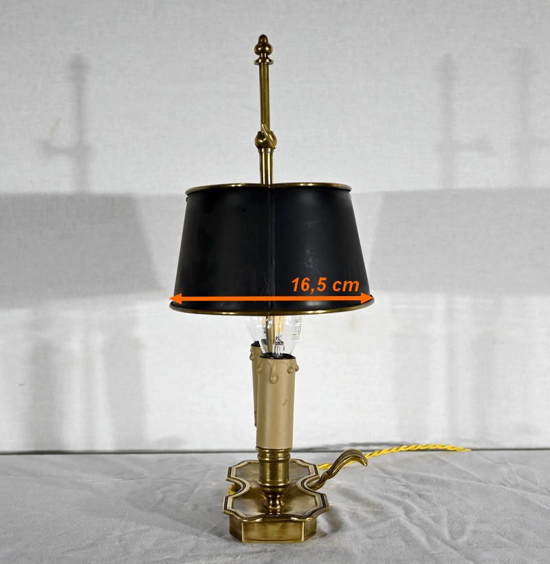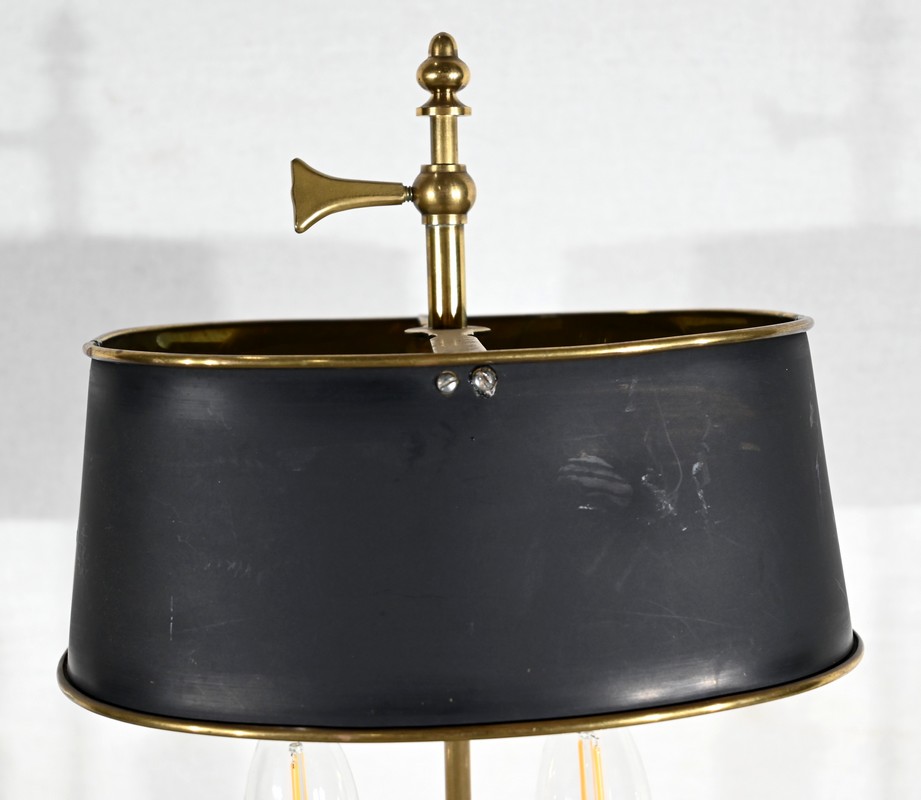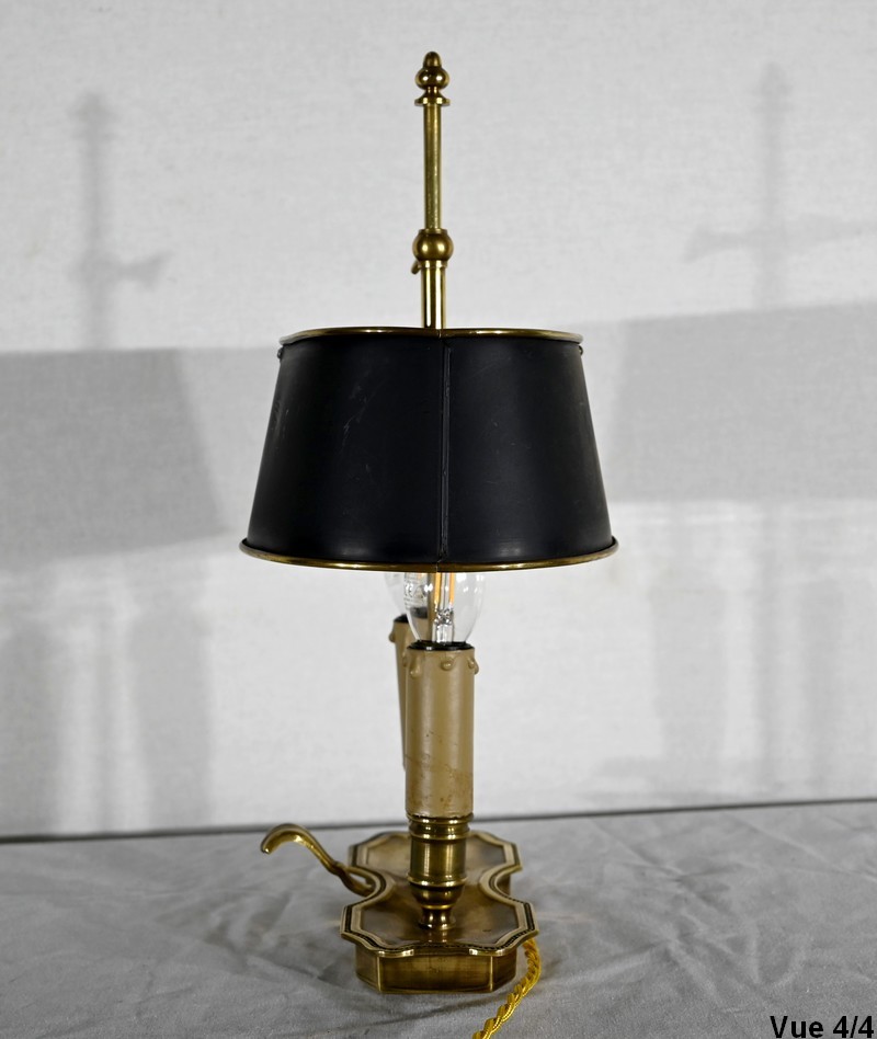 Petite lampe bouillotte en laiton chapeautée d’un abat-jour en tôle de couleur verte et cerclé de laiton.