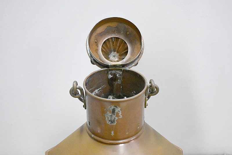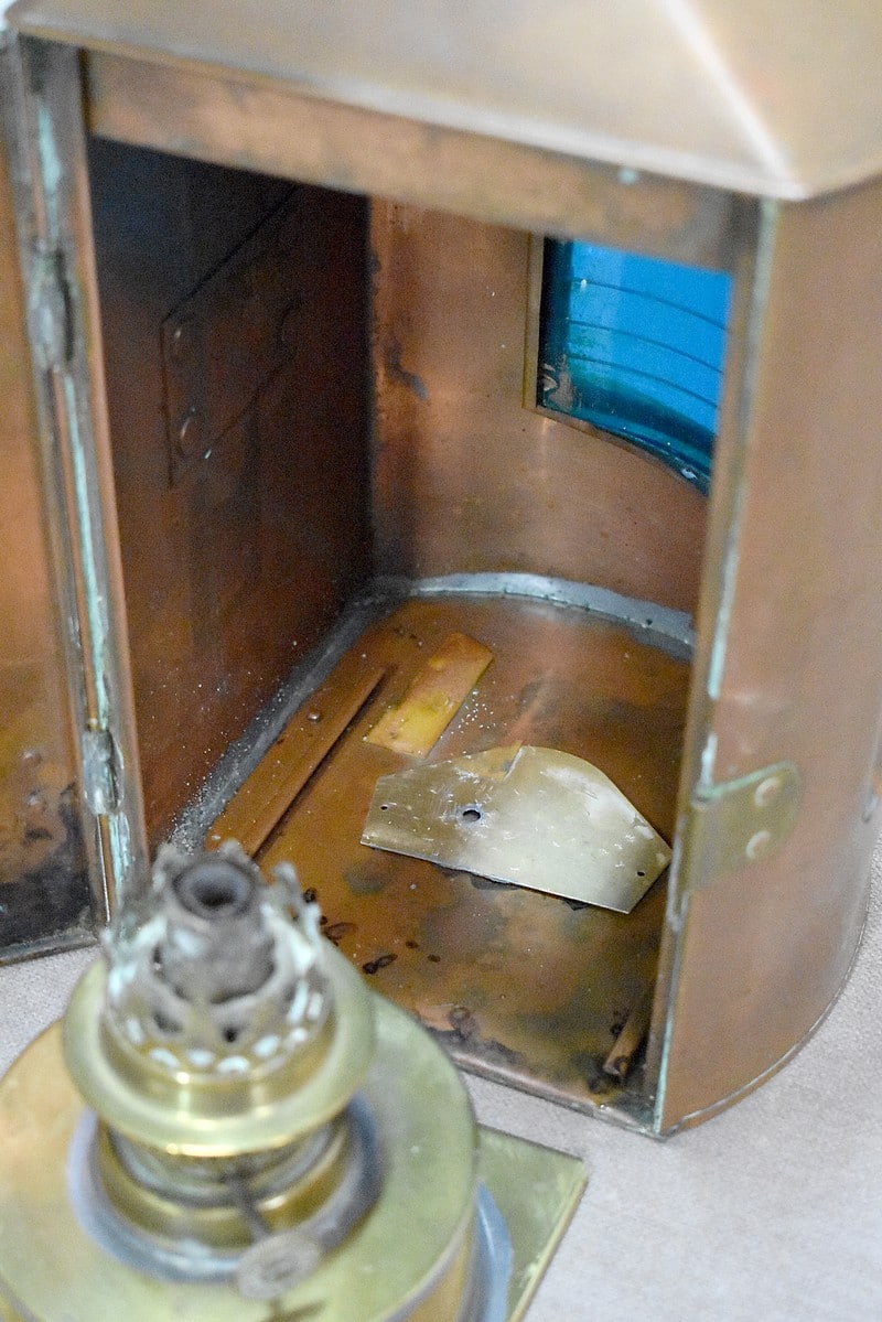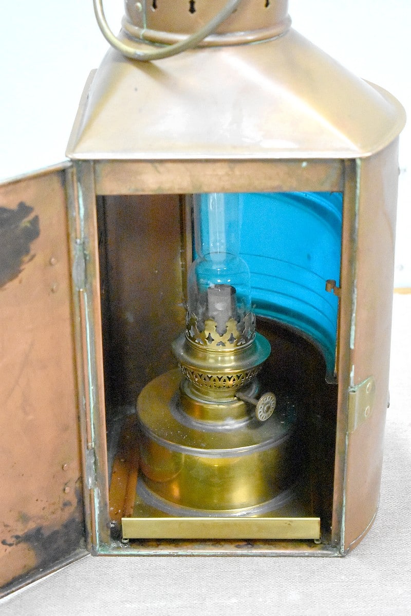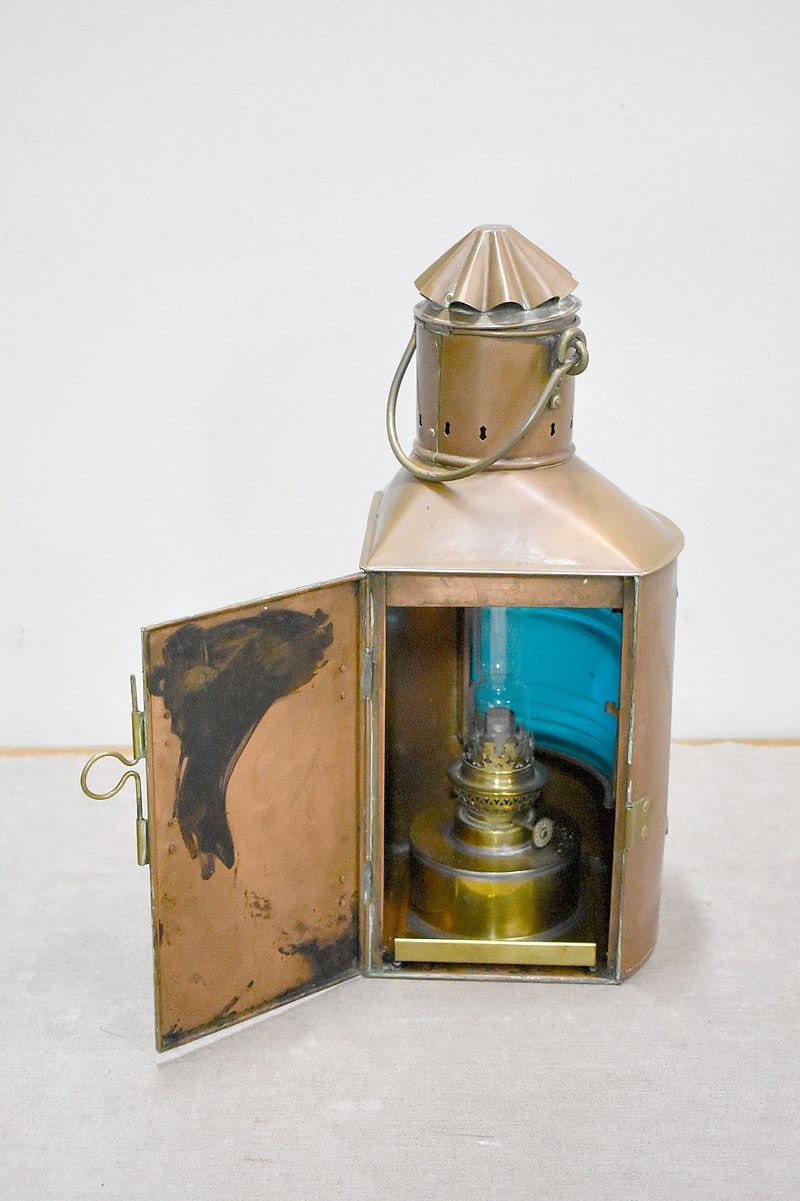 Elle ouvre également par un vantail sur le côté donnant sur l’intérieur. La lampe à pétrole qui se trouve à l’intérieur est fixée à un socle réservoir qui se glisse dans des encoches au fond de la lanterne.