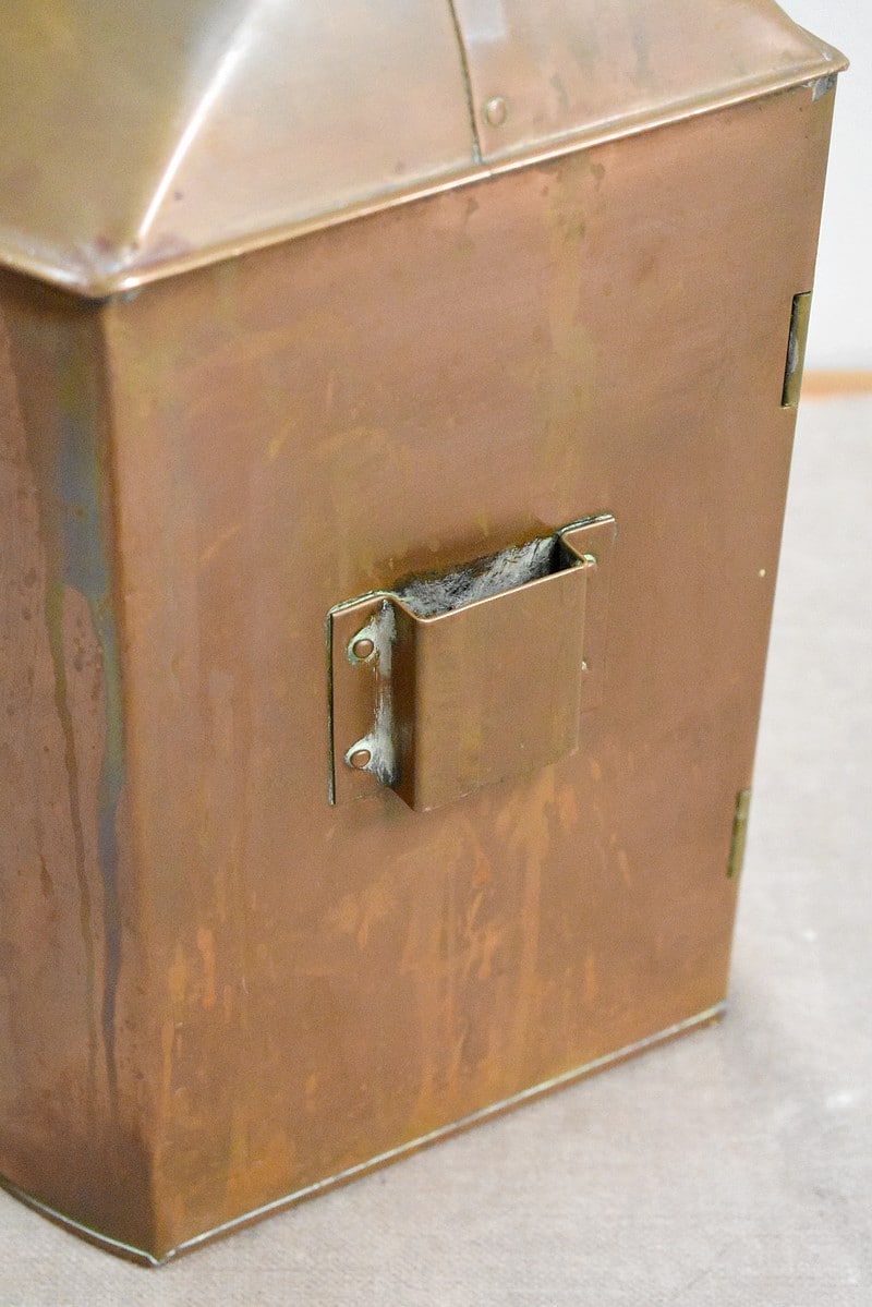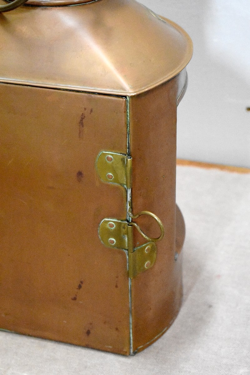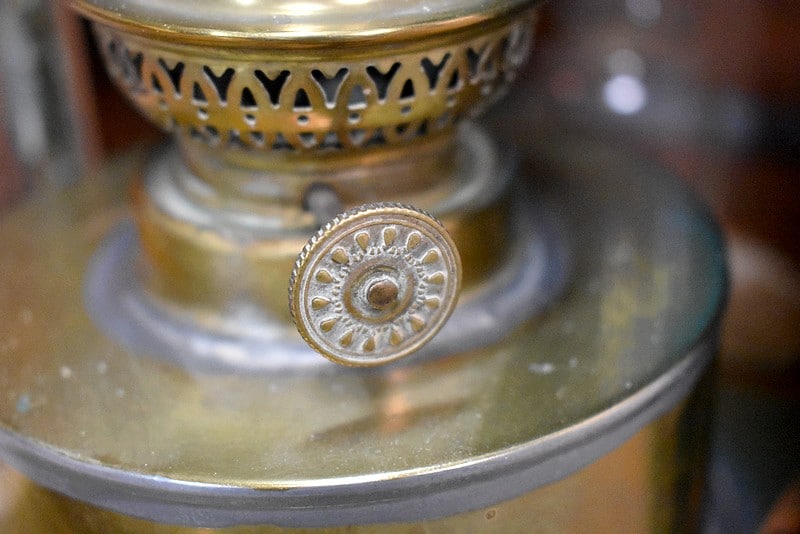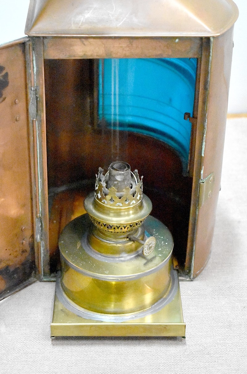 Elle ouvre également par un vantail sur le côté donnant sur l’intérieur. La lampe à pétrole qui se trouve à l’intérieur est fixée à un socle réservoir qui se glisse dans des encoches au fond de la lanterne.
