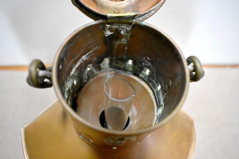 Elle ouvre sur le dessus par un petit couvercle coiffé d’un chapeau en collerette ouvrant sur le tube de verre qui est cassé.