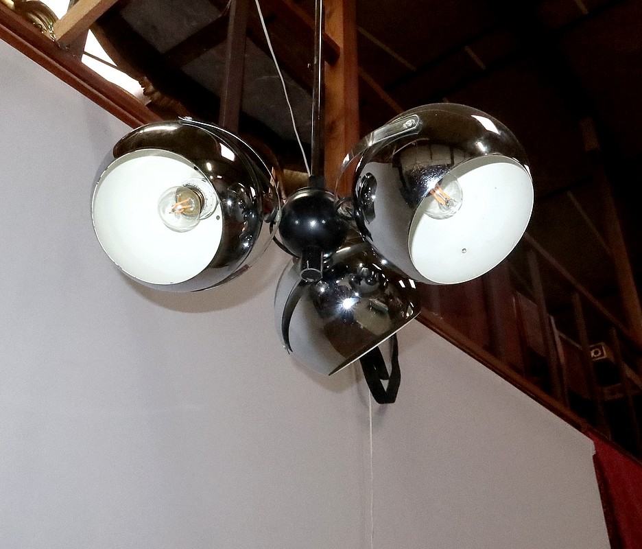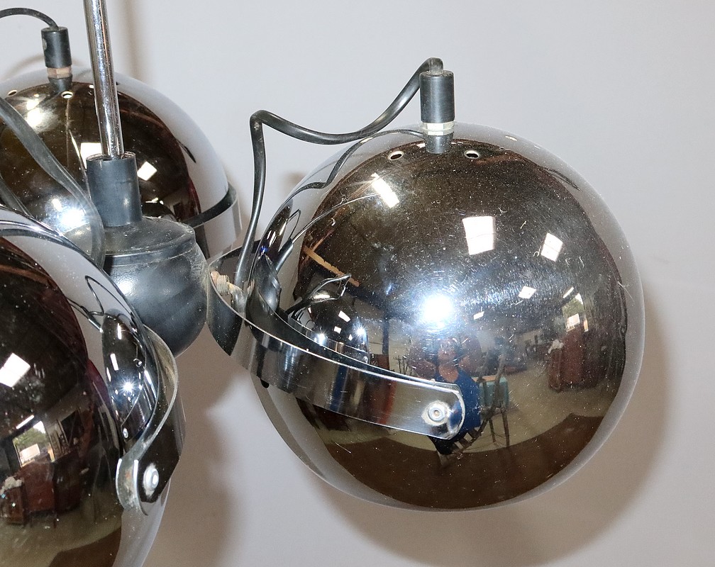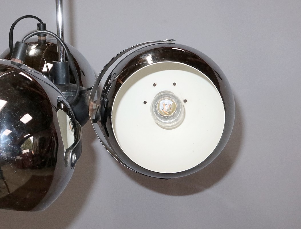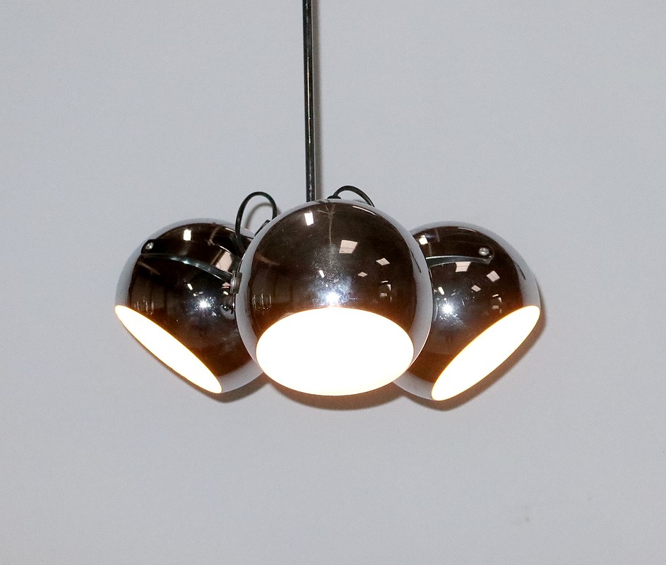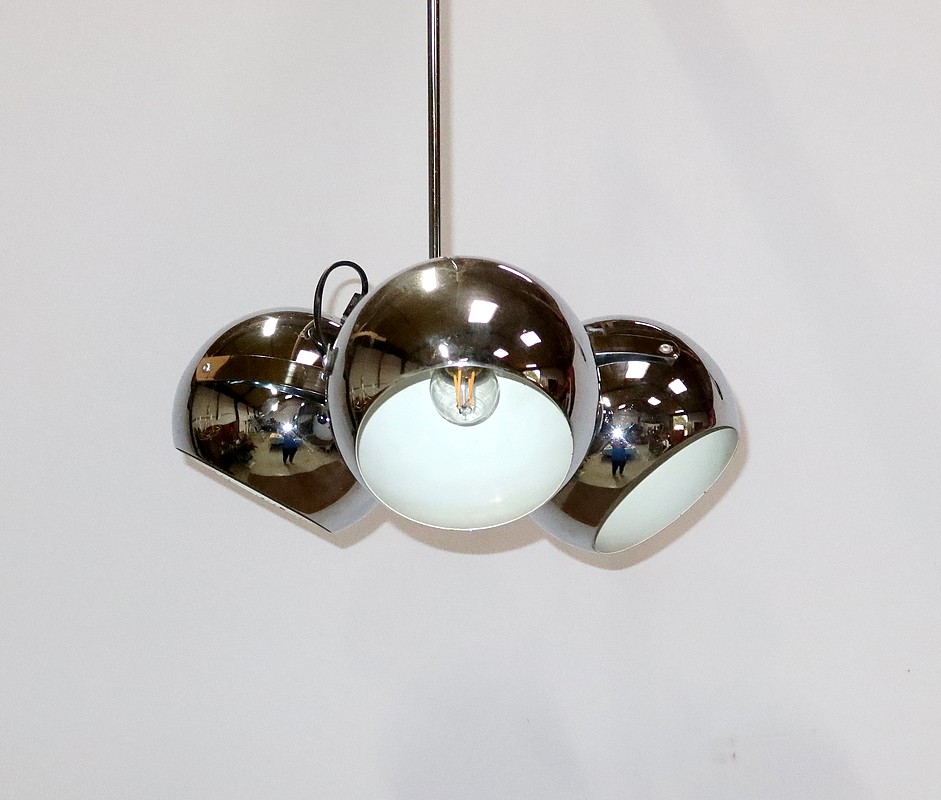 Lustre Eyeball des années 1960, muni de trois réflecteurs « boules » inclinables et pivotants en métal chromé.