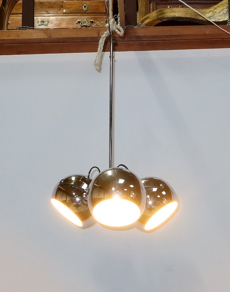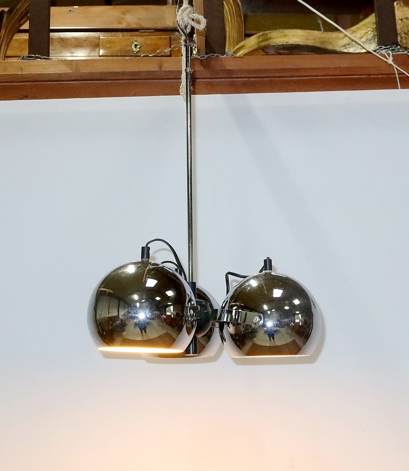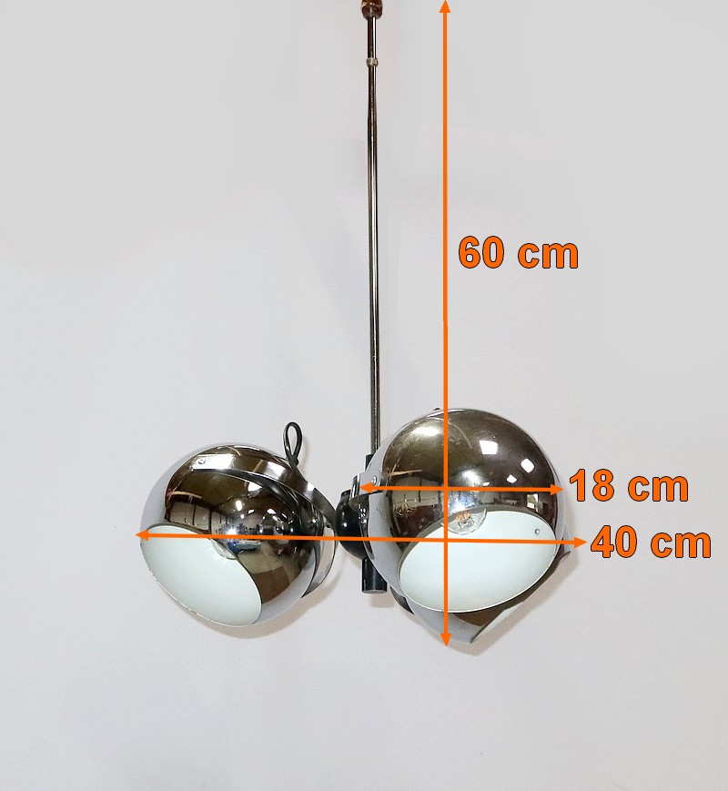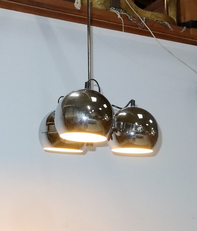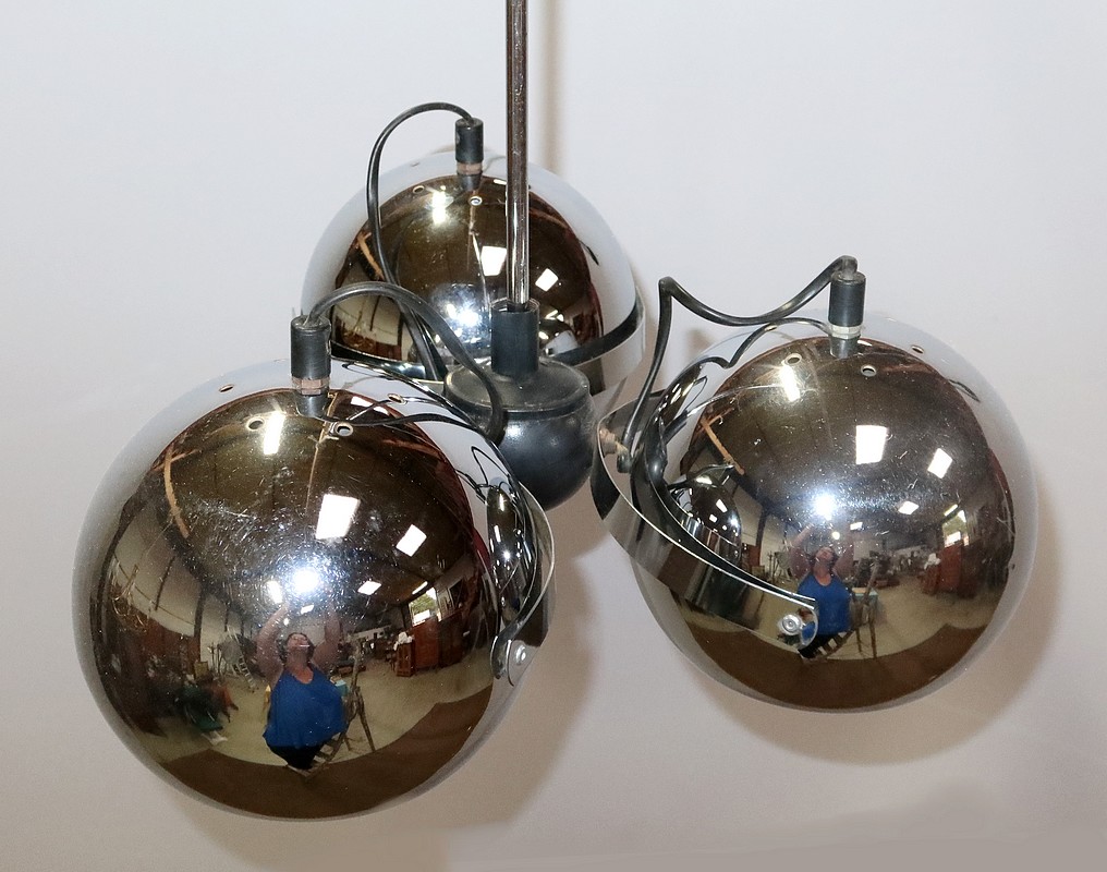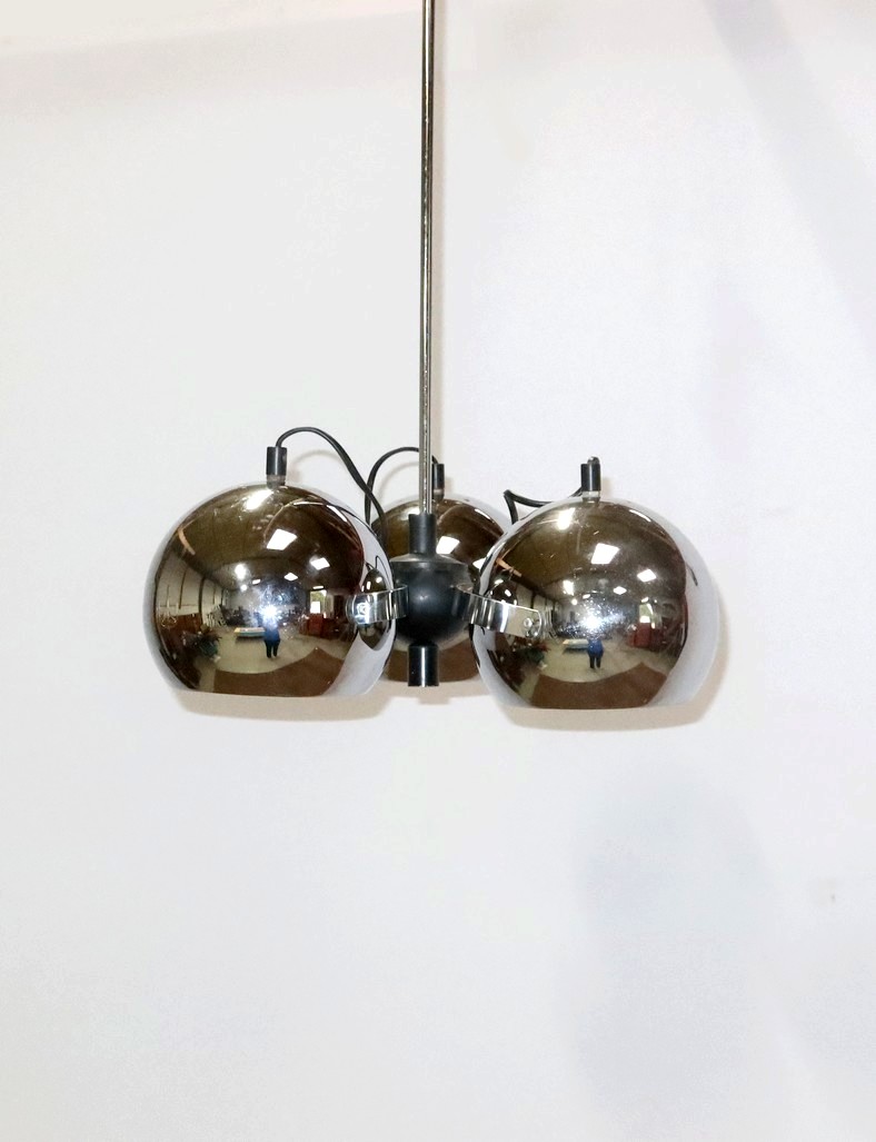 Lustre Eyeball des années 1960, muni de trois réflecteurs « boules » inclinables et pivotants en métal chromé.