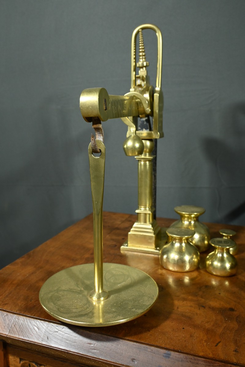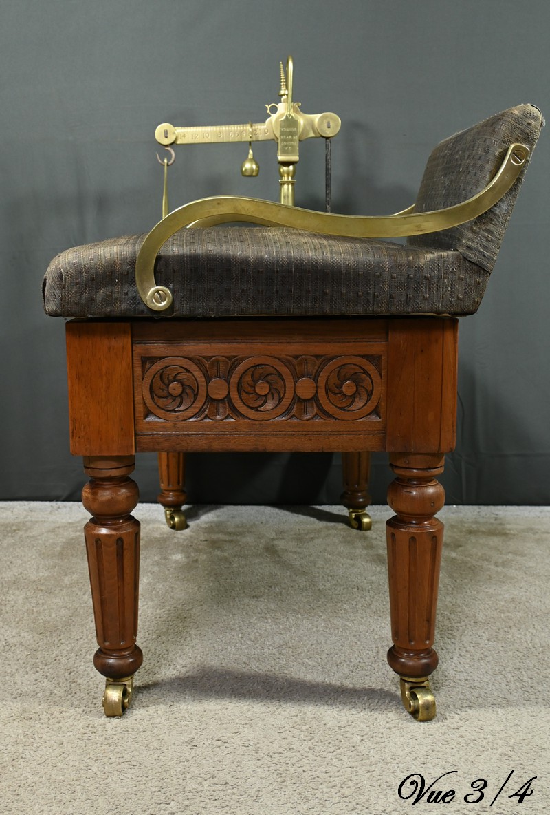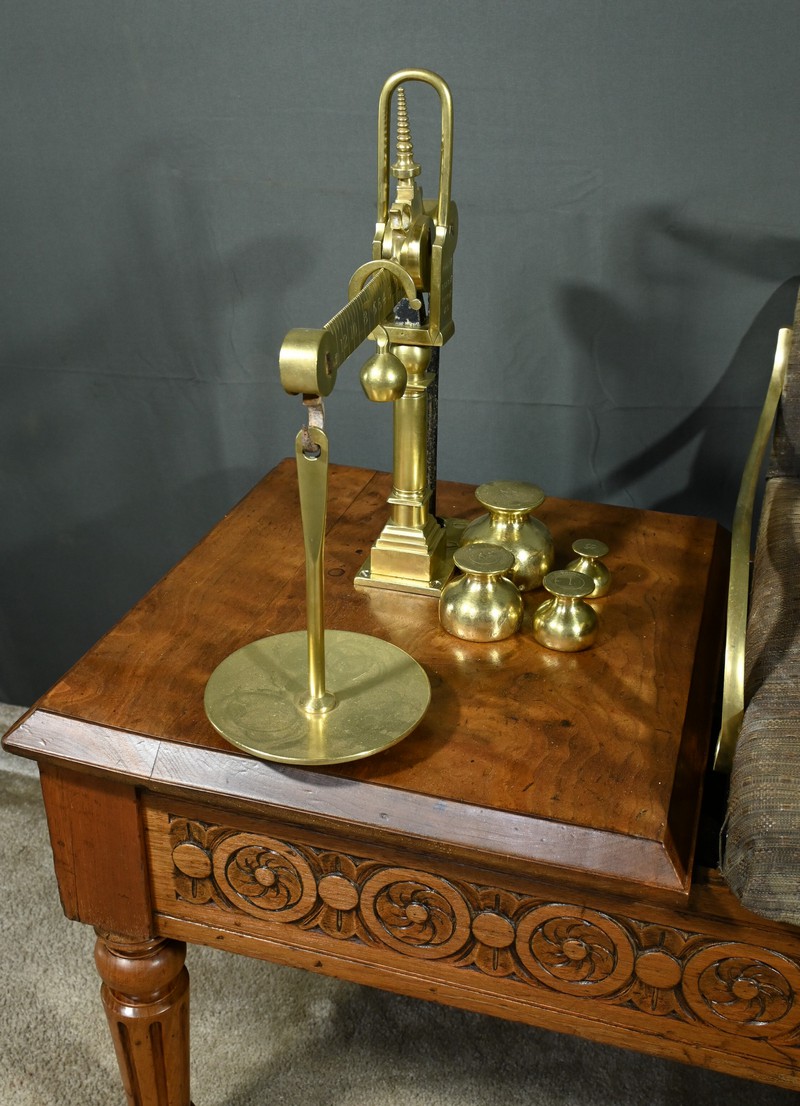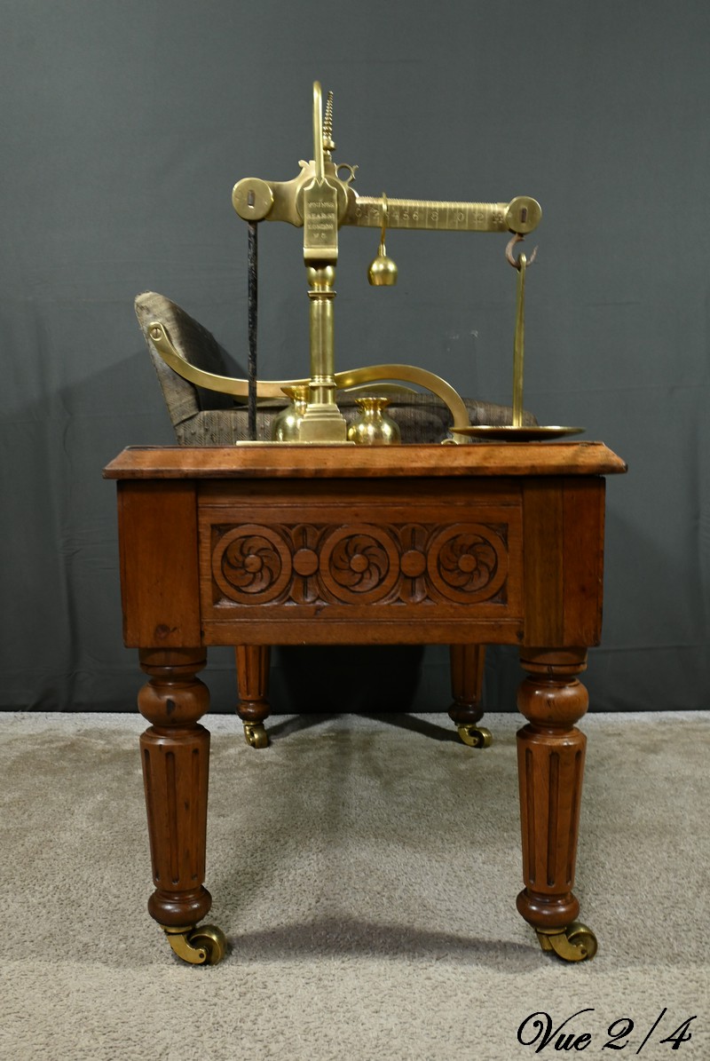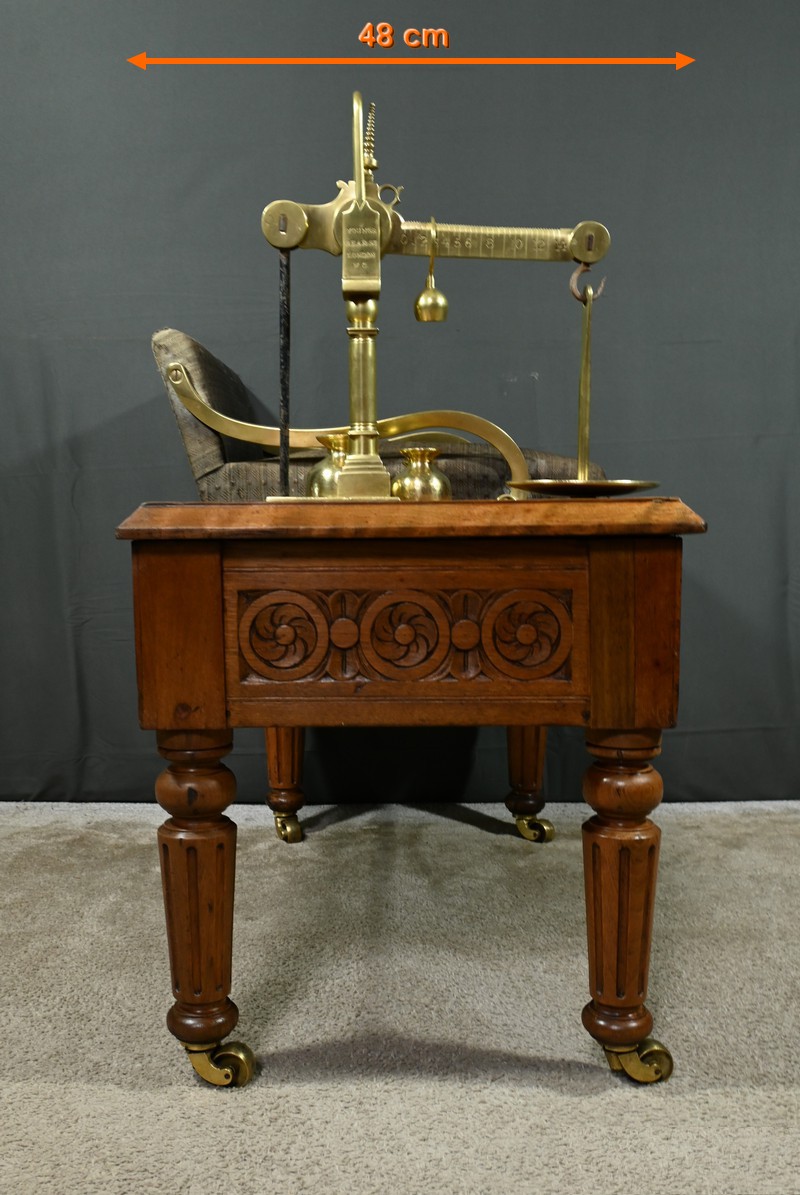 Cette balance se distingue par sa structure en chêne massif, typique de l’époque, avec un siège rembourré adjacent à une balance en laiton.