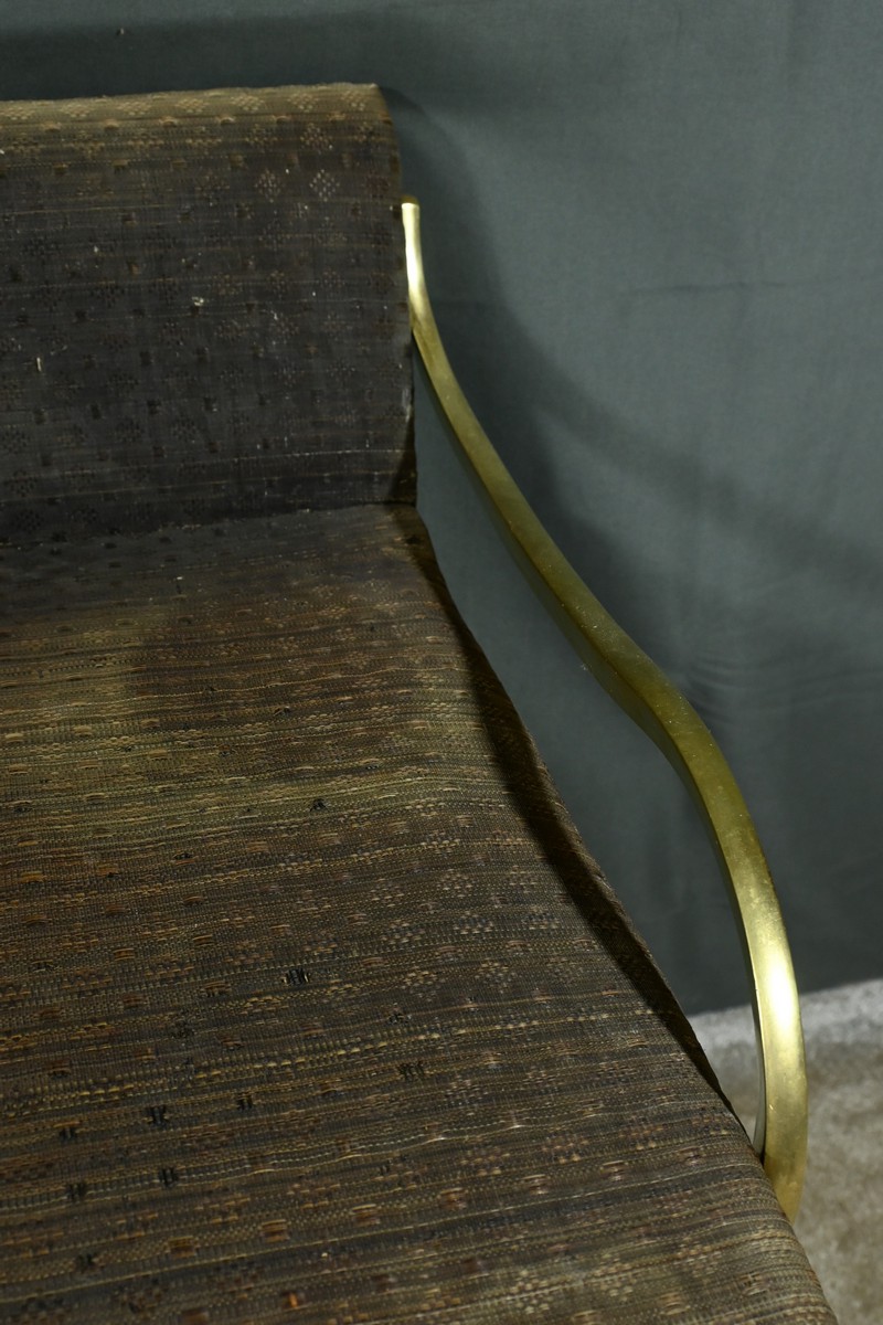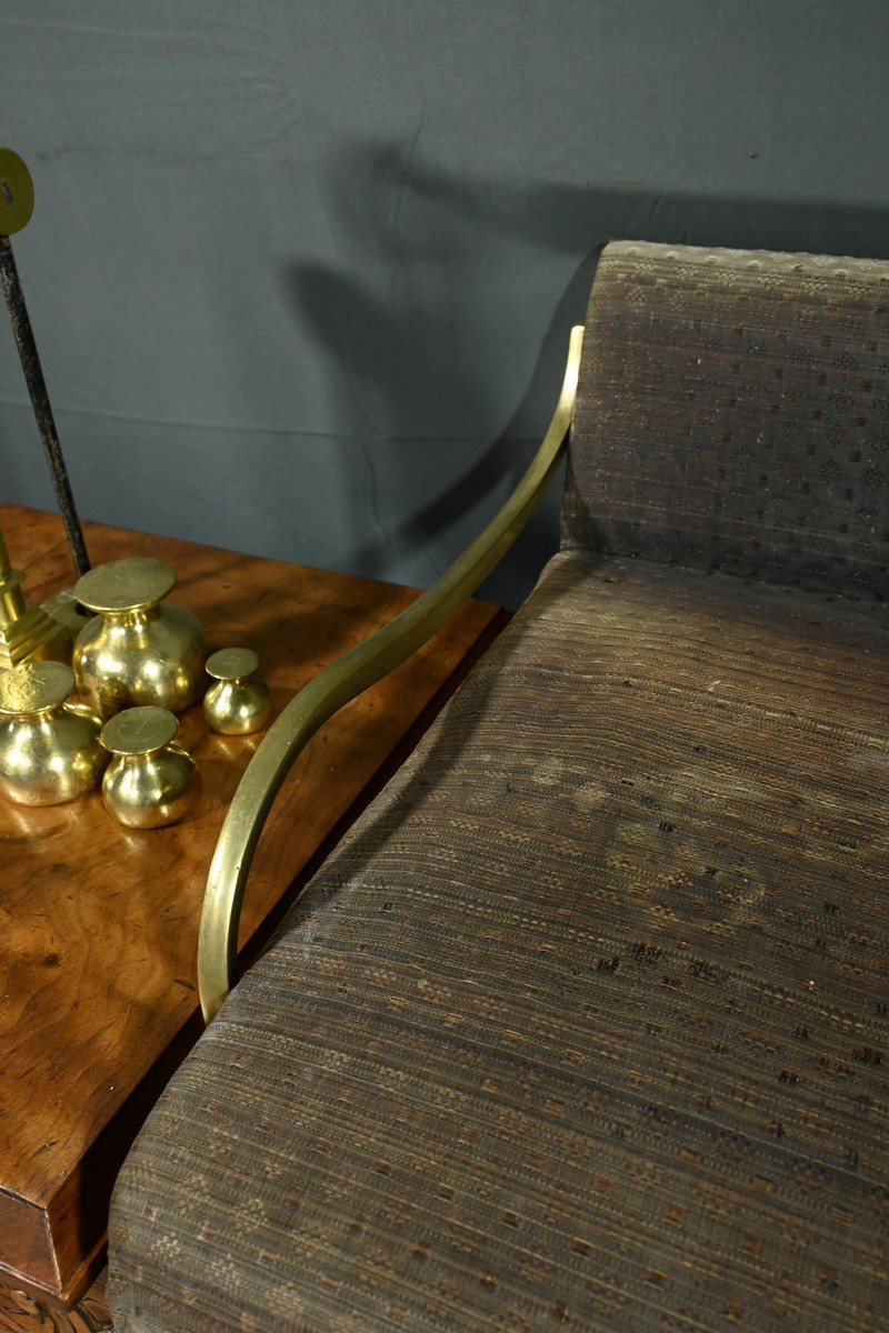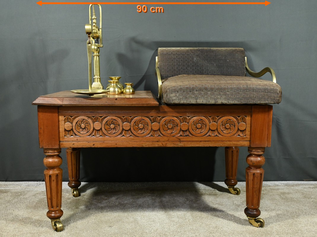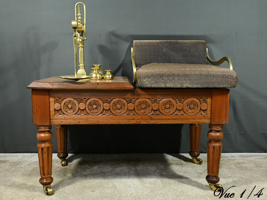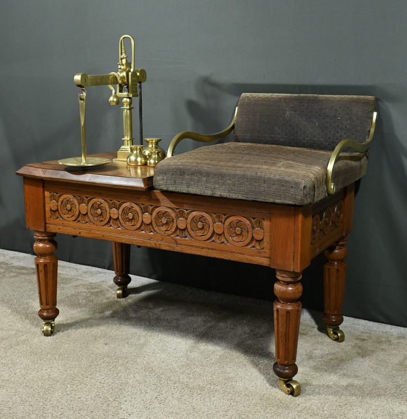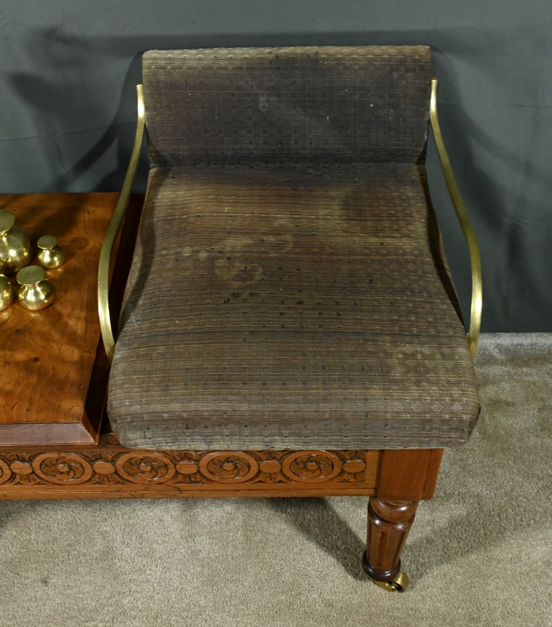 Cette balance se distingue par sa structure en chêne massif, typique de l’époque, avec un siège rembourré adjacent à une balance en laiton.