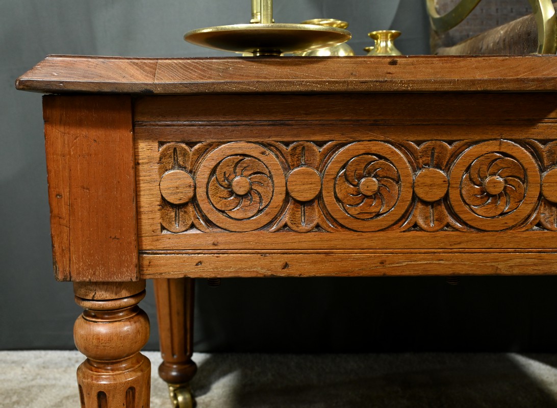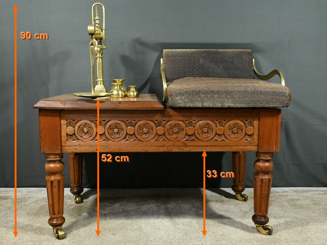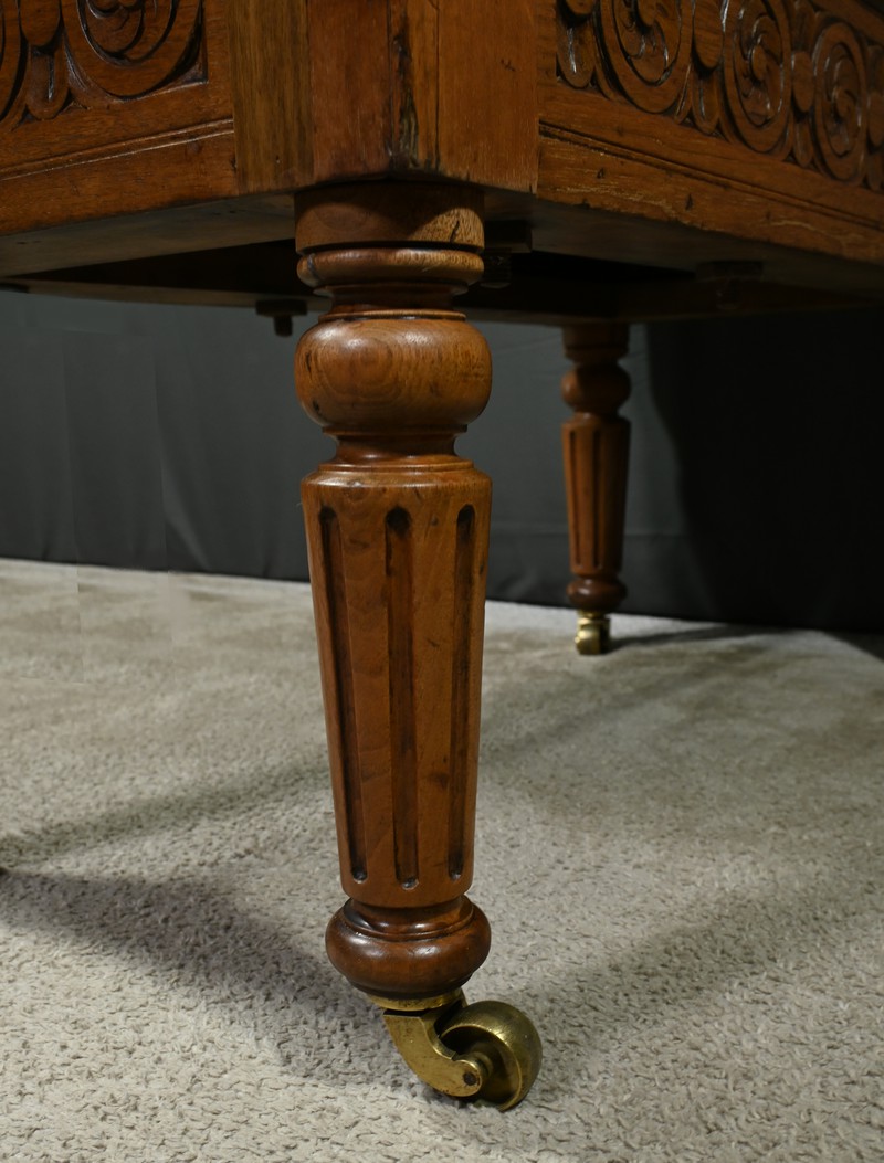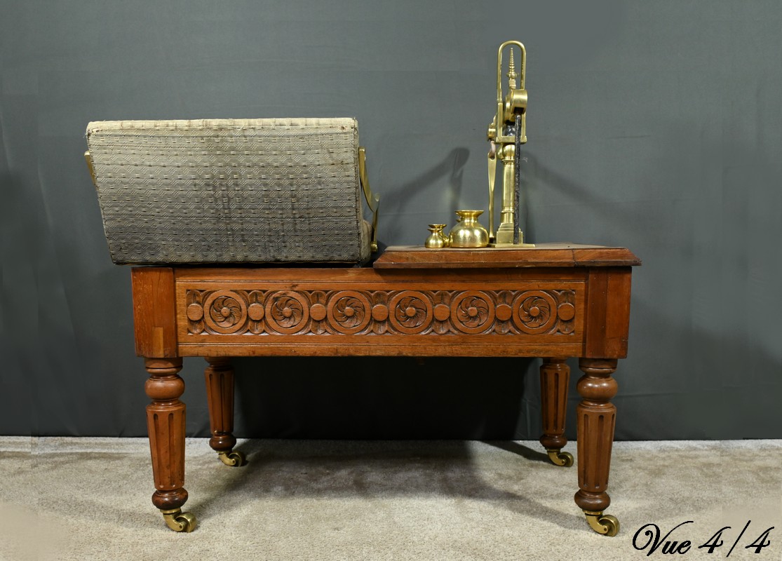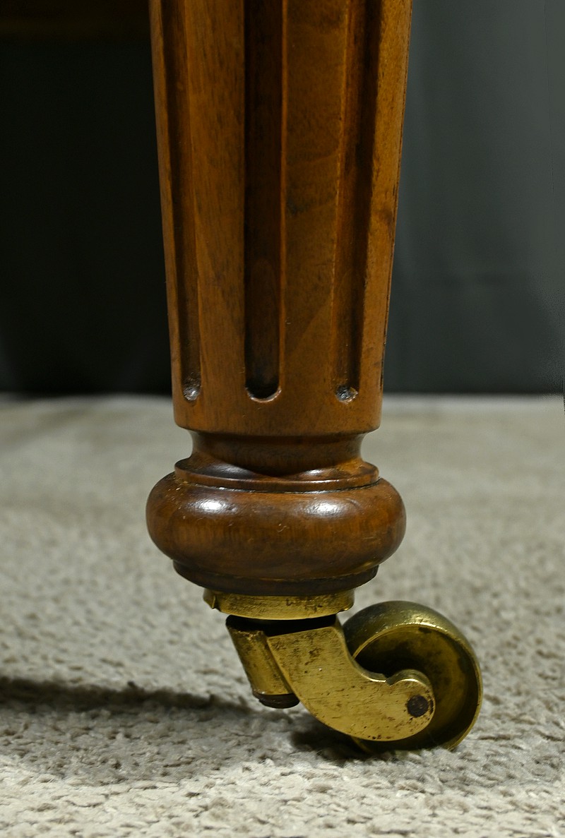 Les quatre pieds tournés et cannelés, se terminant par des roulettes en laiton, assurent à la fois stabilité et mobilité.