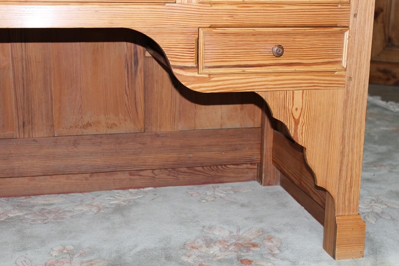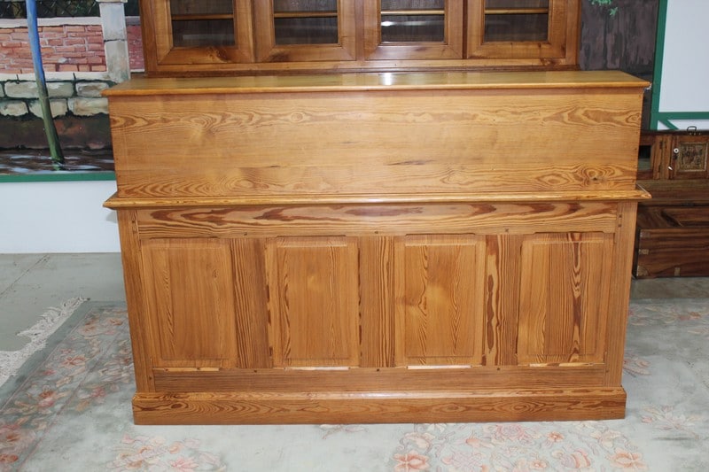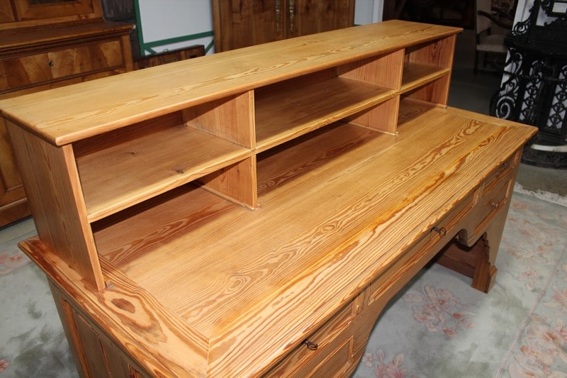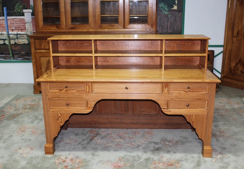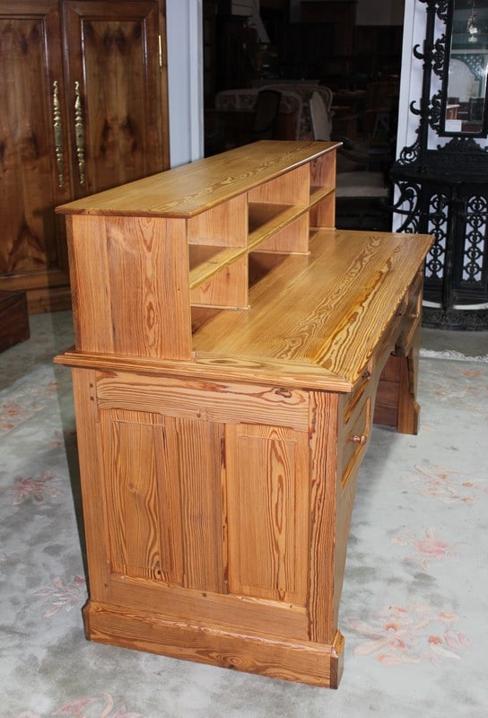 Bureau comptoir de commerce en pitchpin blond, ouvrant par 1 tiroir central et 2 tiroirs de chaque côté , les 3 du haut fermant à clé. Le plan de travail est rehaussé par un élément à 6 casiers pouvant se retirer. Finition cirée après décapage.