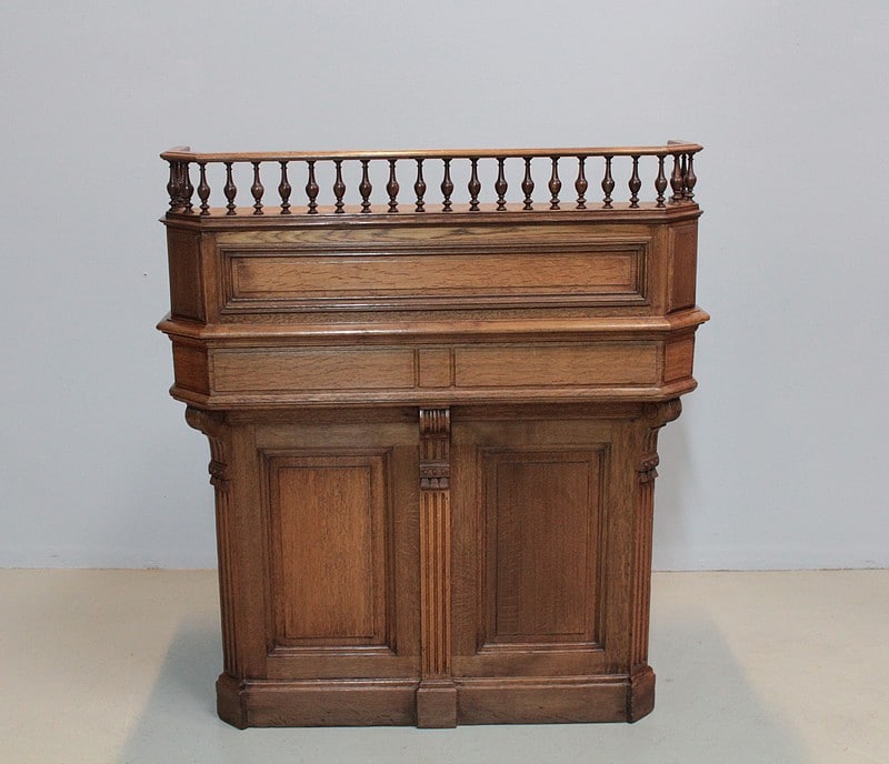 Caisse-comptoir de commerce en chêne , sa façade est moulurée et décorée de consoles à cannelures.