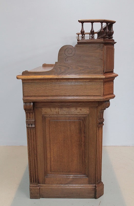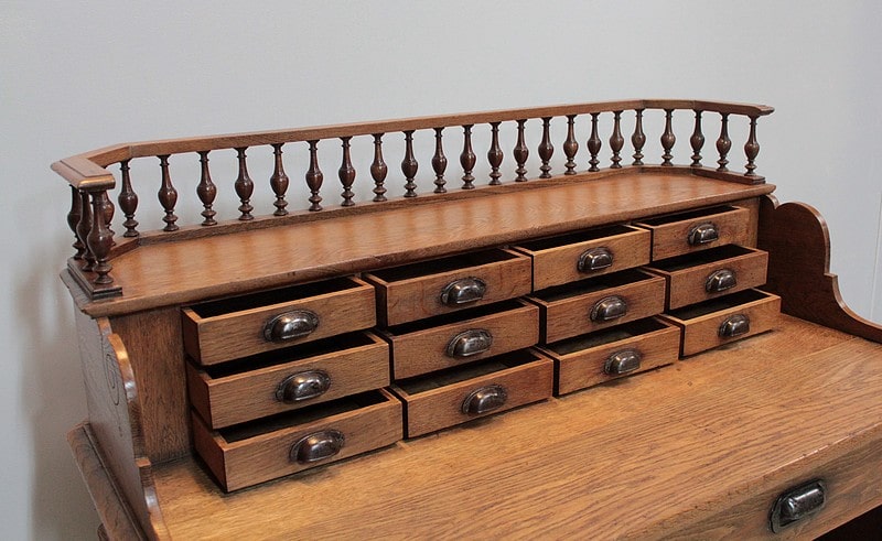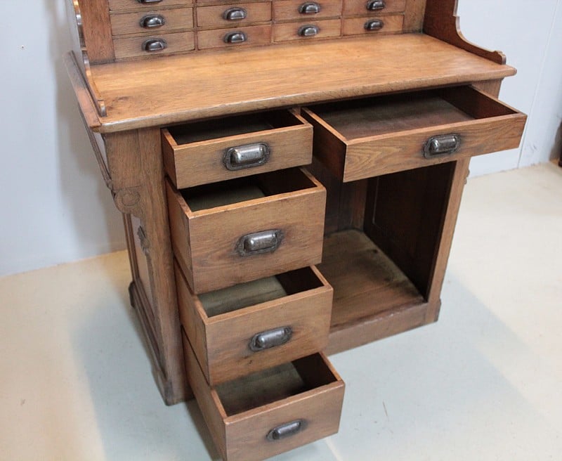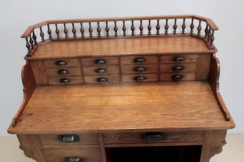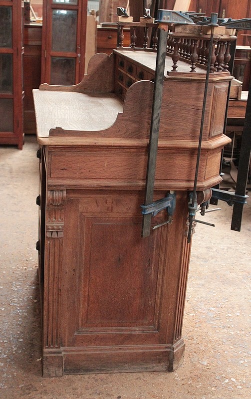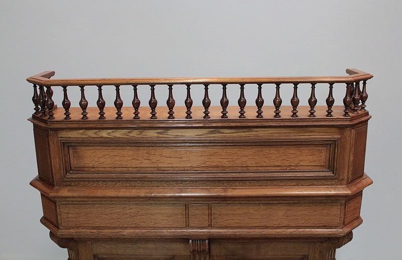 La partie haute, en gradin, ouvre par 12 petits tiroirs , elle est surmontée d’une galerie à décor de fuseaux.