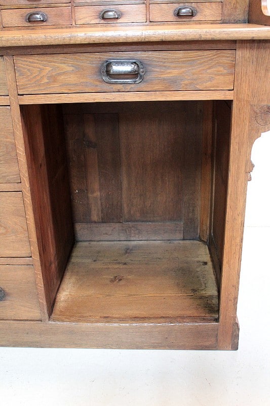 La partie basse ouvre par un grand tiroir à droite avec casier en dessous et 4 tiroirs à gauche, tous garnis de poignée ‘coquille’