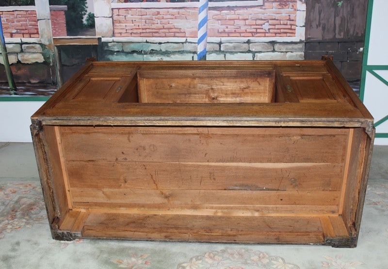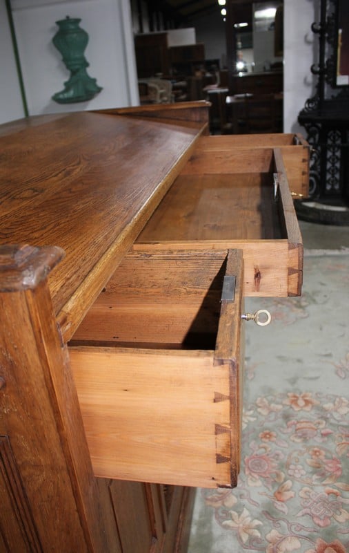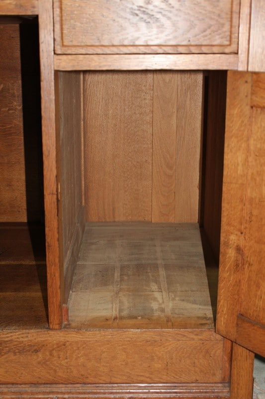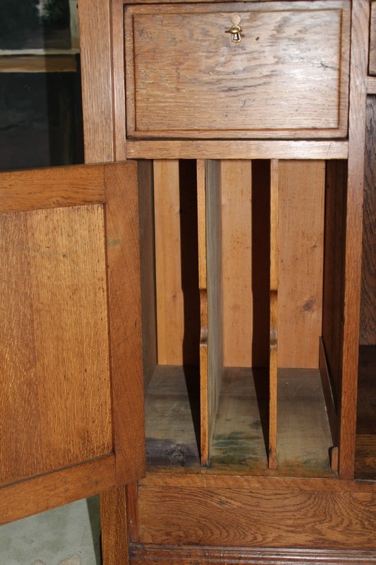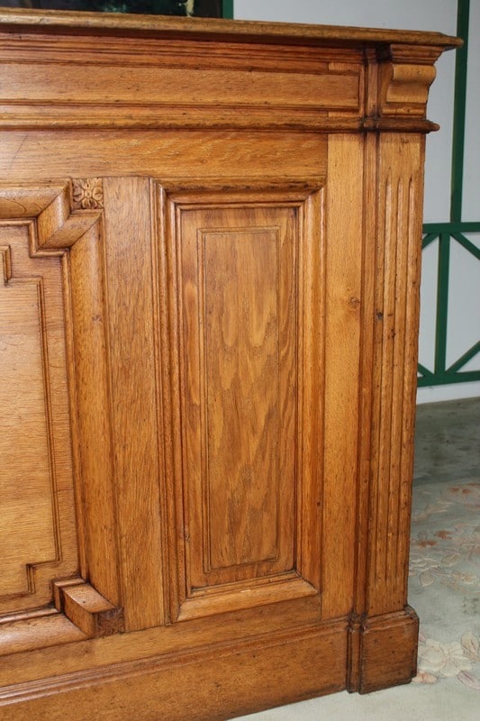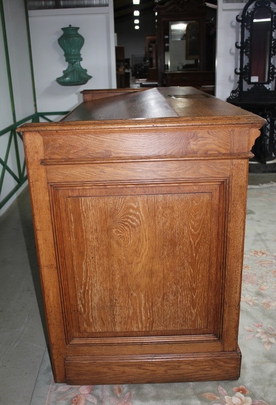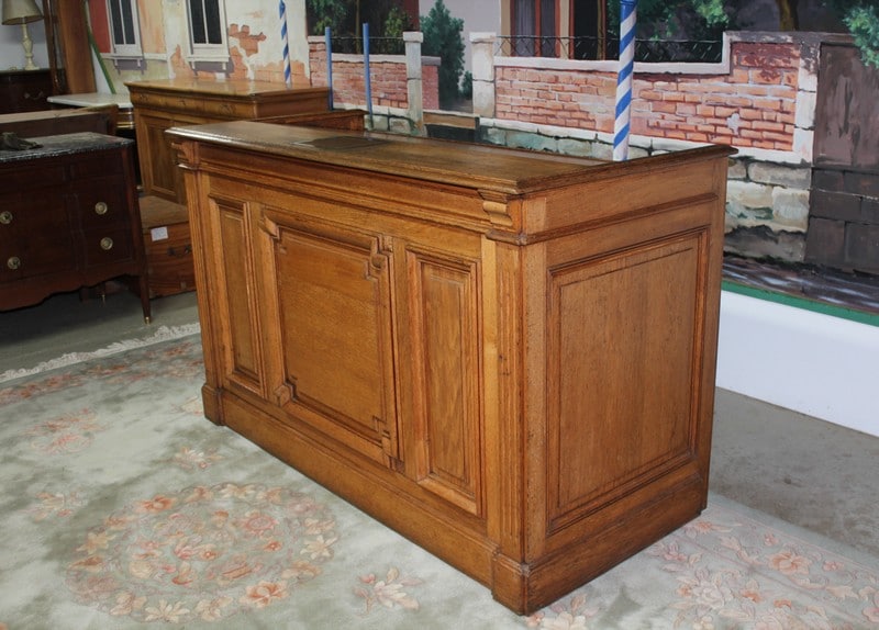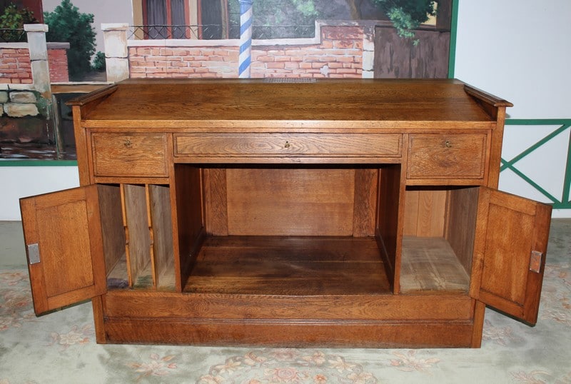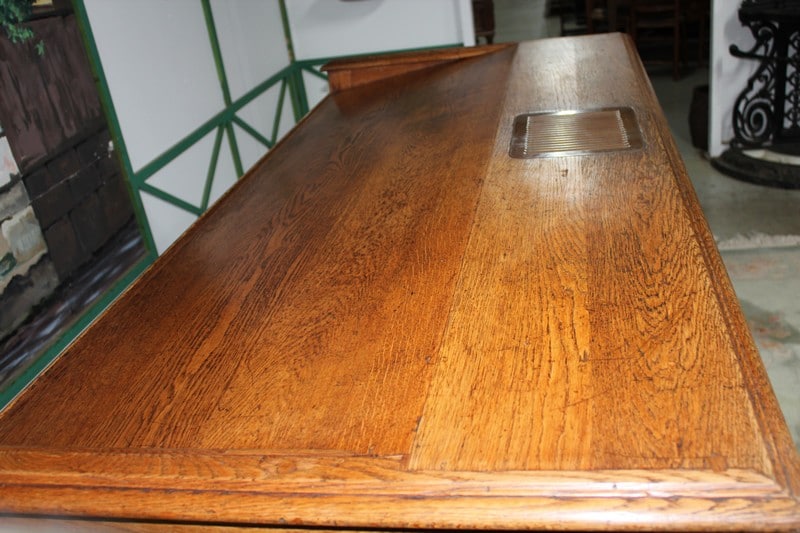 Grand comptoir de commerce formant pupitre en chêne doré. En façade 3 panneaux moulurés, celui de milieu à découpes grecques. Sur le dessus, en plan incliné aux trois-quarts, une plaque de cuivre pour la monnaie. A l’arrière, il ouvre par 3 tiroirs et 2 portes latérales.