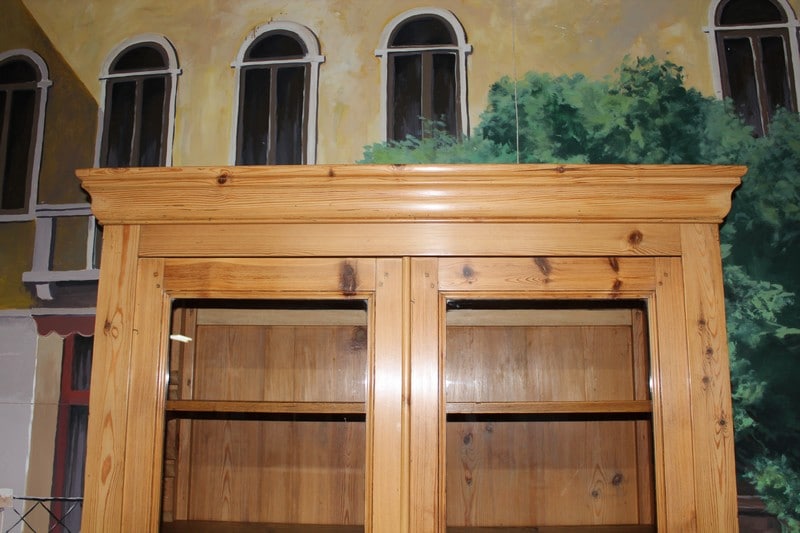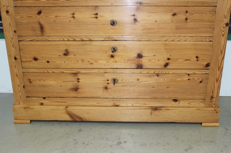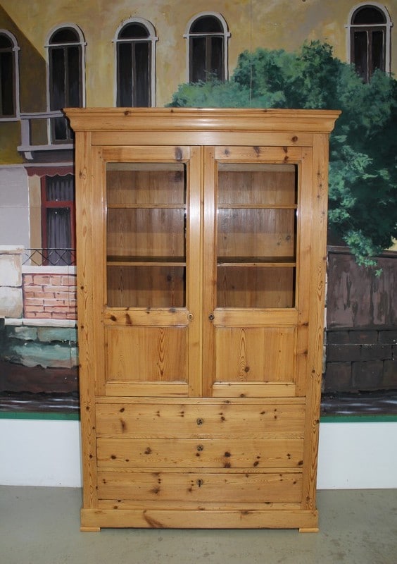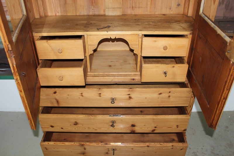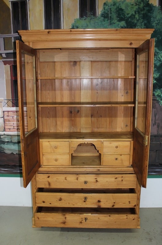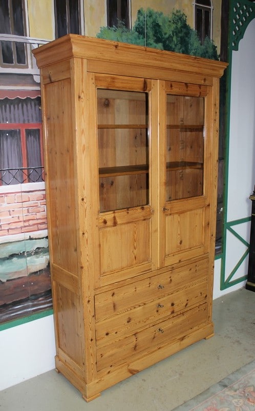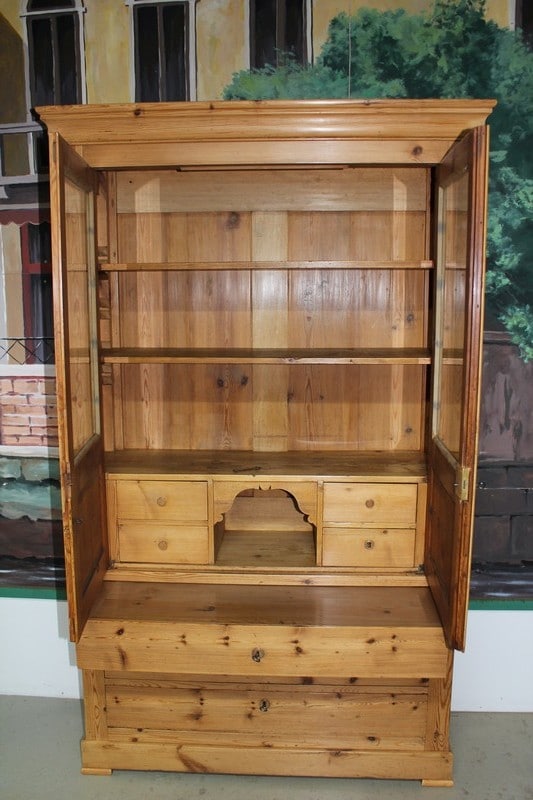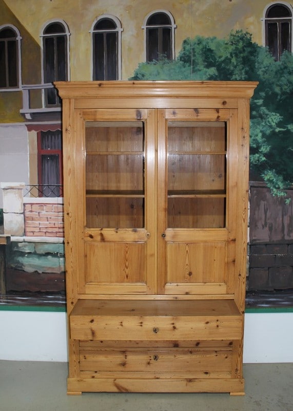 Bibliothèque Commode Écritoire de commerce en pitchpin blond finition cirée ouvrant à 2 portes vitrées en partie haute et 3 tiroirs en partie basse. Une tirette coulisse sur le 1er tiroir pour former un écritoire. L’intérieur est garni de petits tiroirs dont un ferme à clé. Époque 1900.