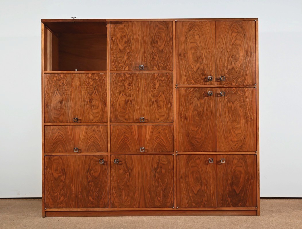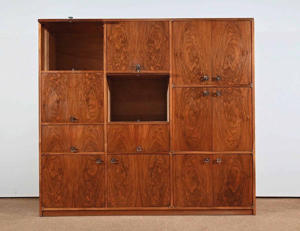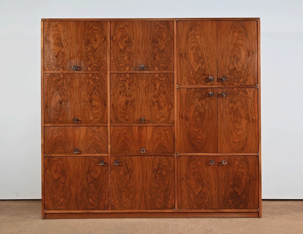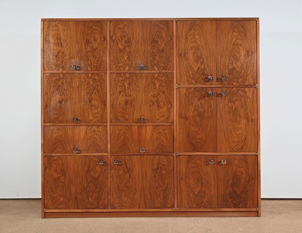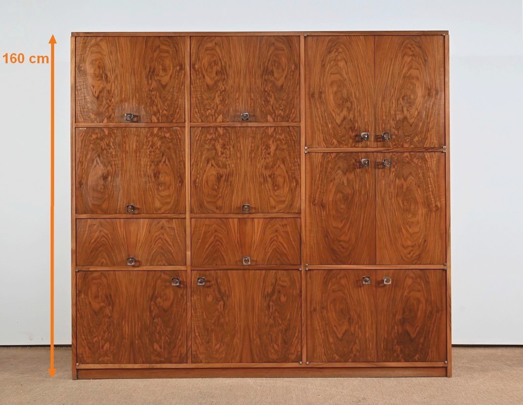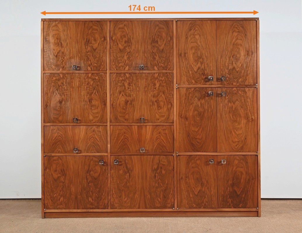 Exceptionnel Meuble de rangement en noyer massif et plaqué, datant des années 1970, présentant onze espaces de rangement derrière des portes, au placage symétrique, dont six sont à bascule, deux sont simples et trois sont doubles. Ces dernières s’ouvrent sur des briquets métalliques déportés. Tous ces ouvrants sont munis de poignées de tirage rectangulaires en métal chromé et comportent un intérieur en placage d’acajou.
