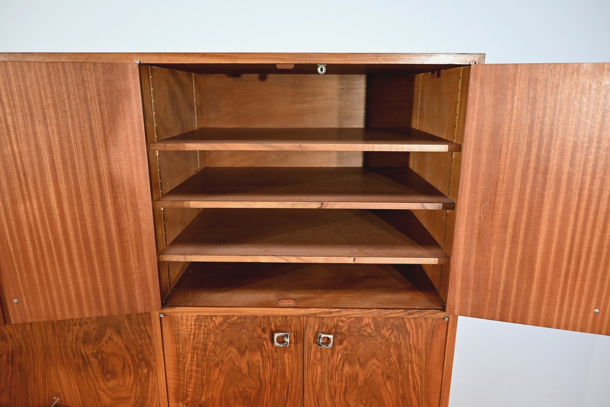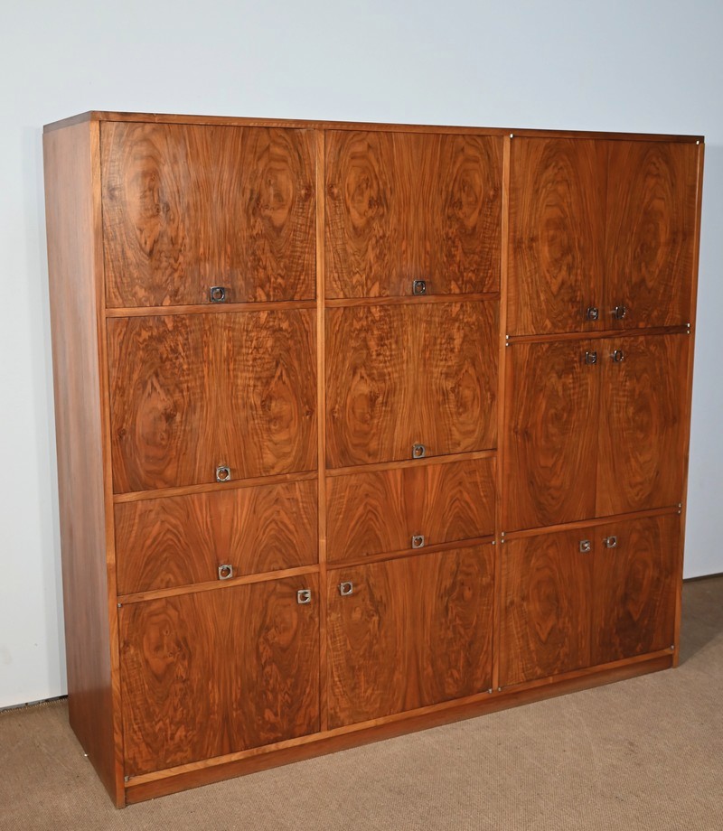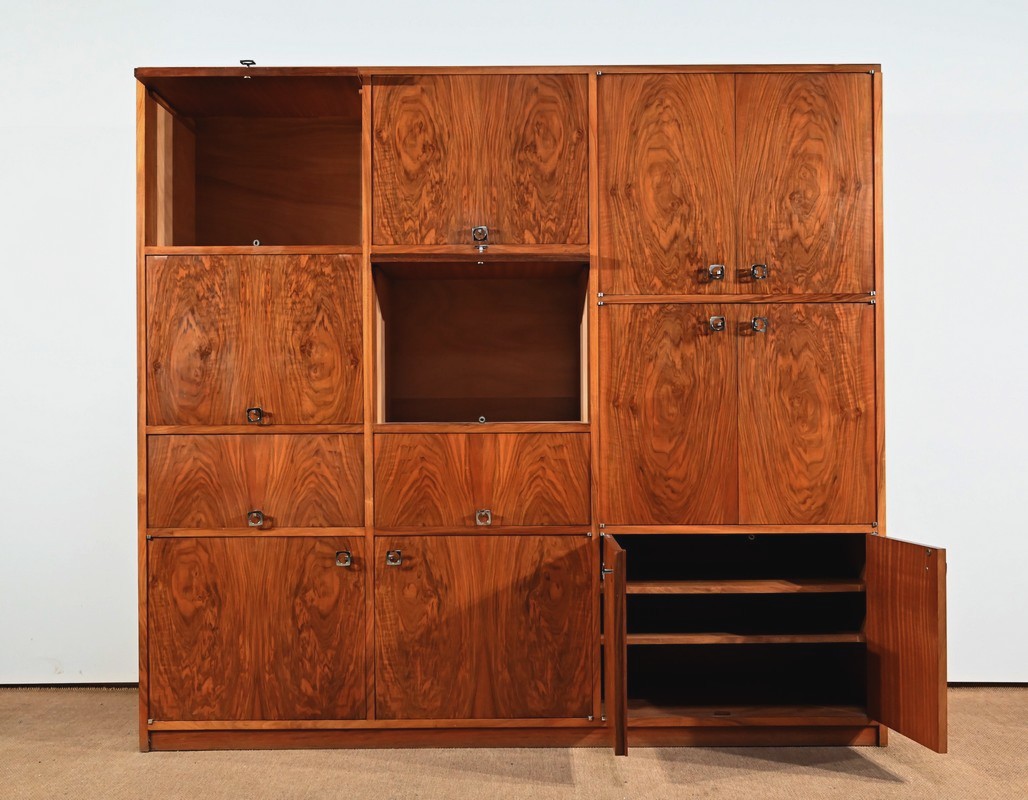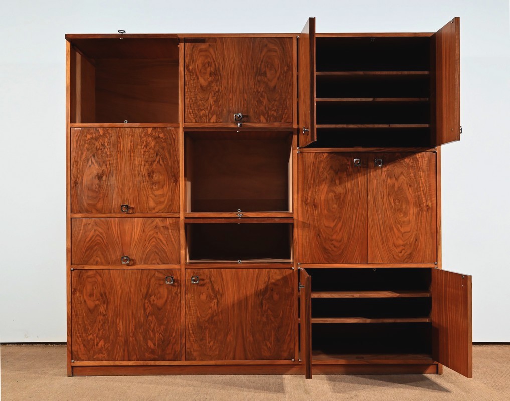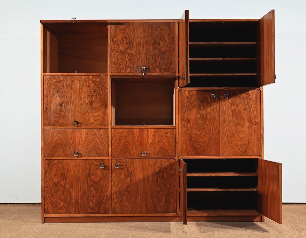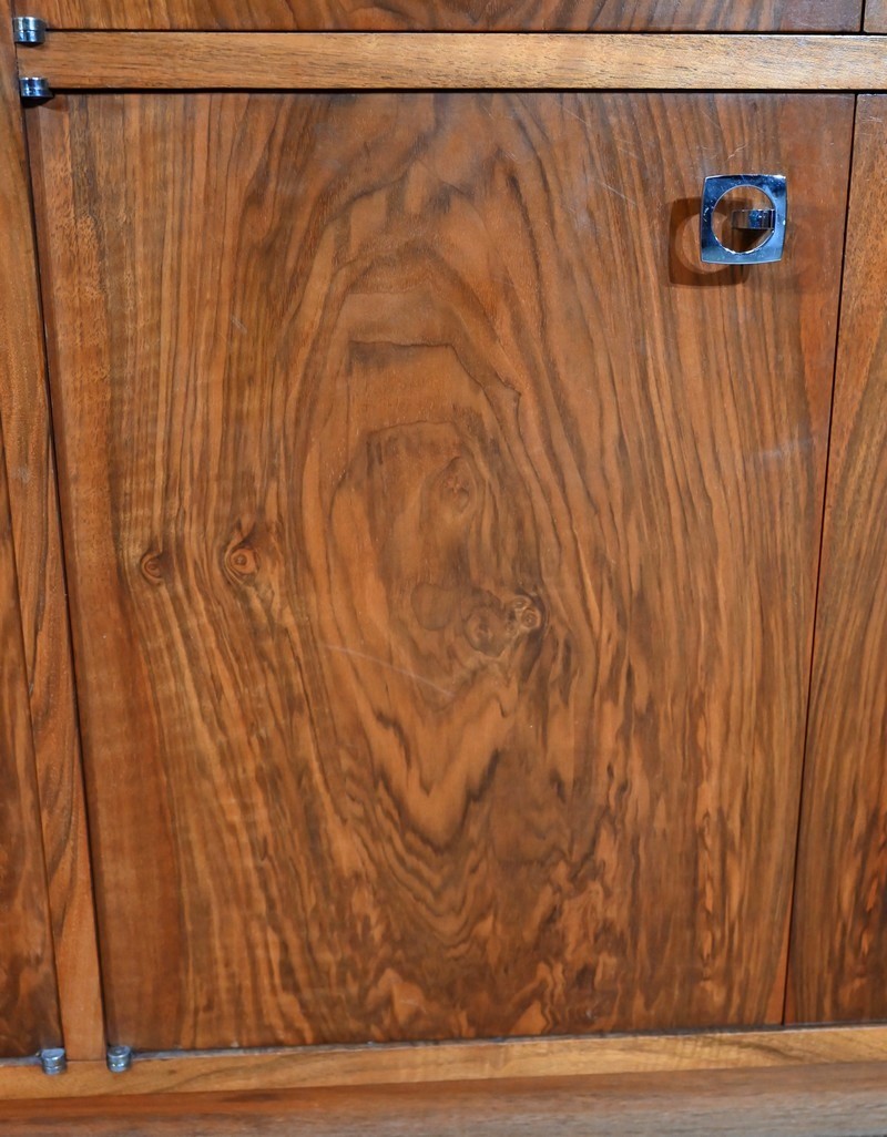 Exceptionnel Meuble de rangement en noyer massif et plaqué, datant des années 1970, présentant onze espaces de rangement derrière des portes, au placage symétrique, dont six sont à bascule, deux sont simples et trois sont doubles. Ces dernières s’ouvrent sur des briquets métalliques déportés. Tous ces ouvrants sont munis de poignées de tirage rectangulaires en métal chromé et comportent un intérieur en placage d’acajou.