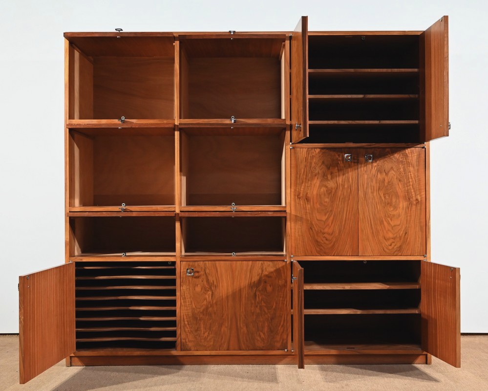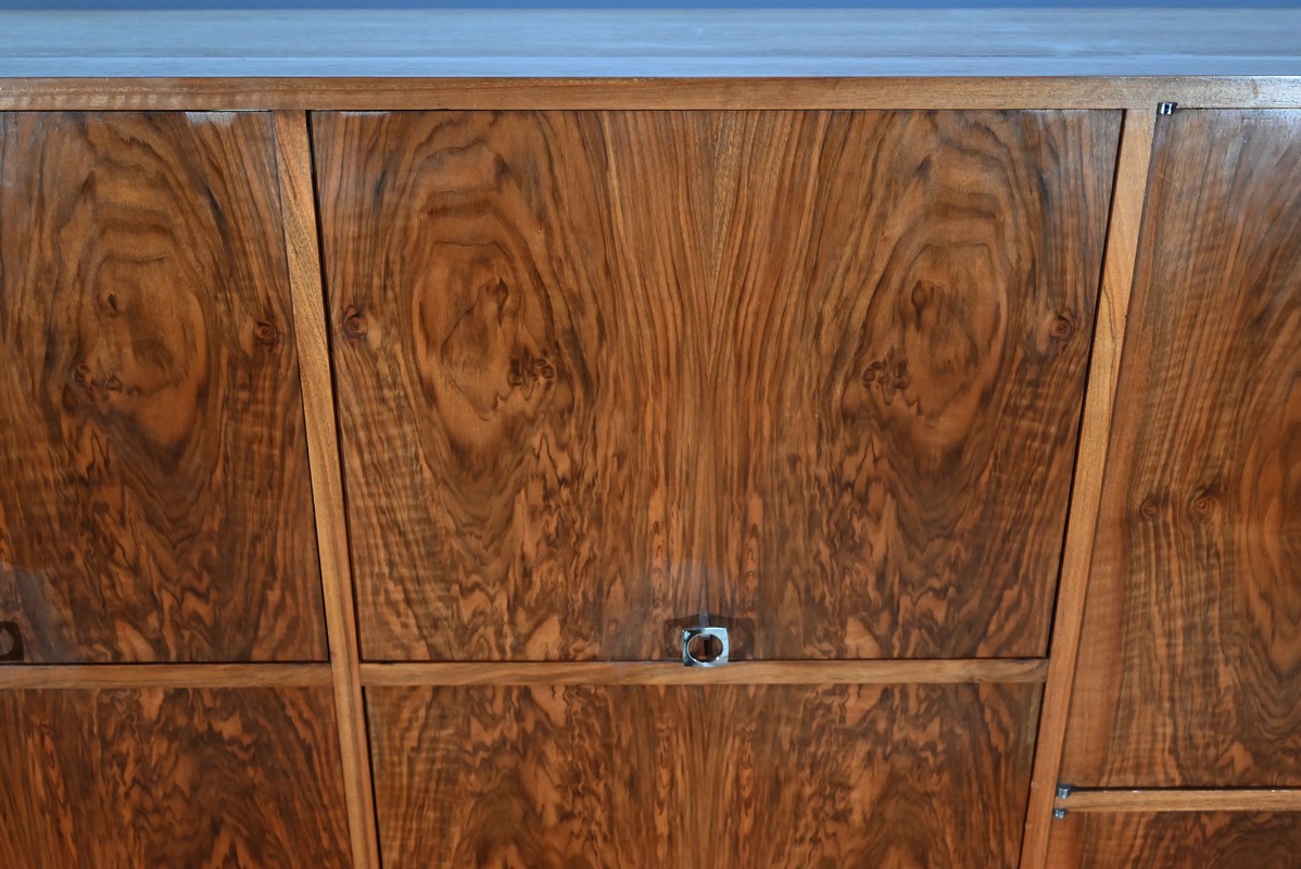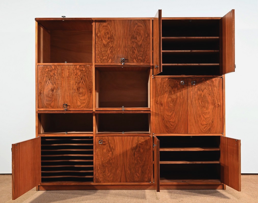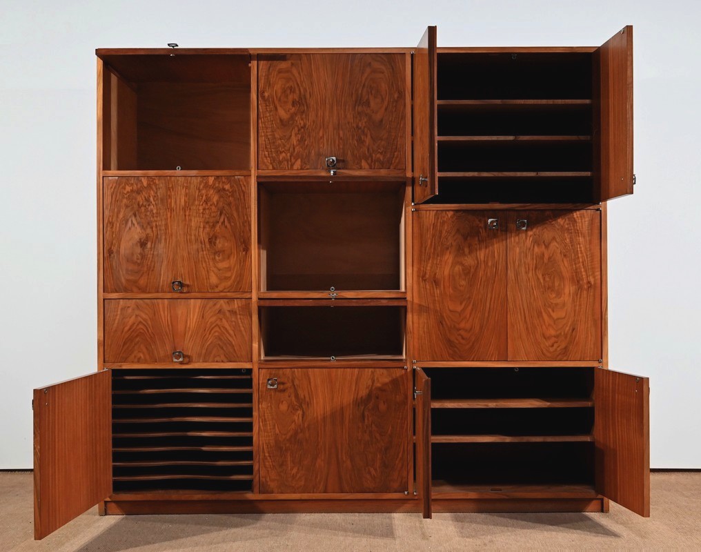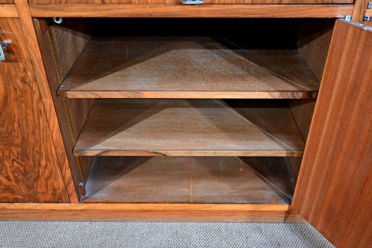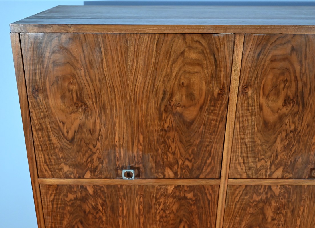 Exceptionnel Meuble de rangement en noyer massif et plaqué, datant des années 1970, présentant onze espaces de rangement derrière des portes, au placage symétrique, dont six sont à bascule, deux sont simples et trois sont doubles. Ces dernières s’ouvrent sur des briquets métalliques déportés. Tous ces ouvrants sont munis de poignées de tirage rectangulaires en métal chromé et comportent un intérieur en placage d’acajou.