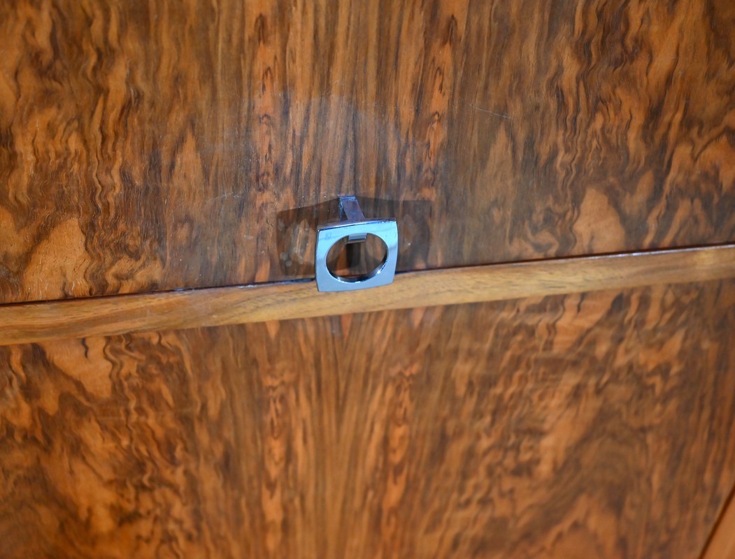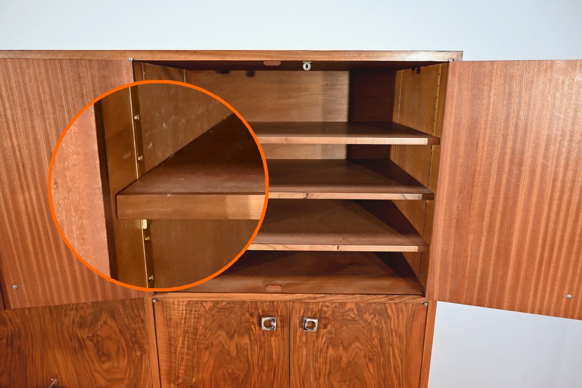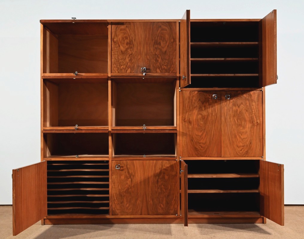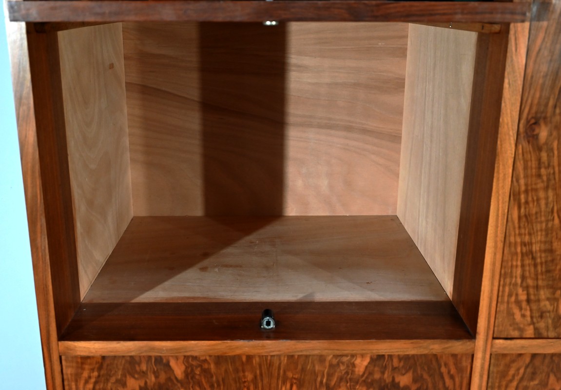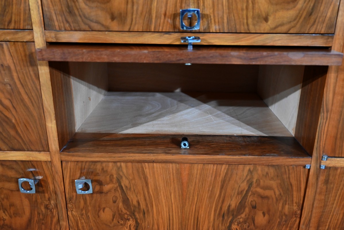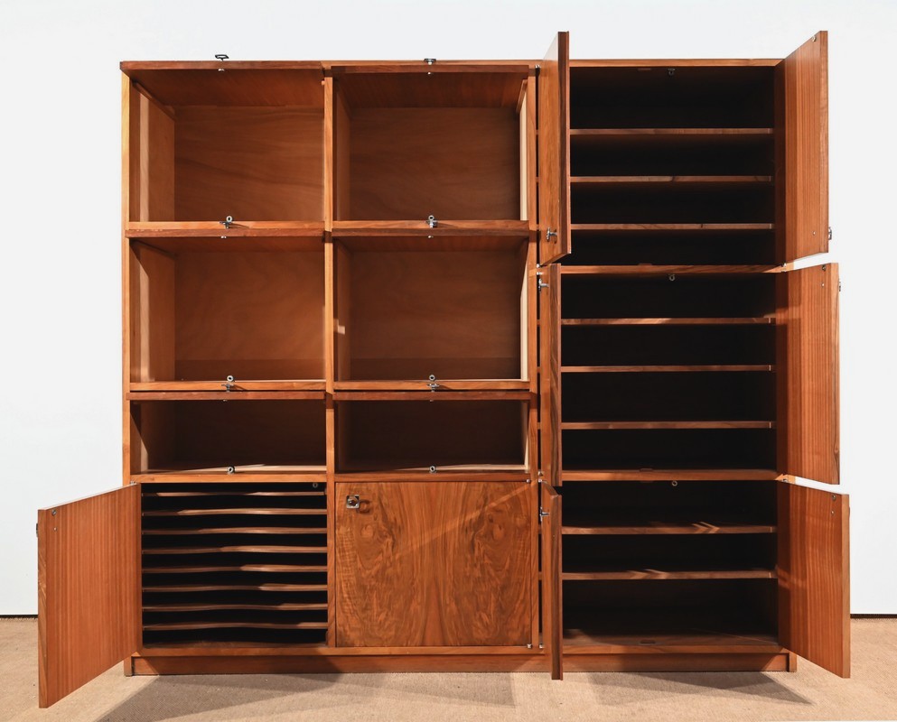 Exceptionnel Meuble de rangement en noyer massif et plaqué, datant des années 1970, présentant onze espaces de rangement derrière des portes, au placage symétrique, dont six sont à bascule, deux sont simples et trois sont doubles. Ces dernières s’ouvrent sur des briquets métalliques déportés. Tous ces ouvrants sont munis de poignées de tirage rectangulaires en métal chromé et comportent un intérieur en placage d’acajou.