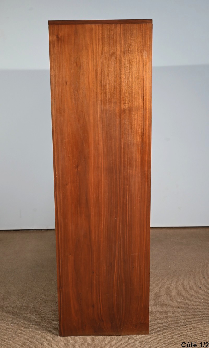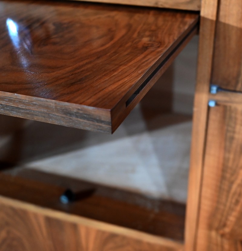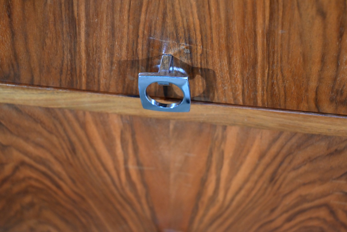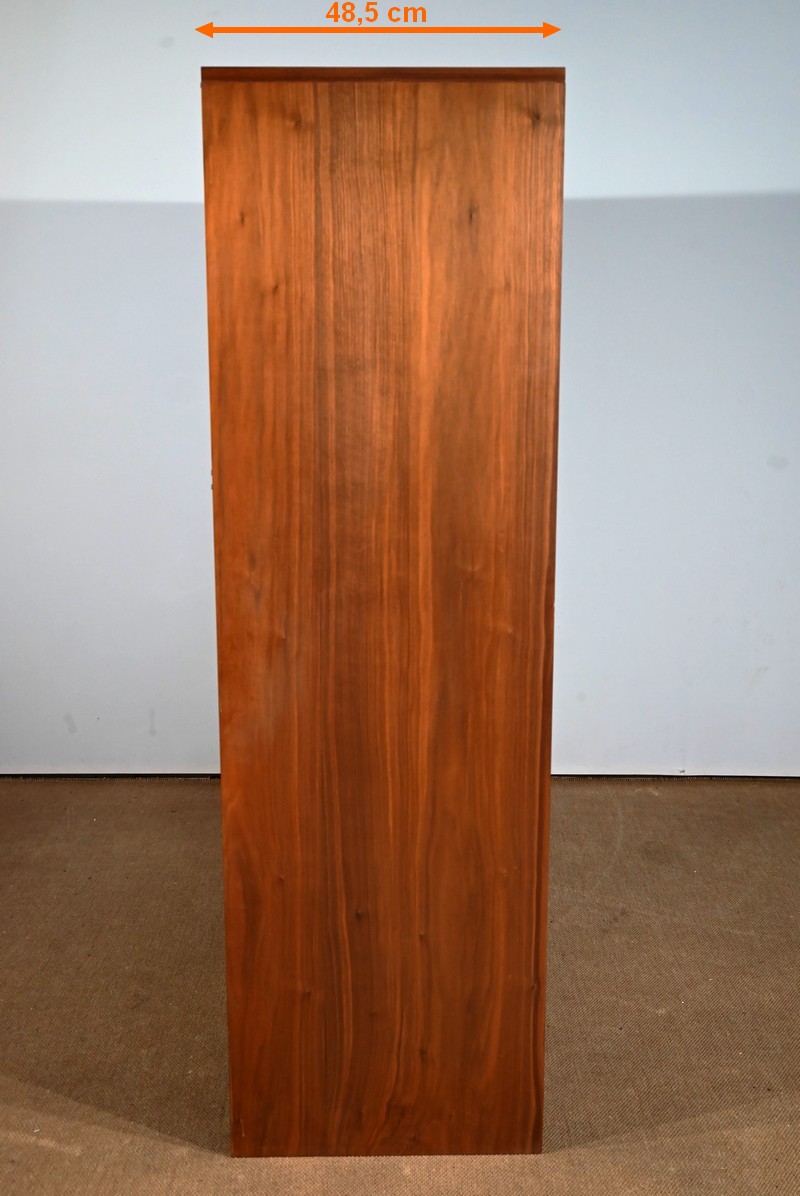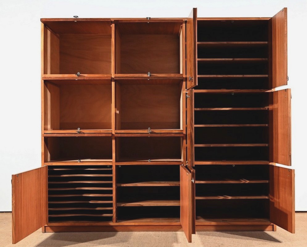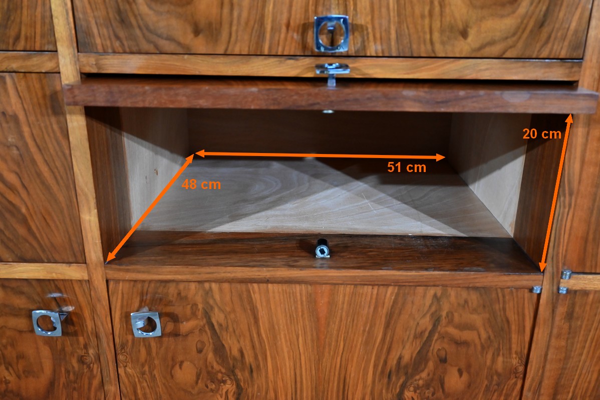 Exceptionnel Meuble de rangement en noyer massif et plaqué, datant des années 1970, présentant onze espaces de rangement derrière des portes, au placage symétrique, dont six sont à bascule, deux sont simples et trois sont doubles. Ces dernières s’ouvrent sur des briquets métalliques déportés. Tous ces ouvrants sont munis de poignées de tirage rectangulaires en métal chromé et comportent un intérieur en placage d’acajou.