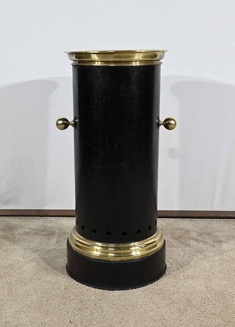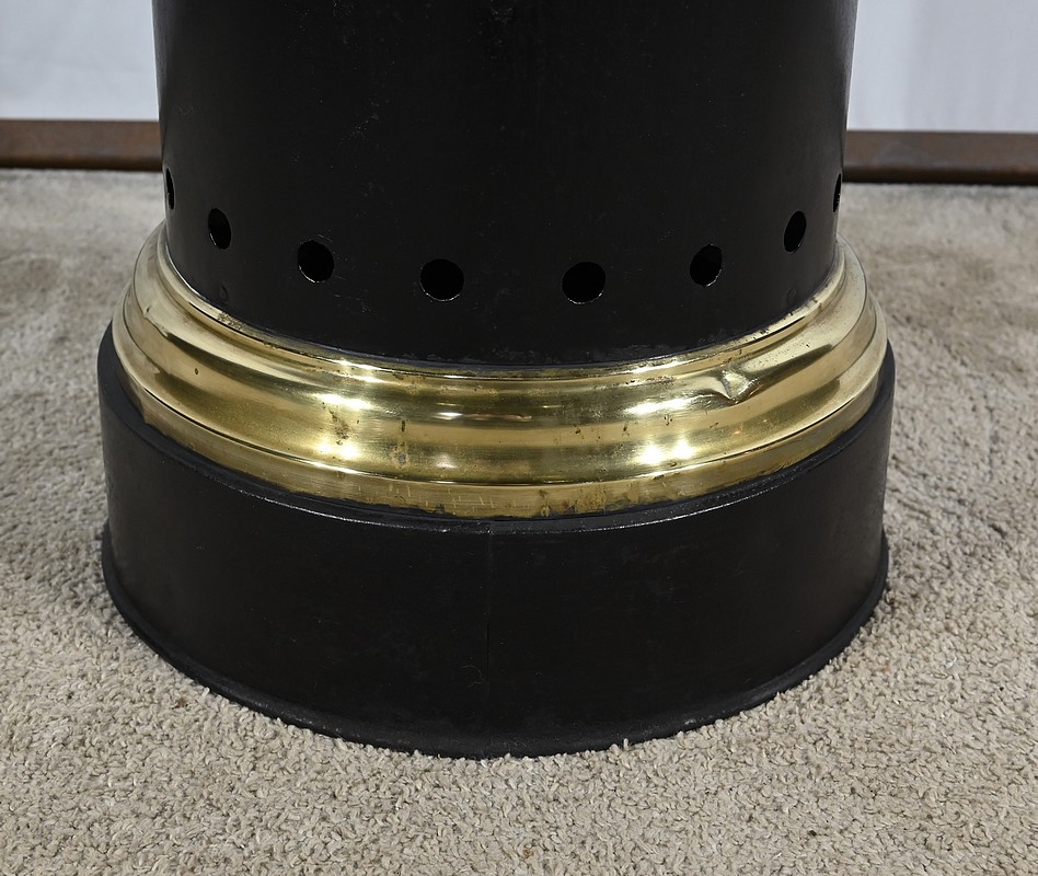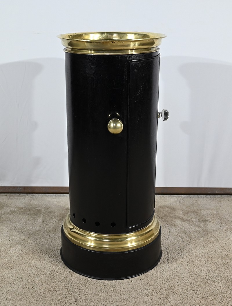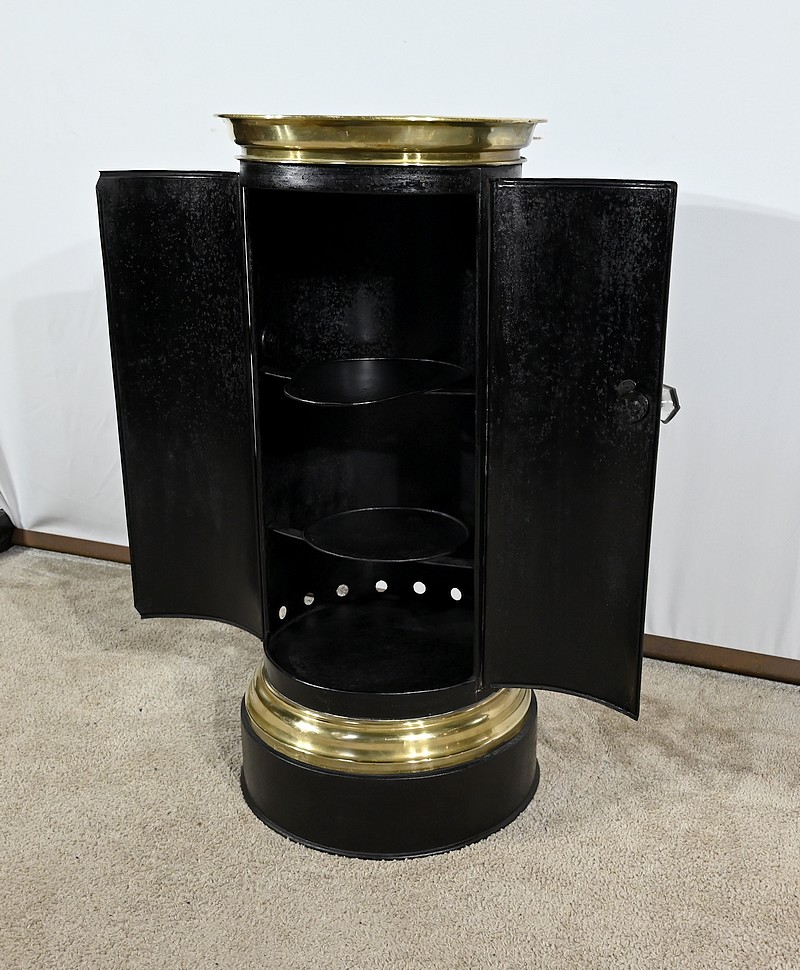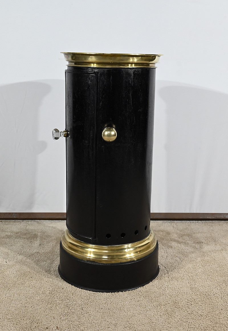 Ce meuble domestique de forme cylindrique s’ouvre par deux portes laissant voir deux étagères. Une très belle poignée en verre taillé agrémente l’une de ces portes. De chaque côté de ce réchaud, une grosse boule en laiton permet le transport. La partie basse est dotée d’une large plinthe moulurée en laiton et la partie haute est ceinte d’une galerie laiton formant cuvette.