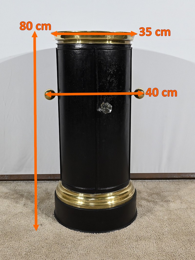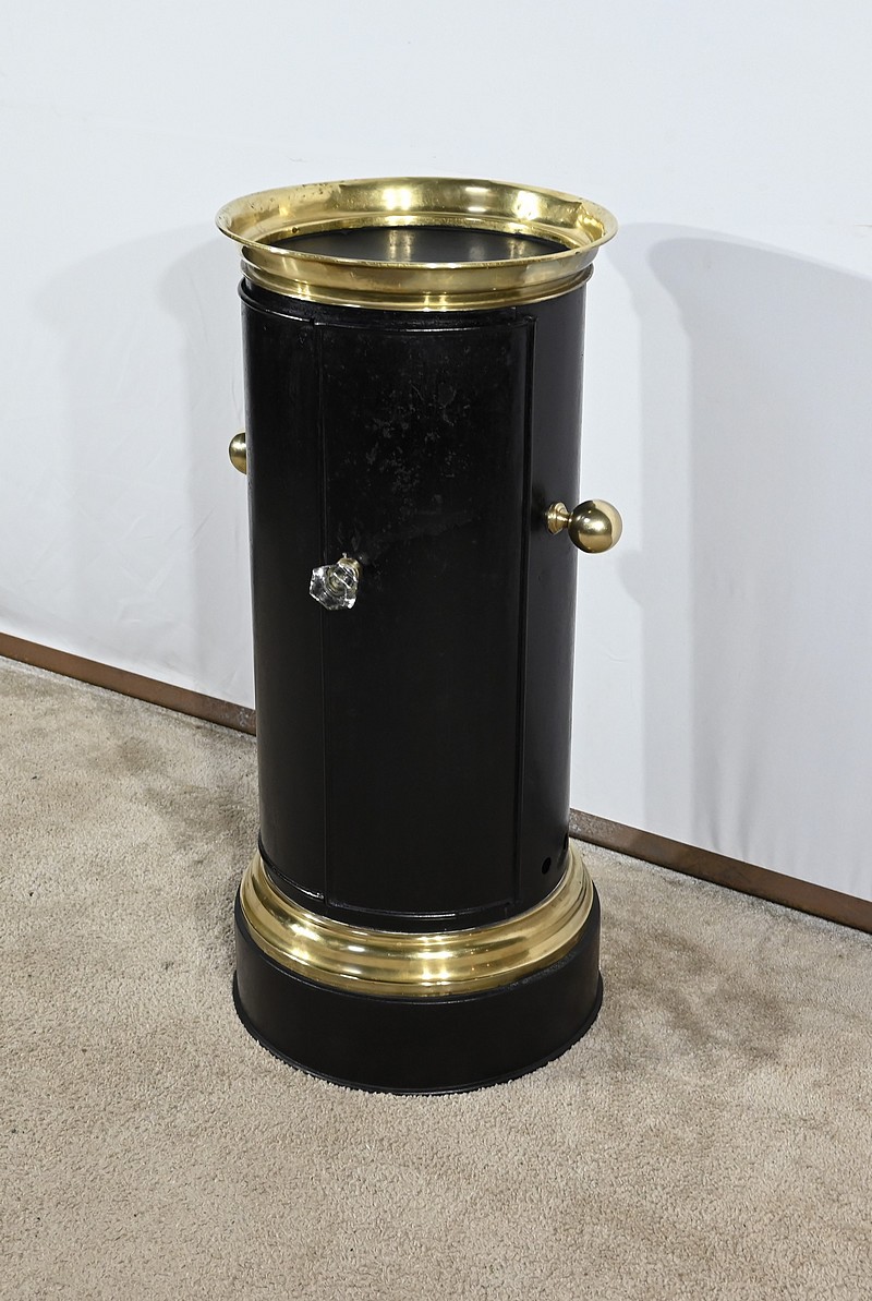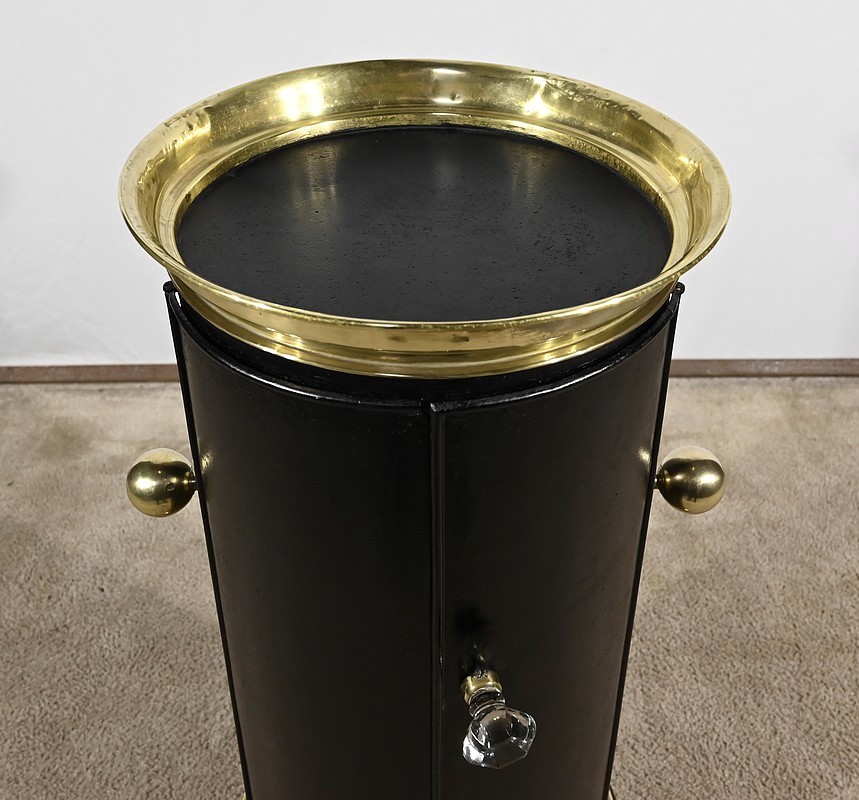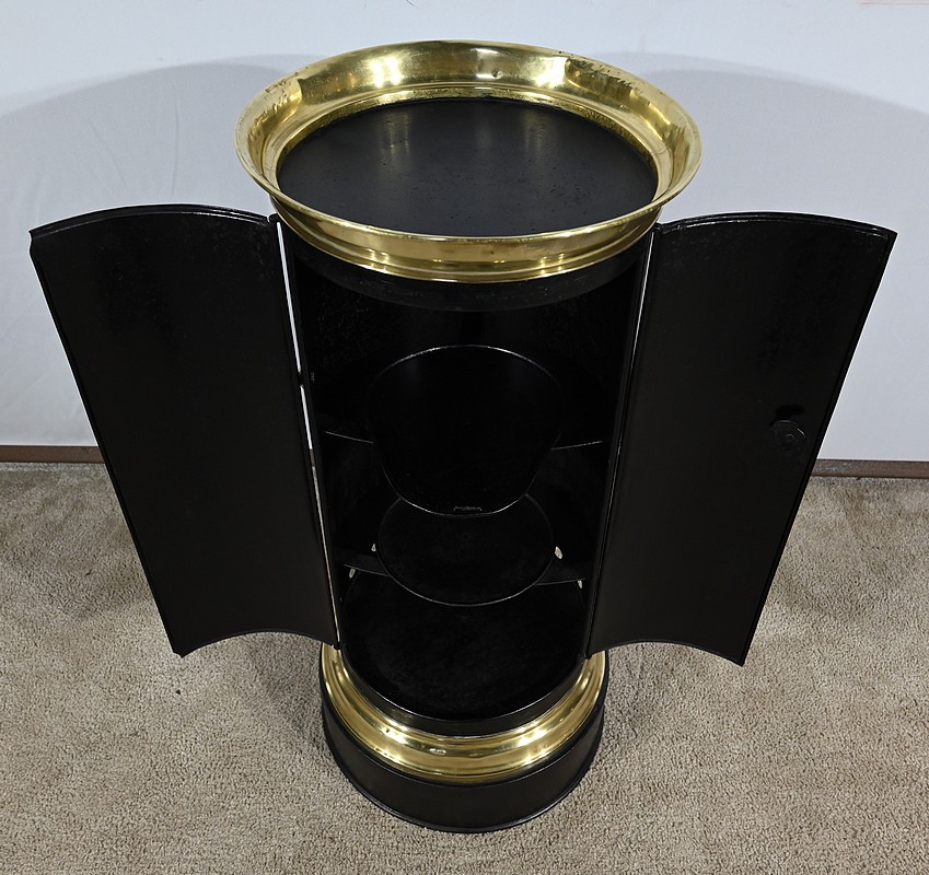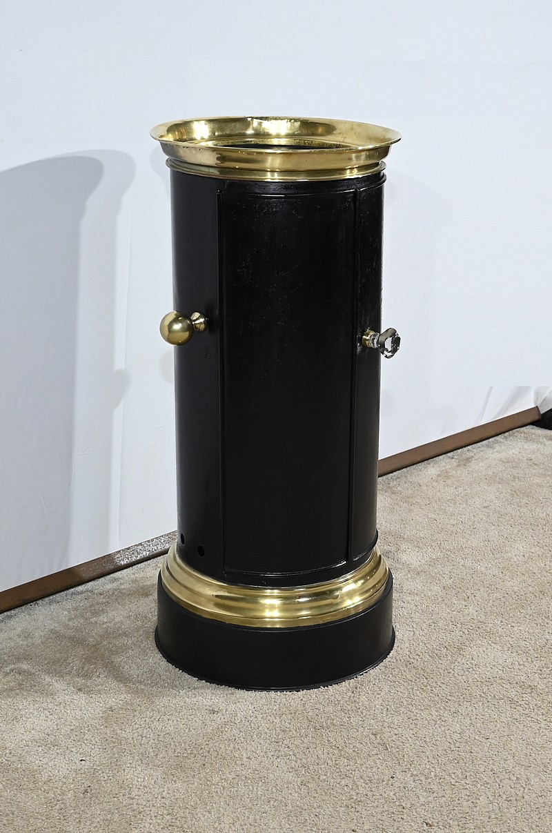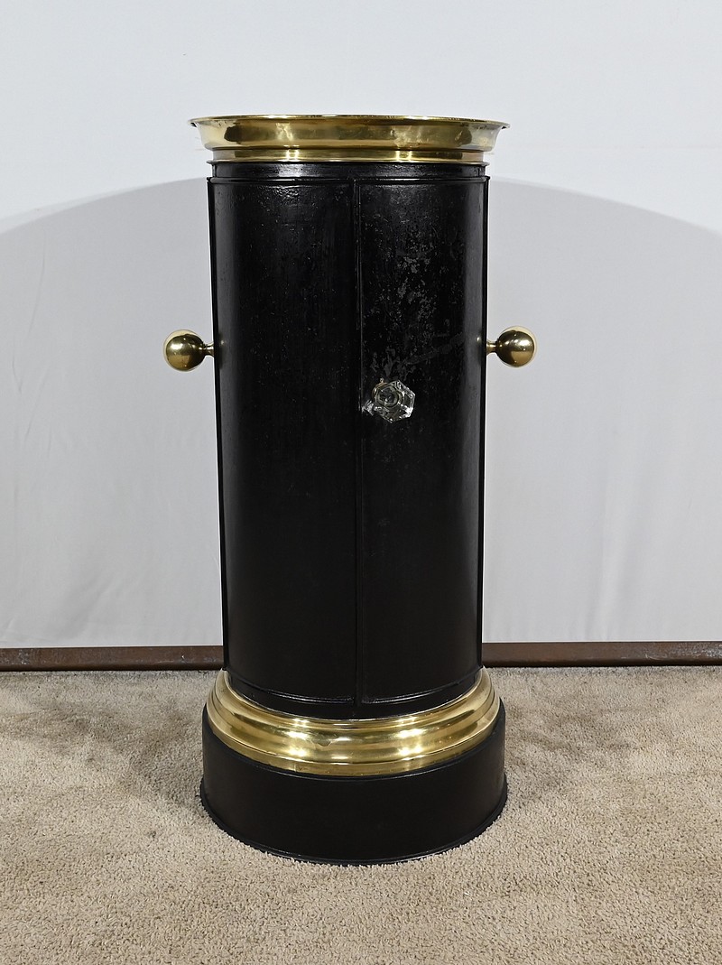 Ce meuble domestique de forme cylindrique s’ouvre par deux portes laissant voir deux étagères. Une très belle poignée en verre taillé agrémente l’une de ces portes. De chaque côté de ce réchaud, une grosse boule en laiton permet le transport. La partie basse est dotée d’une large plinthe moulurée en laiton et la partie haute est ceinte d’une galerie laiton formant cuvette.