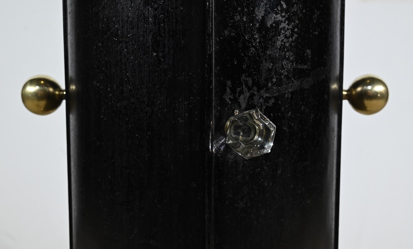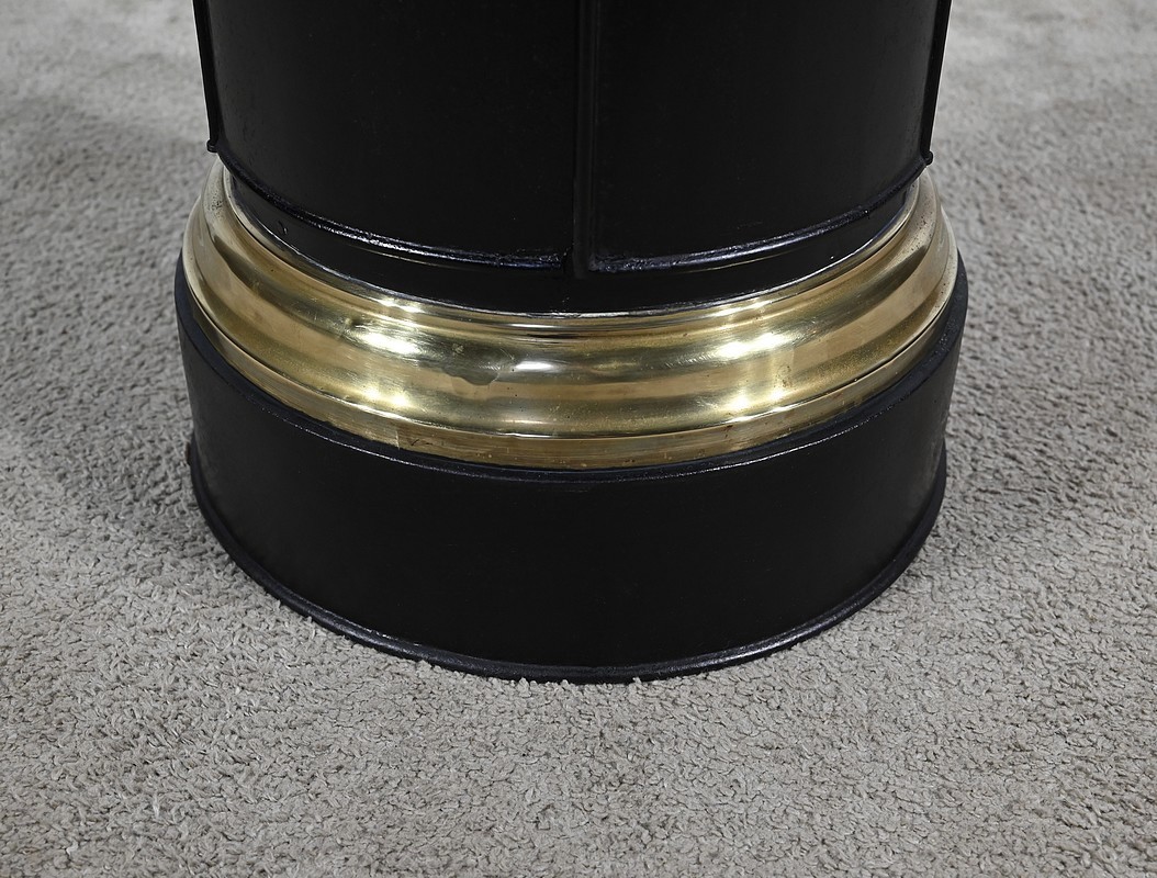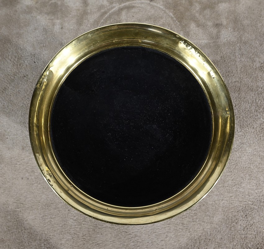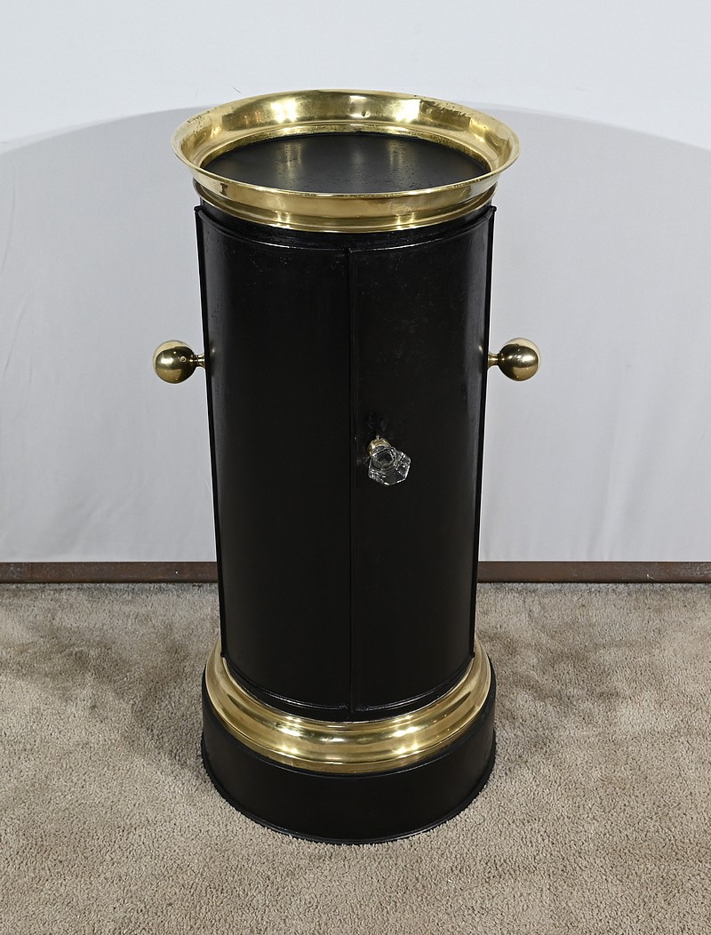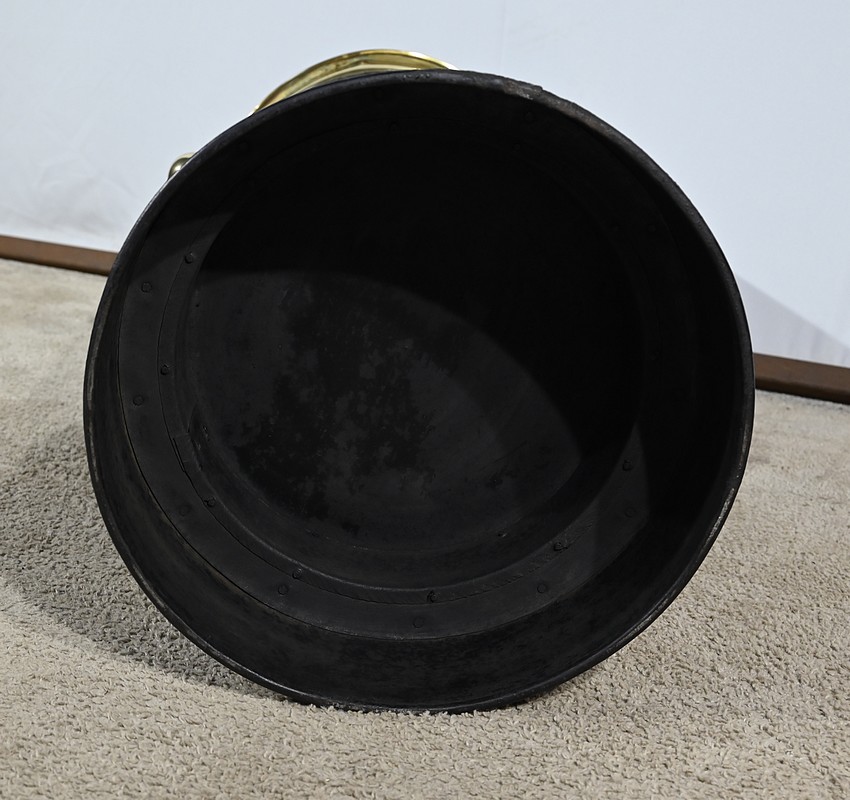 Ce meuble domestique de forme cylindrique s’ouvre par deux portes laissant voir deux étagères. Une très belle poignée en verre taillé agrémente l’une de ces portes. De chaque côté de ce réchaud, une grosse boule en laiton permet le transport. La partie basse est dotée d’une large plinthe moulurée en laiton et la partie haute est ceinte d’une galerie laiton formant cuvette.