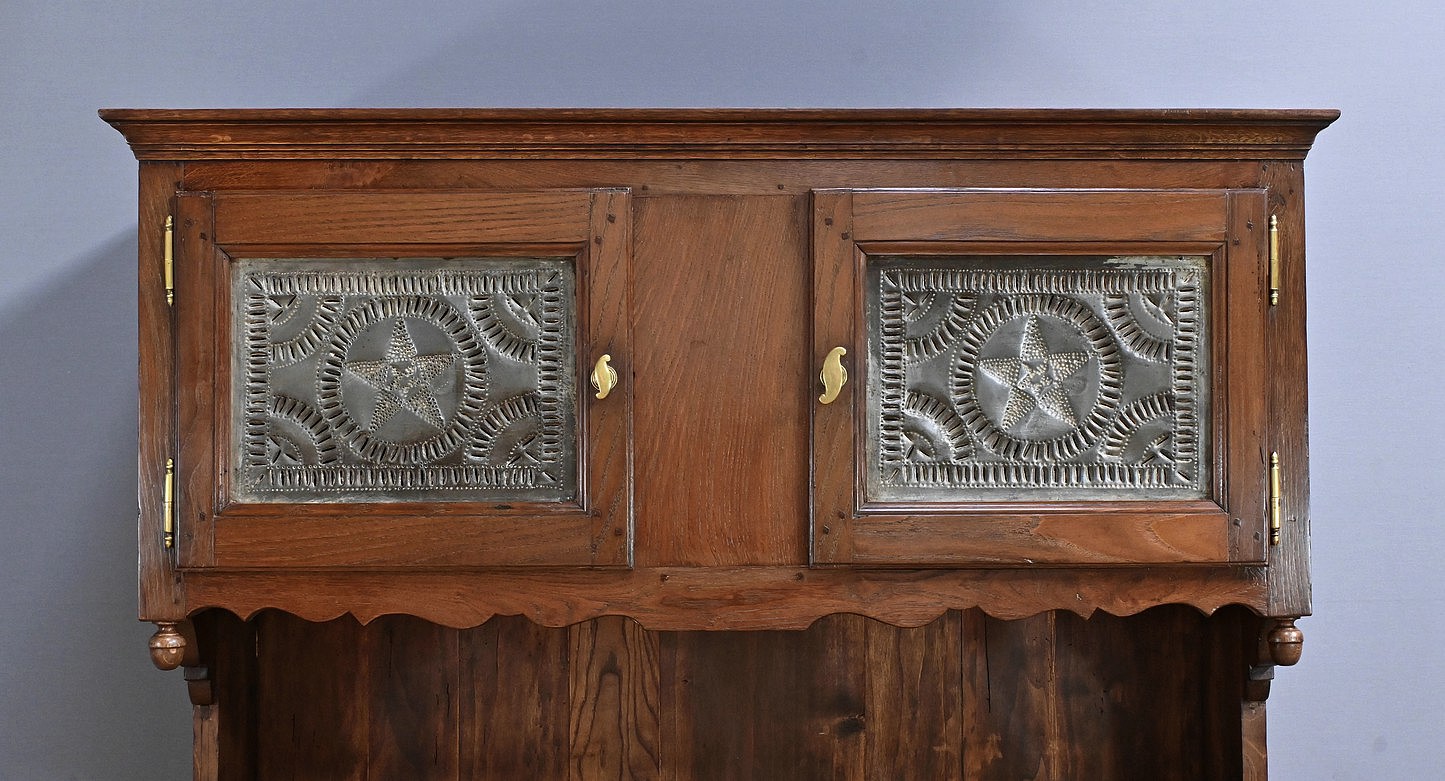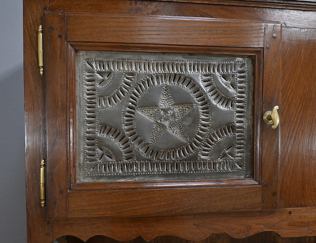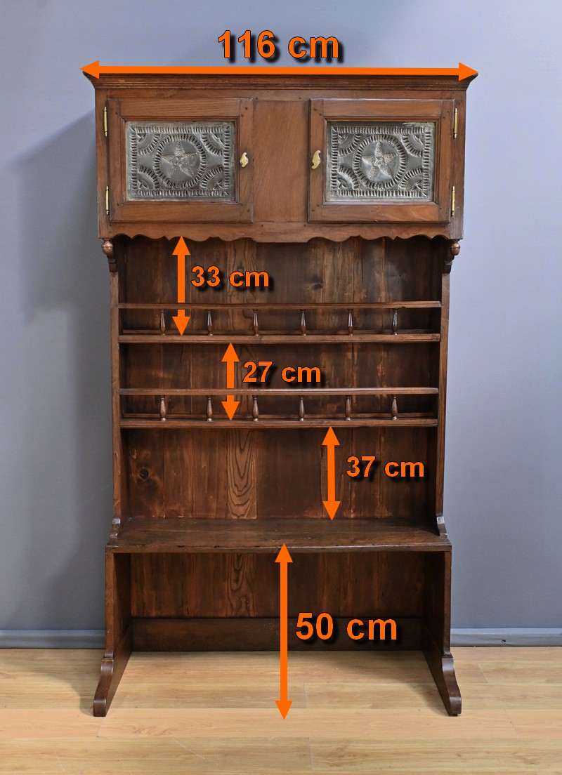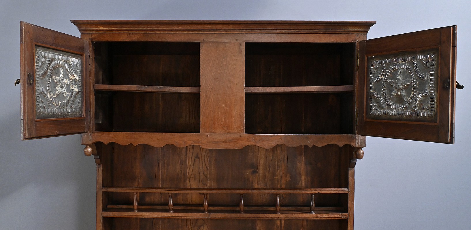 Ce vaisselier normand en chêne massif, datant de la deuxième moitié du XIXe siècle, allie la robustesse et le charme des meubles d’antan. Ce dressoir régional ouvre par deux portes agrémentées de tôle perforée figurant des étoiles entourées de formes géométriques. Ces portes pivotent sur des gonds en laiton et sont équipées de poignées mouvementées en laiton doré également. Dessous, une traverse découpée est accompagnée de toupies à chaque extrémité. La partie centrale du meuble présente deux étagères avec petites balustres et en partie inférieure nous retrouvons une large étagère de rangement.