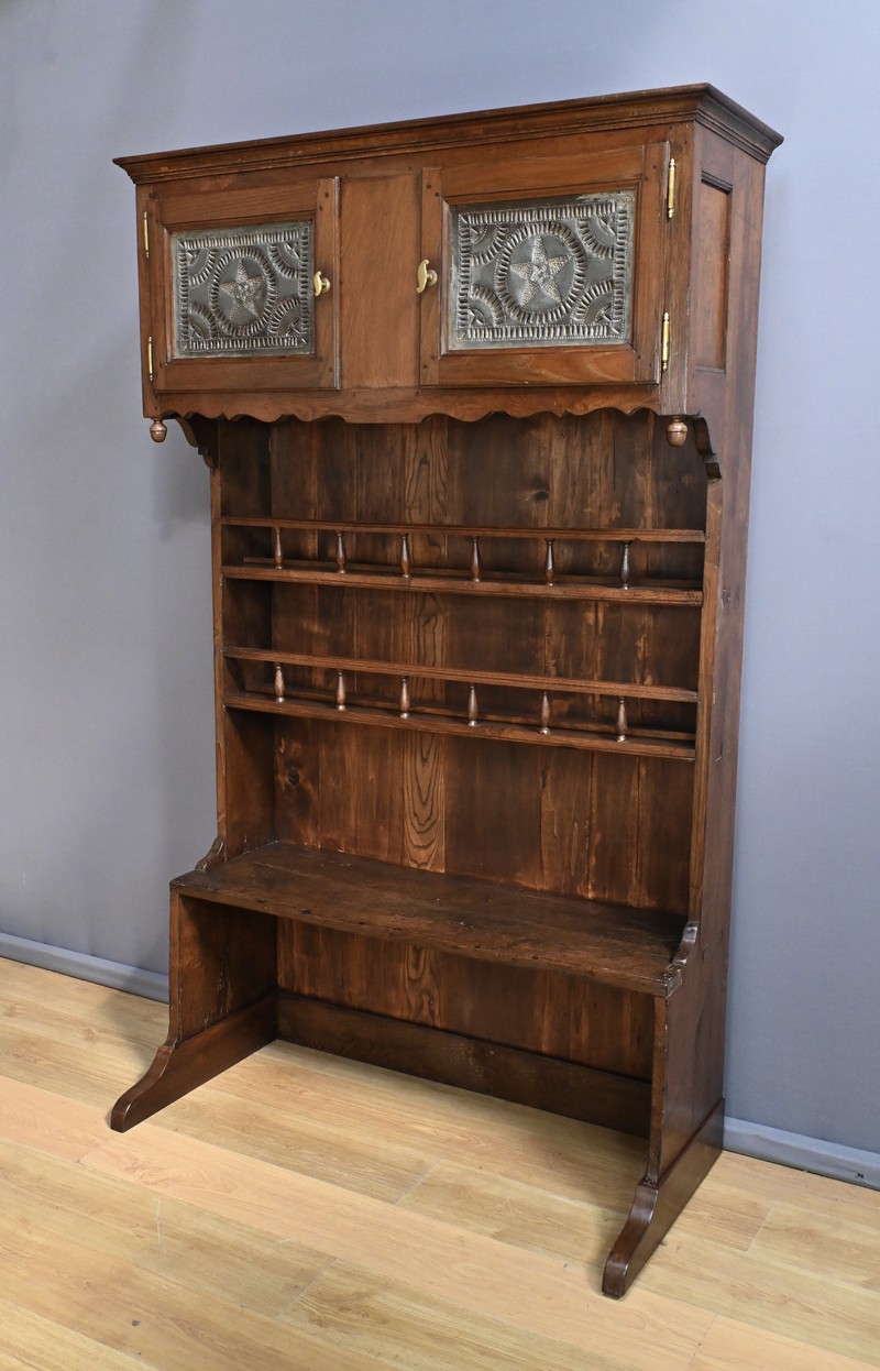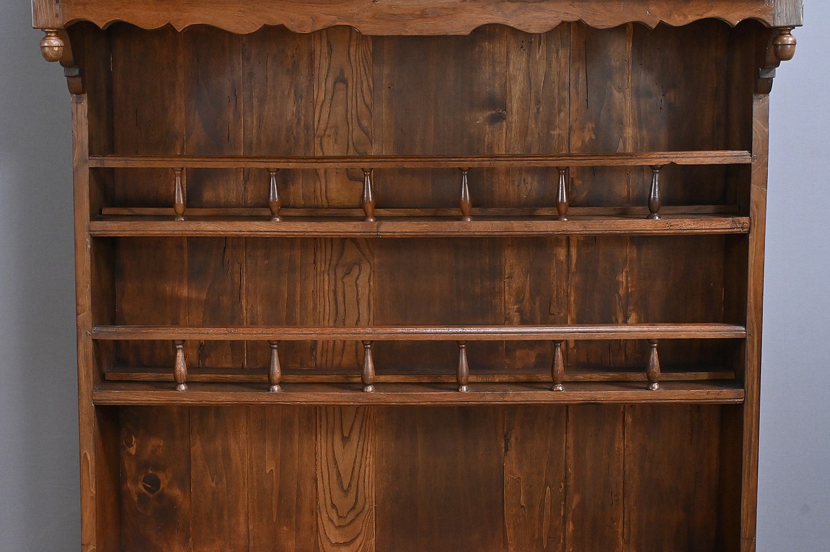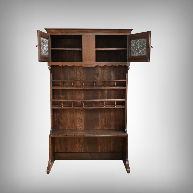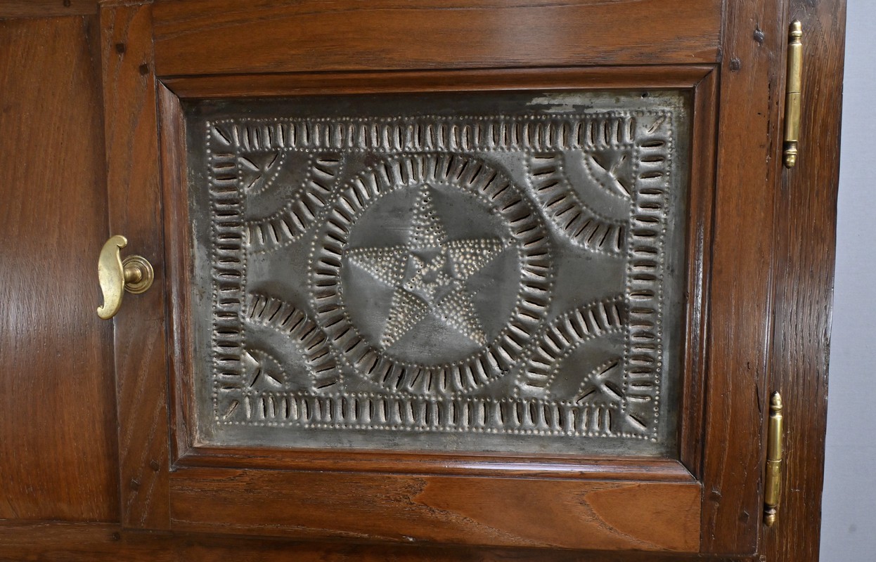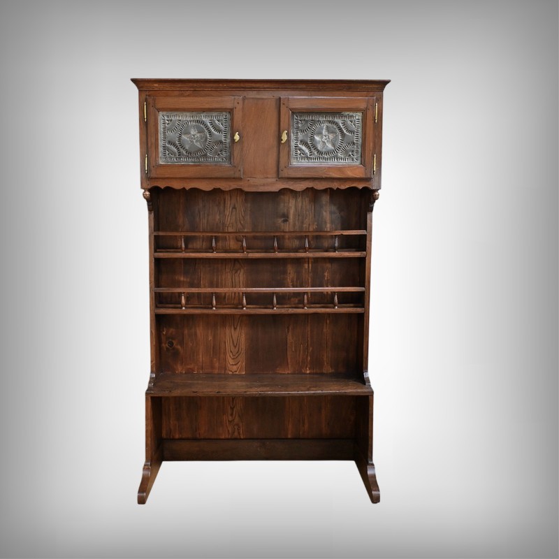 Ce vaisselier normand en chêne massif, datant de la deuxième moitié du XIXe siècle, allie la robustesse et le charme des meubles d’antan. Ce dressoir régional ouvre par deux portes agrémentées de tôle perforée figurant des étoiles entourées de formes géométriques. Ces portes pivotent sur des gonds en laiton et sont équipées de poignées mouvementées en laiton doré également. Dessous, une traverse découpée est accompagnée de toupies à chaque extrémité. La partie centrale du meuble présente deux étagères avec petites balustres et en partie inférieure nous retrouvons une large étagère de rangement.