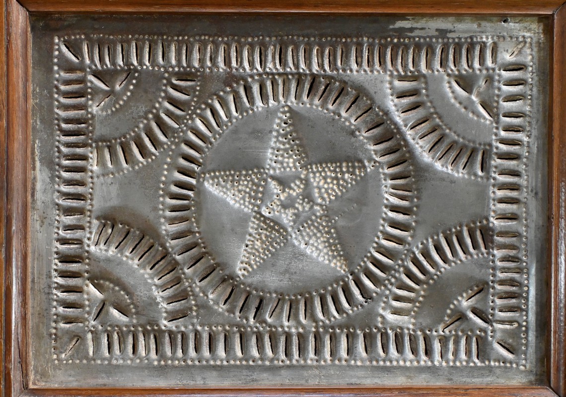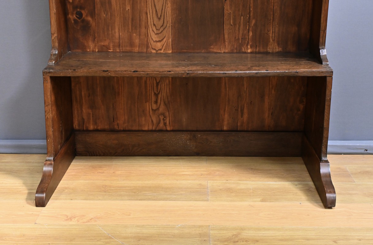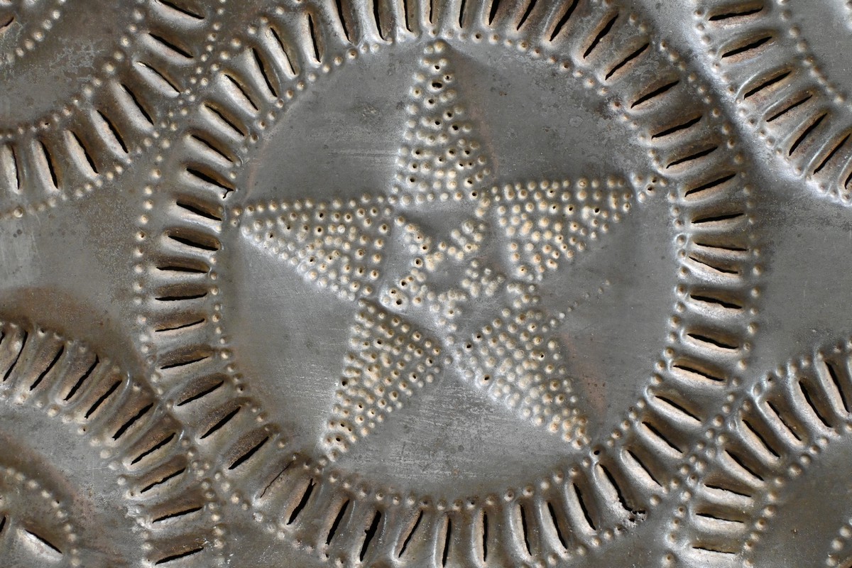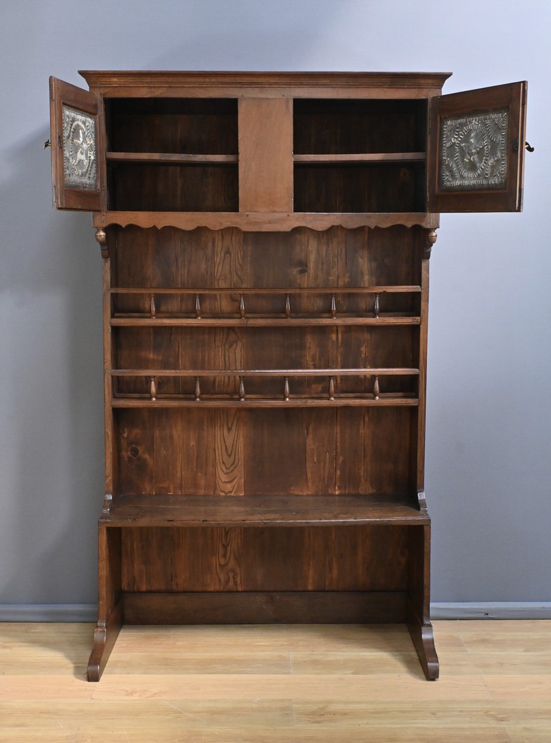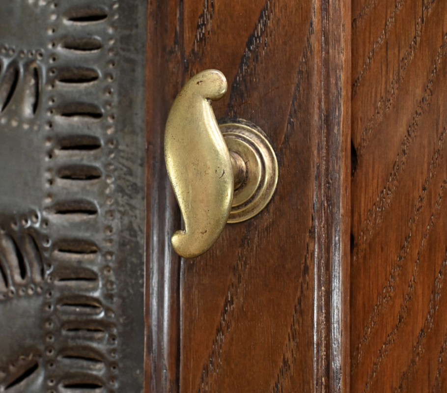 Ce vaisselier normand en chêne massif, datant de la deuxième moitié du XIXe siècle, allie la robustesse et le charme des meubles d’antan. Ce dressoir régional ouvre par deux portes agrémentées de tôle perforée figurant des étoiles entourées de formes géométriques. Ces portes pivotent sur des gonds en laiton et sont équipées de poignées mouvementées en laiton doré également. Dessous, une traverse découpée est accompagnée de toupies à chaque extrémité. La partie centrale du meuble présente deux étagères avec petites balustres et en partie inférieure nous retrouvons une large étagère de rangement.