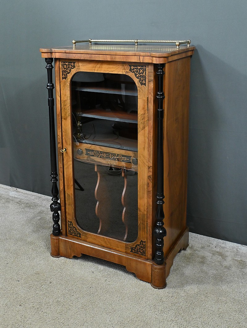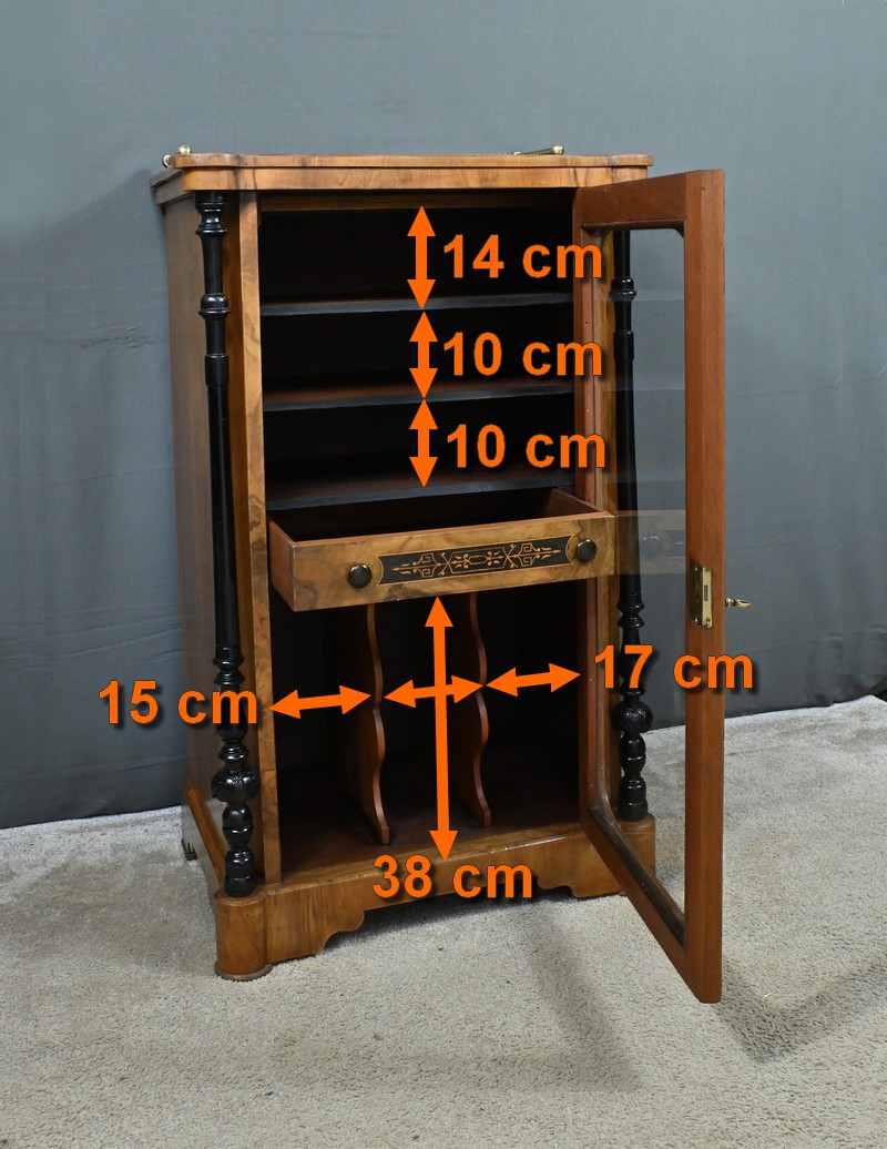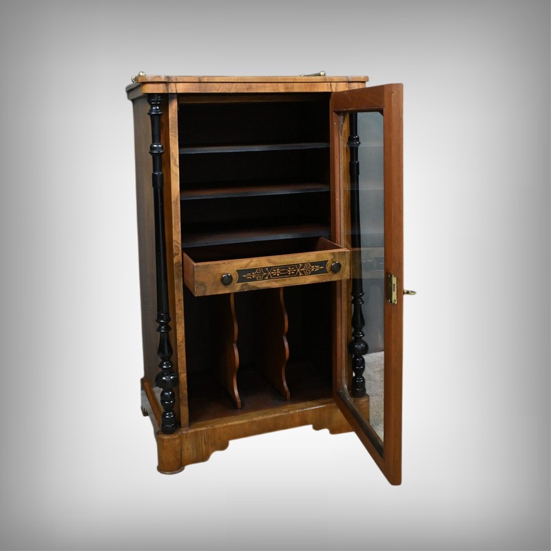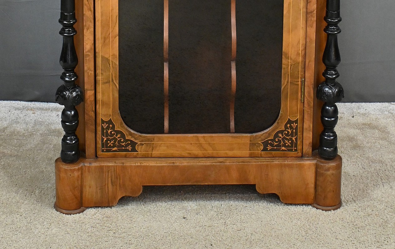 Ce cabinet de musique vitré, réalisé en ronce de noyer et agrémenté de marqueterie de rinceaux, incarne l’élégance du style Charles X.