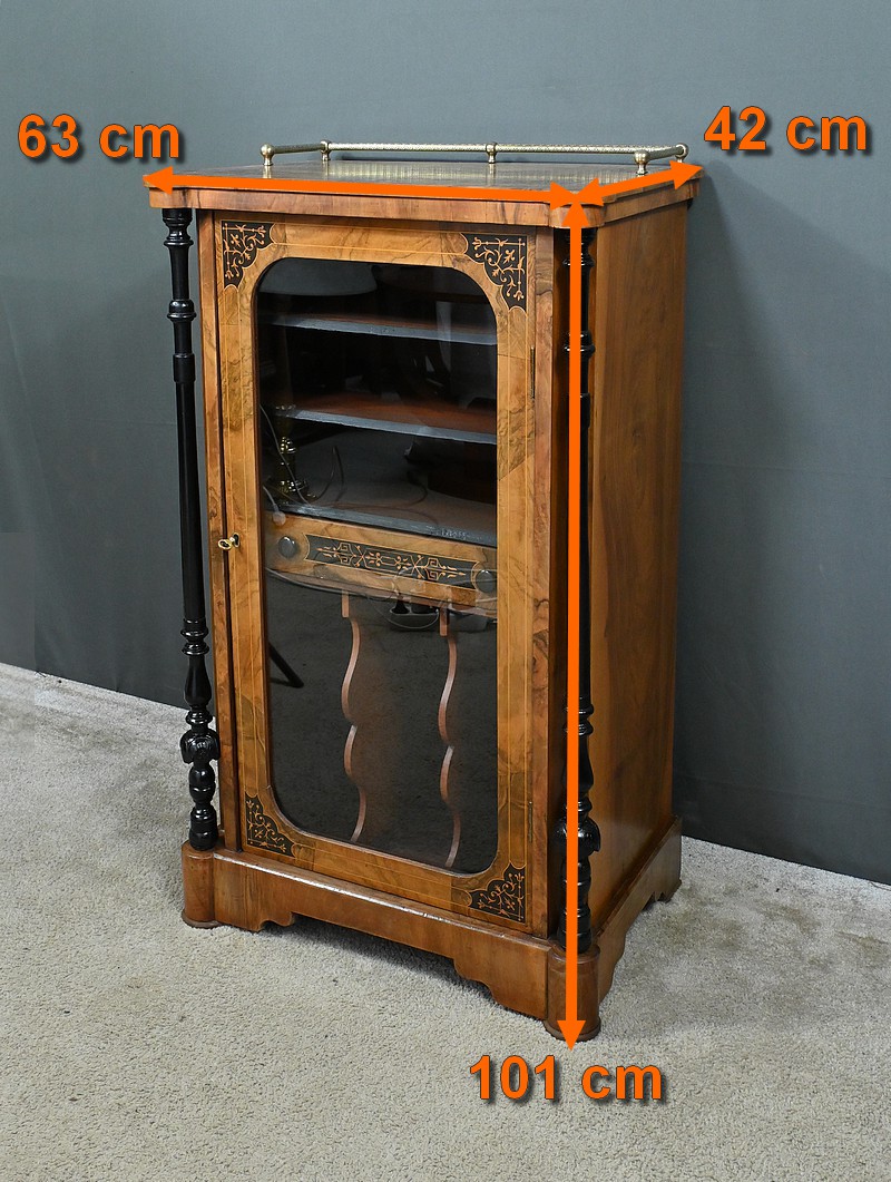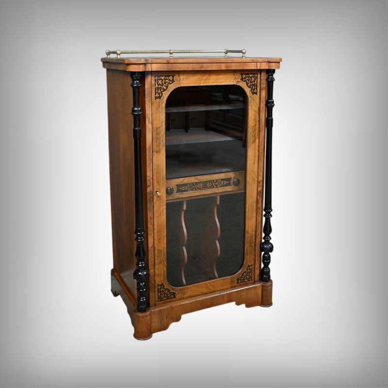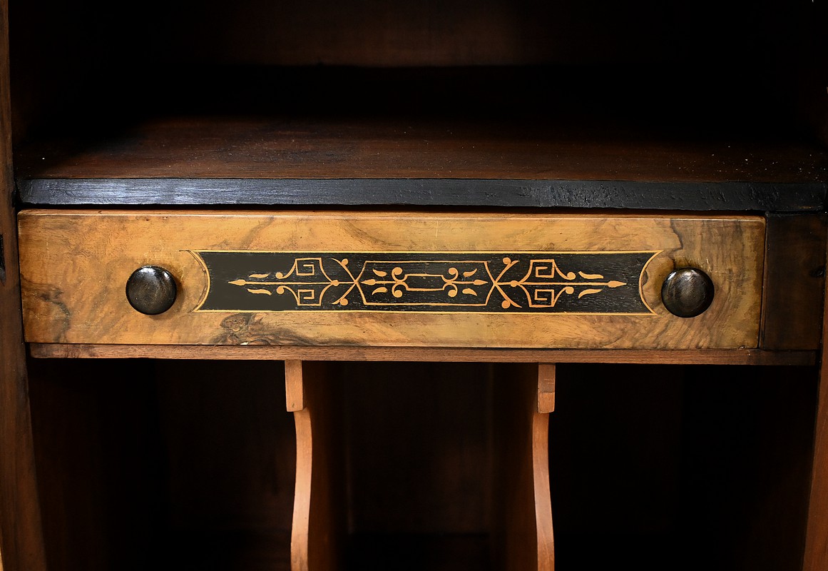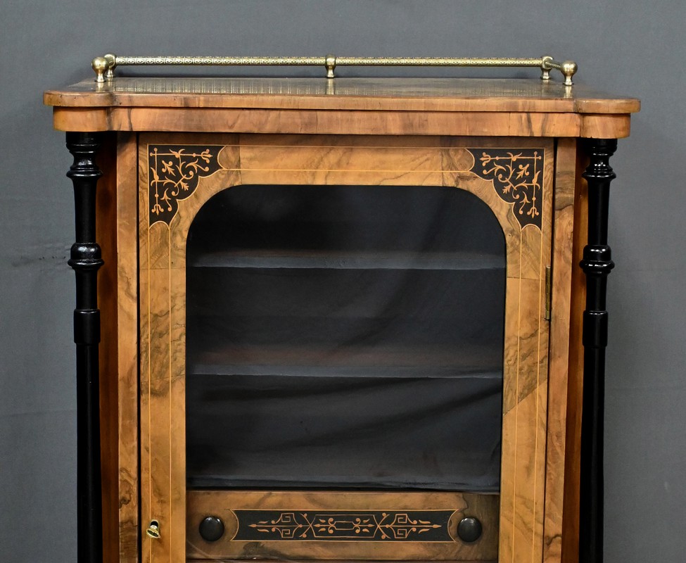 Ce cabinet de musique vitré, réalisé en ronce de noyer et agrémenté de marqueterie de rinceaux, incarne l’élégance du style Charles X.